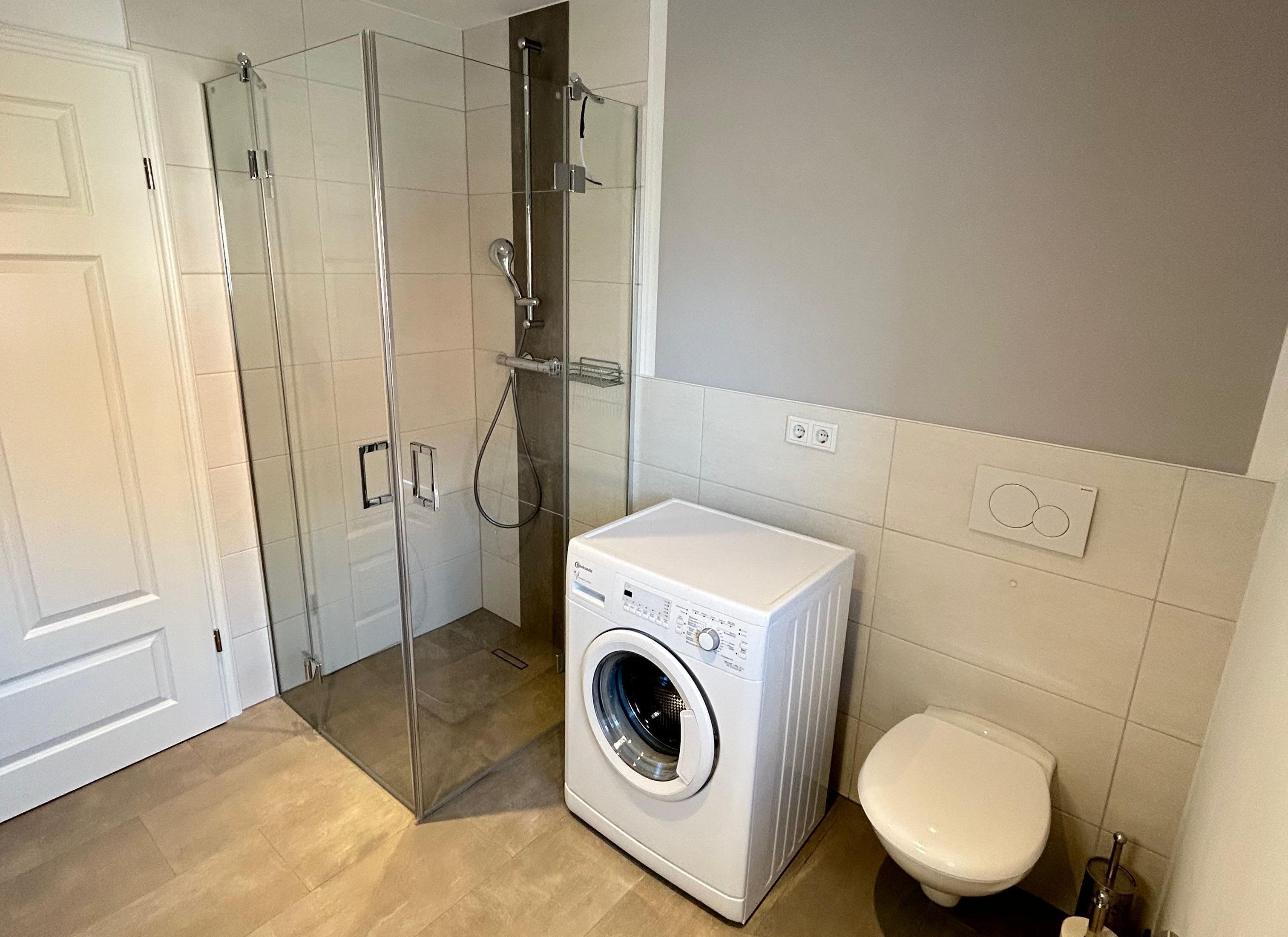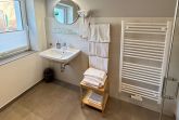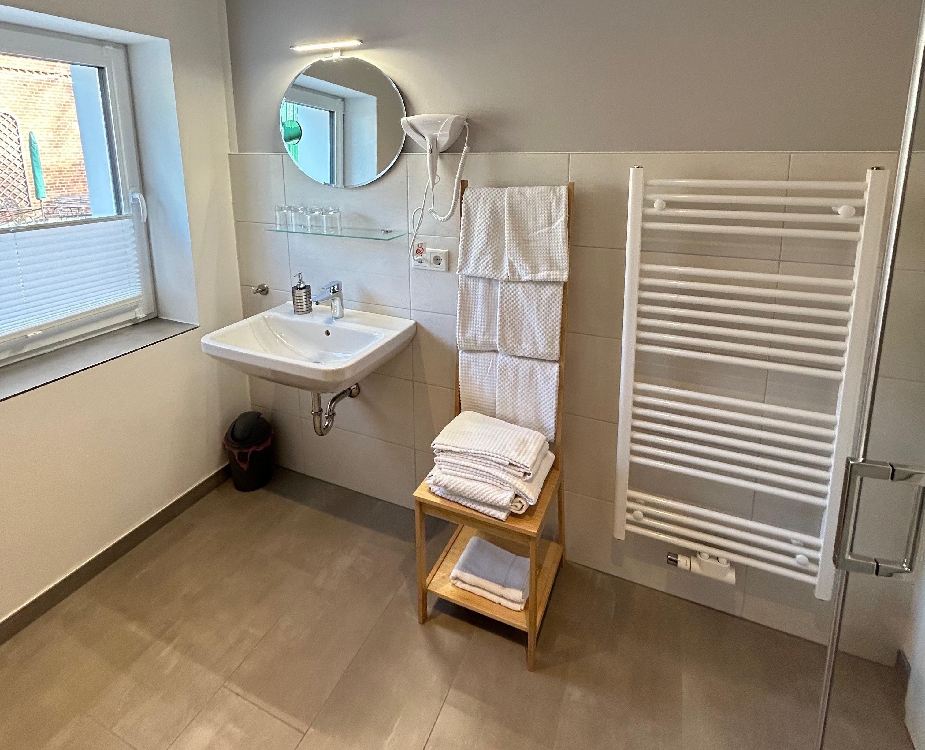 • Badezimmer mit bodengleicher Dusche und Handtuchheizkörper; Handtücher inklusive