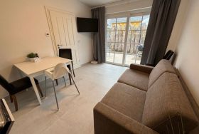Wohnzimmer mit Schlafsofa (160 x 200), TV und voll ausgestatteter Küchenzeile