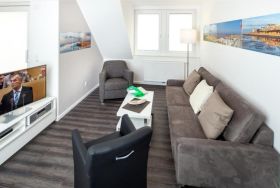 Sehr schöne, moderne 3-Raum-Wohnung bis 4 Pers über zwei Etagen (67m²), 2.Etage, 2 Schlafzimmer mit Doppelbetten, Wohnzimmer mit großer Küchenzeile (Back., Mikrow., Geschirrspüler), 2x Du/WC, 2xSAT-TV, Blue-Ray, CD-Radio, W-LAN kostenlos, großer Westbalkon mit Balkonmöbeln und Sonnenschirm (saisonabhängig), reservierter Pkw-Stellplatz vor dem Haus, keine Haustiere erlaubt, Nichtraucher.