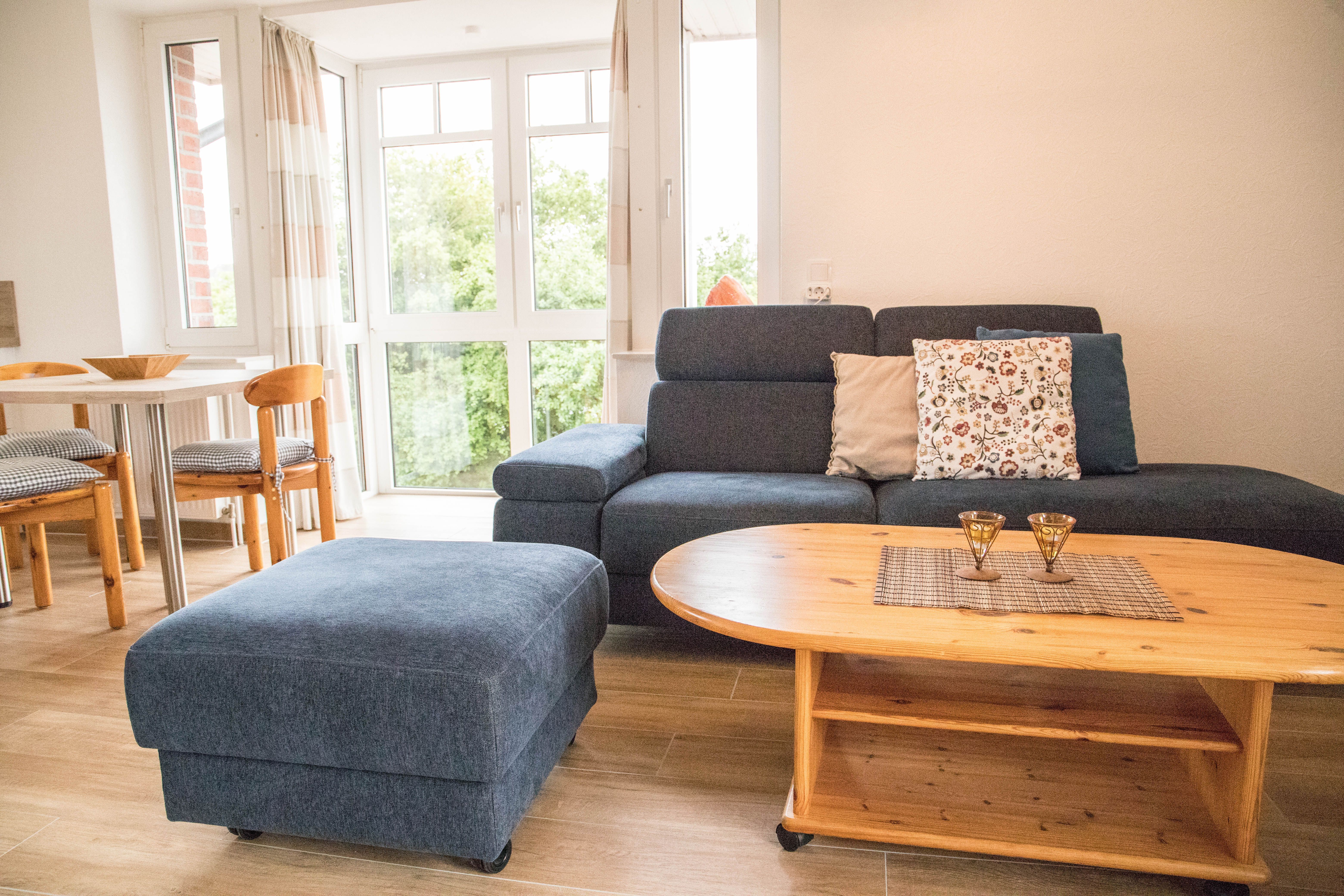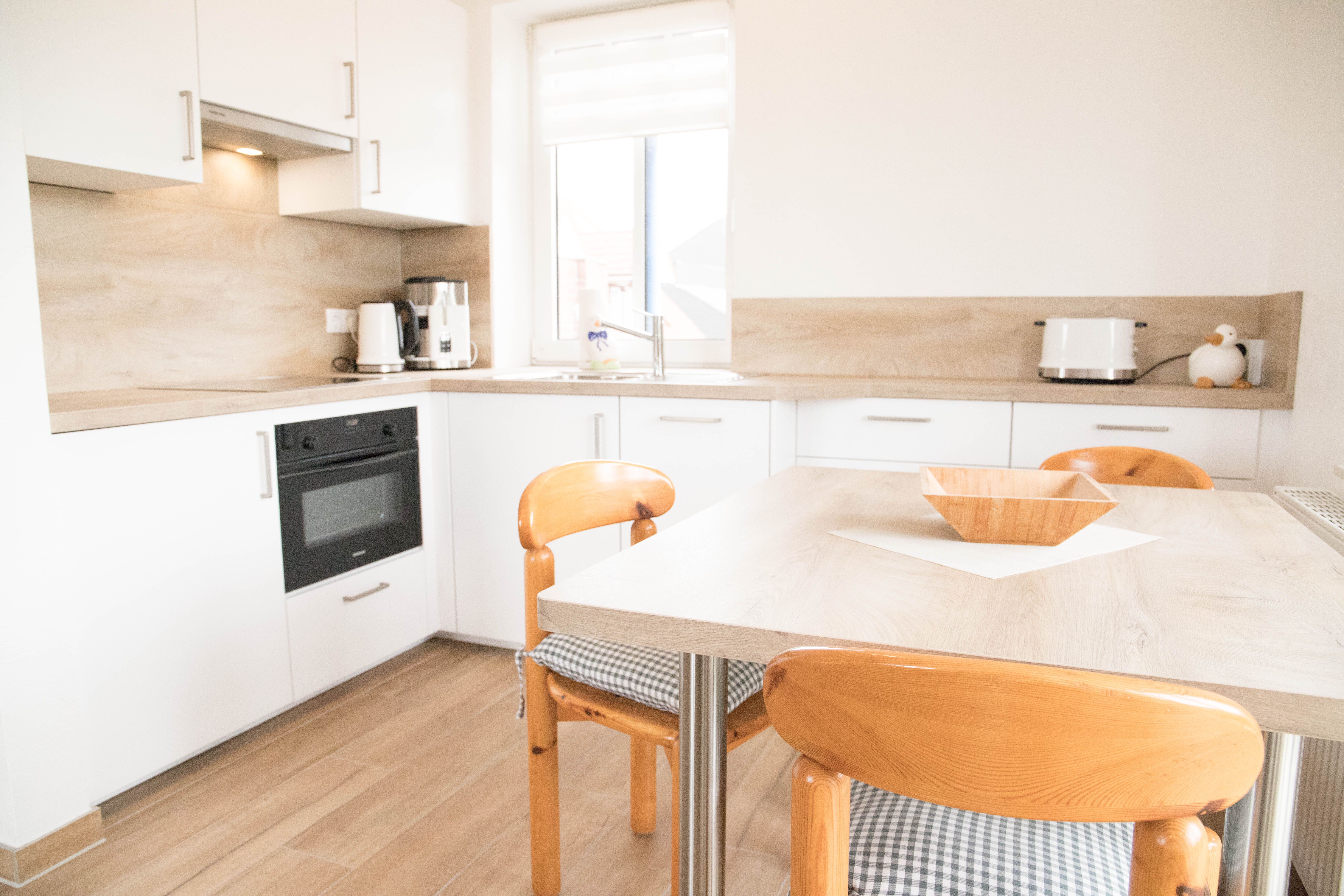 In der unteren Etage gelangen Sie über den Flur in einen großen Wohnraum, mit gemütlichem Sofa, einer komplett ausgestatteten modernen Küche mit 4 Plattenkochfeld, Backofen, Geschirrspüler Kühlschrank mit zusätzlicher Gefriermöglichkeit, Toaster, Wasserkocher und Kaffeemaschine.