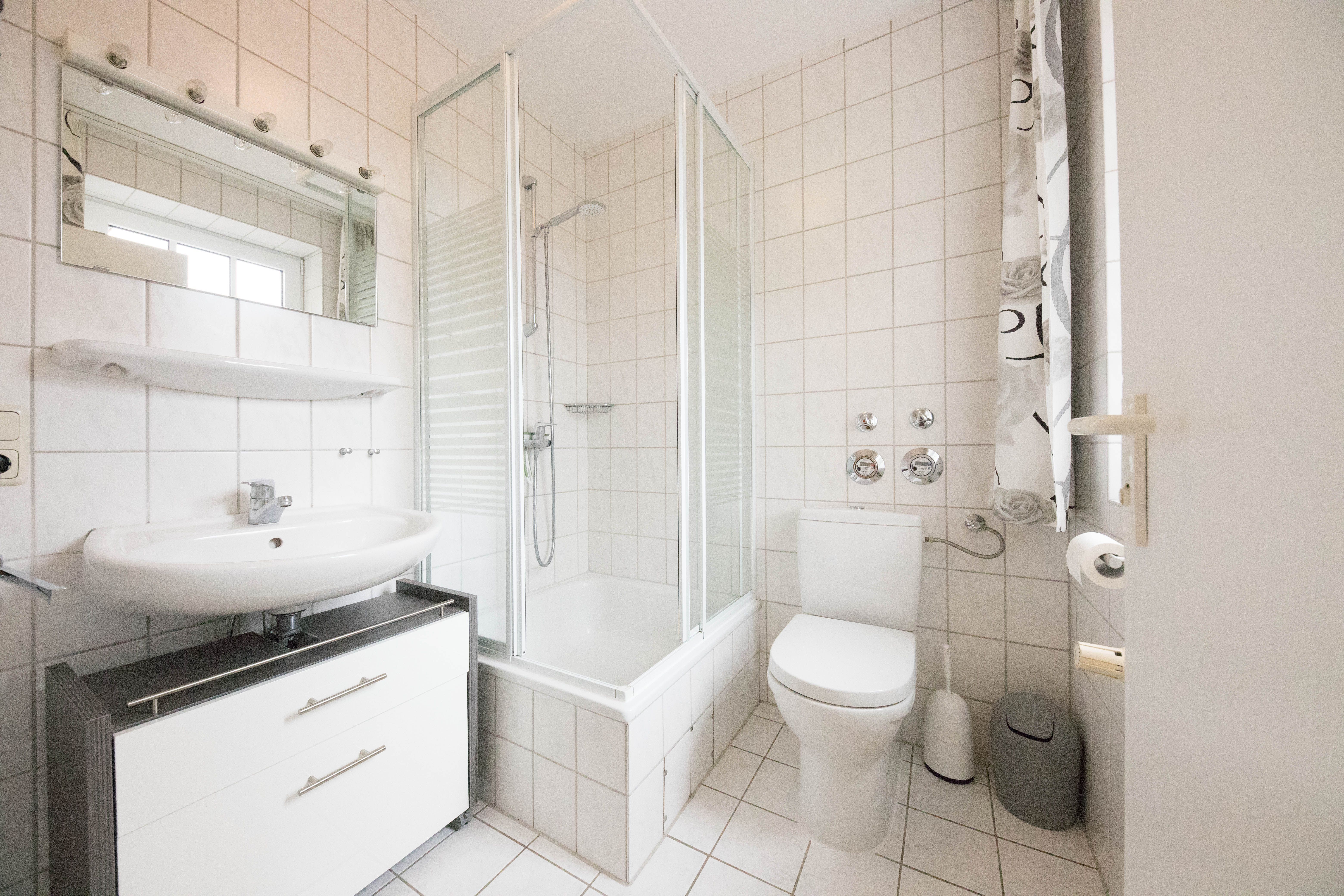 Das Tageslichtbadezimmer mit Dusche und WC befindet sich ebenfalls im unteren Bereich der Maisonettewohnung.