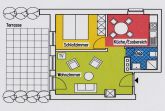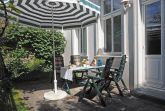 Gemütliche mit 4-DTV-Sternen zertifizierte Ferienwohnung für 2 Personen (2 Aufbettungen möglich) im Erdgeschoss (40 m²) mit Ausgang zur Terrasse in Südlage, Wohnzimmer mit Doppel-Schlafcouch (140 x 190 cm) , 32'' Sat-TV, Mini-HiFi-Anlage mit CD-Player, Internet VDSL / W-LAN, Safe im Schrank, Wohnküche mit Essplatz, Geschirrspüler, Schlafzimmer mit Doppelbett (Liegefläche 160 x 200 cm), Duschbad (superflache Dusche)