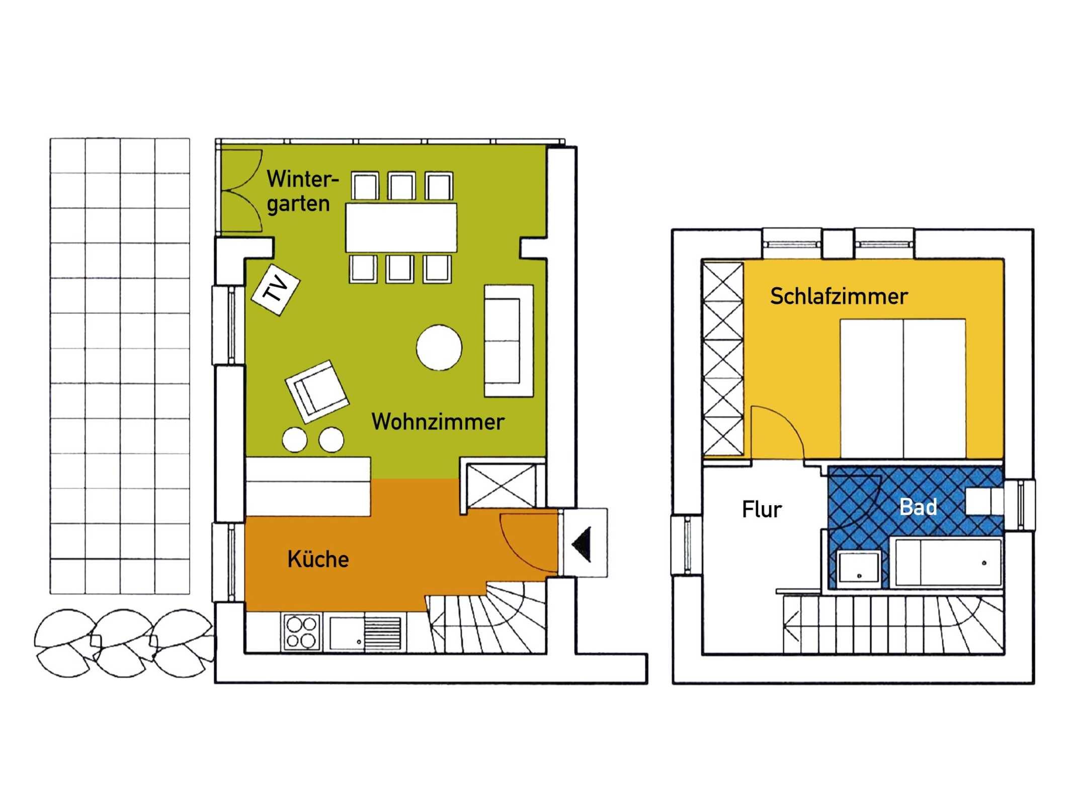 Gemütliche mit 4-DTV-Sternen zertifizierte Ferienwohnung für 2 Personen (2 Aufbettungen möglich) im Nebengebäude (56m²) mit separatem eigenen Eingang vom Hof, Gartenteil mit Liegewiese, Ausgang zur Terrasse in Südlage, Wintergarten mit Essplatz und Wohnbereich mit Doppel-Schlafcouch (140 x 190 cm) , 32'' Sat- TV, Mini-HiFi-Anlage mit CD-Player, Internet VDSL / W-LAN, Safe im Schrank, Wohnküche im Erdgeschoss, Geschirrspüler, Schlafzimmer mit Doppelbett (Liegefläche 180 x 200 cm), Bad mit Badewanne im Obergeschoss.
