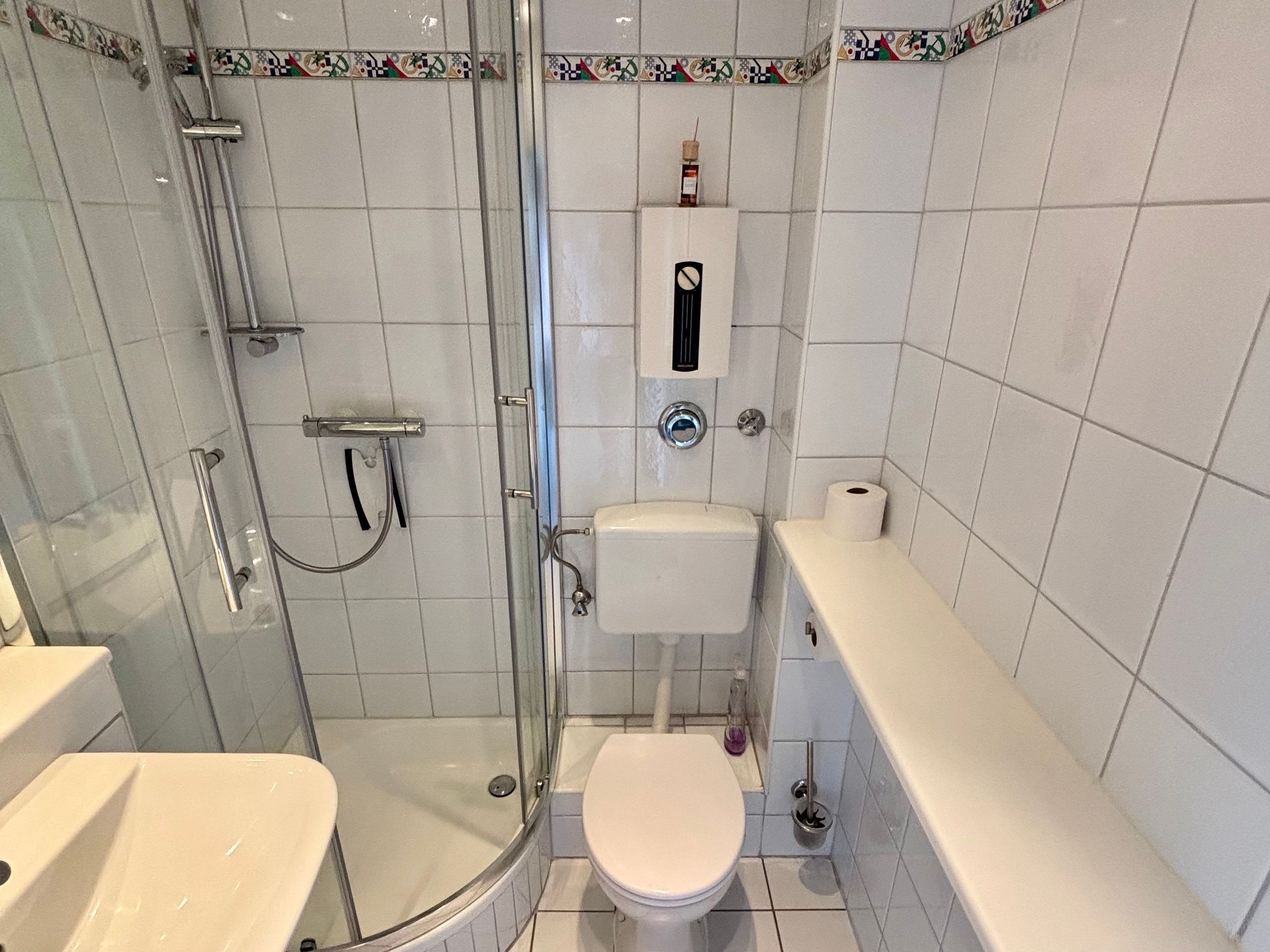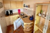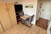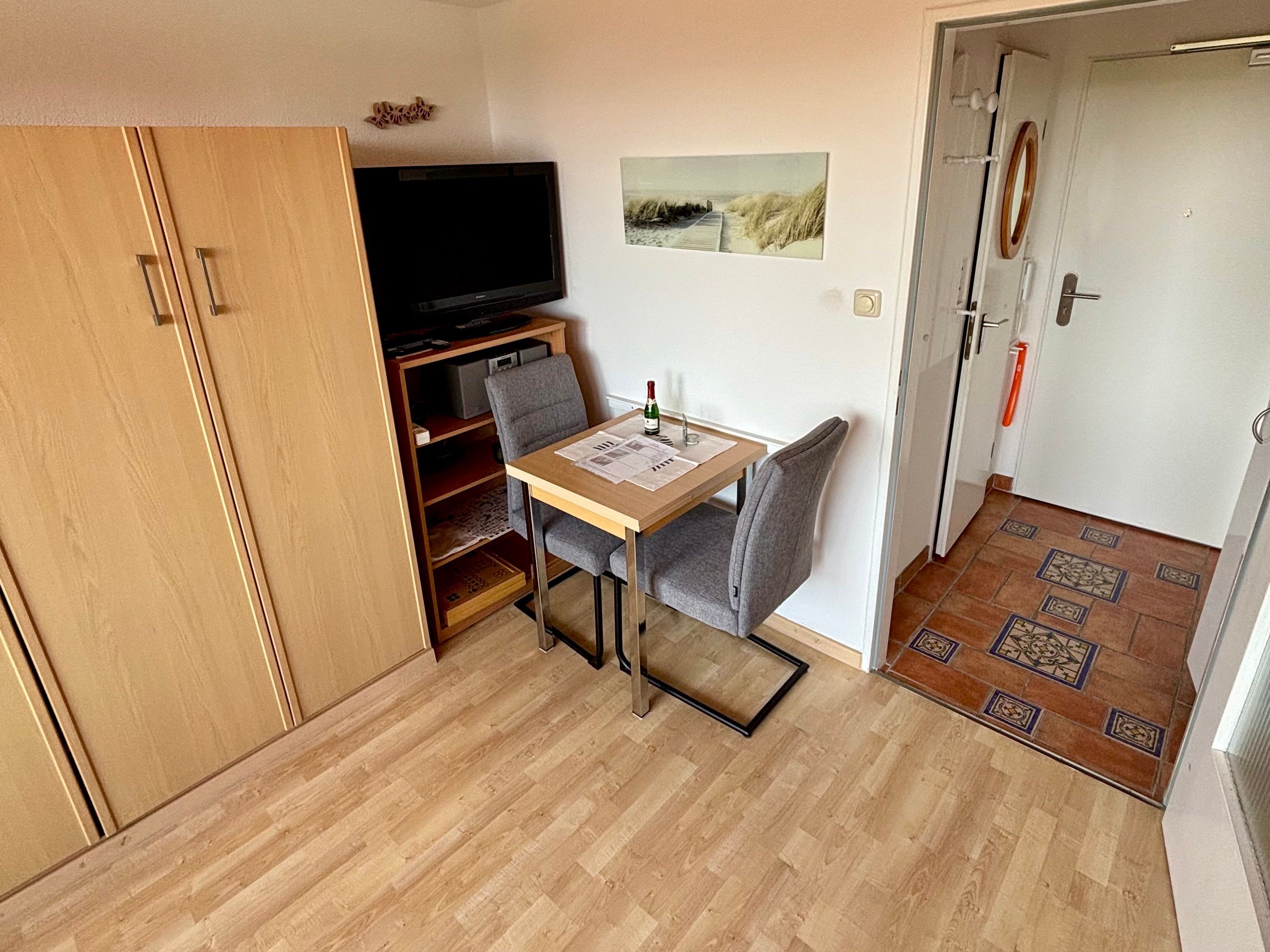 Die Wohnung bietet eine voll ausgestattete Küchenzeile mit Kühlschrank, zwei Kochplatten und einer Tassimo-Kaffeemaschine – ideal für die Zubereitung kleiner Mahlzeiten und den ersten Kaffee am Morgen. Der gemütliche Essbereich verfügt über einen ausklappbaren Tisch für zwei Personen.