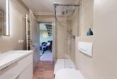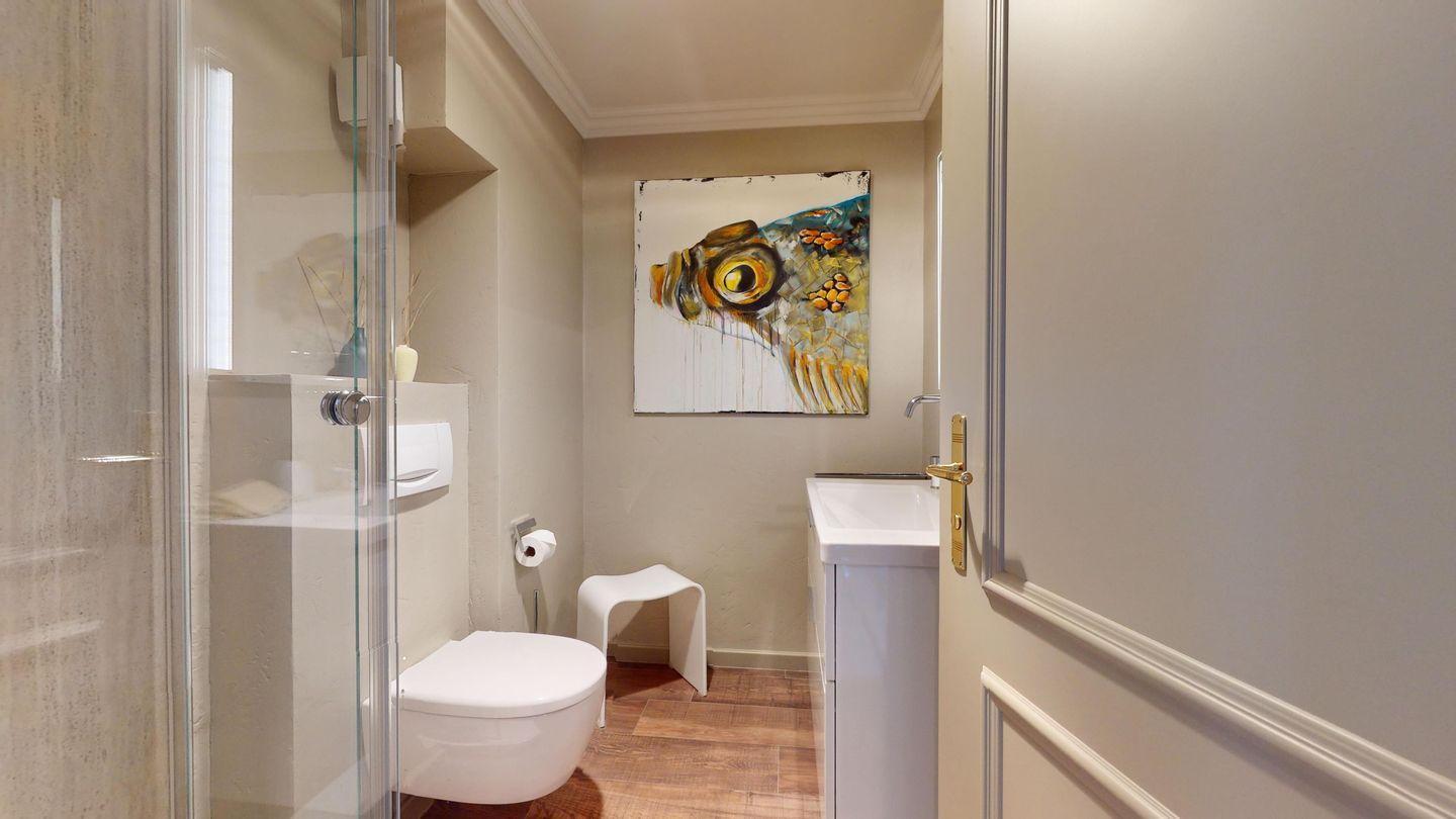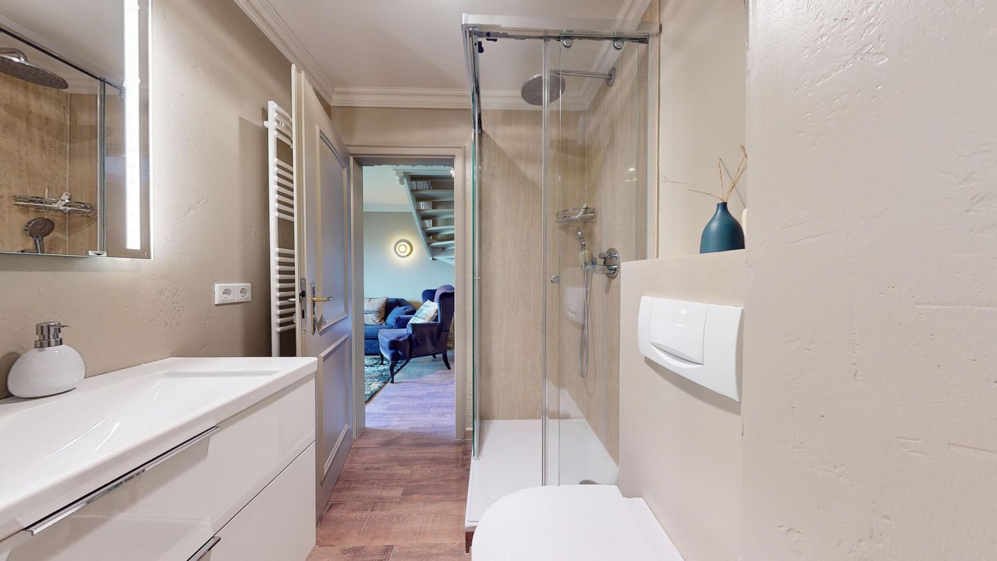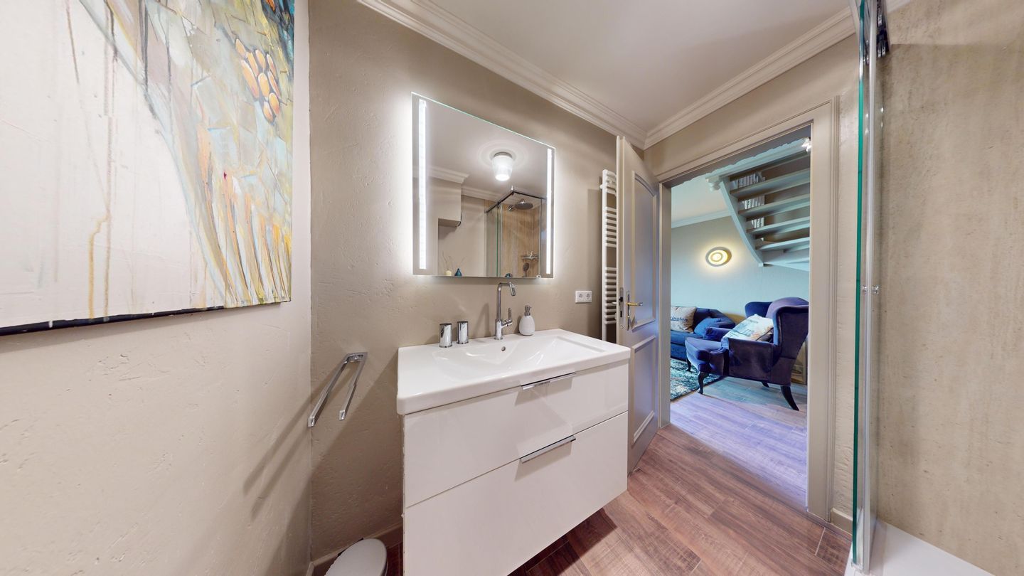 Die großzügige Balkontür sorgt nicht nur für ausreichend Licht, sondern auch für einen direkten Zugang zum Balkon, wo Sie die frische Luft und den Ausblick genießen können. Auf dieser Ebene befindet sich auch ein innenliegendes, gut ausgestattetes Badezimmer mit Dusche.