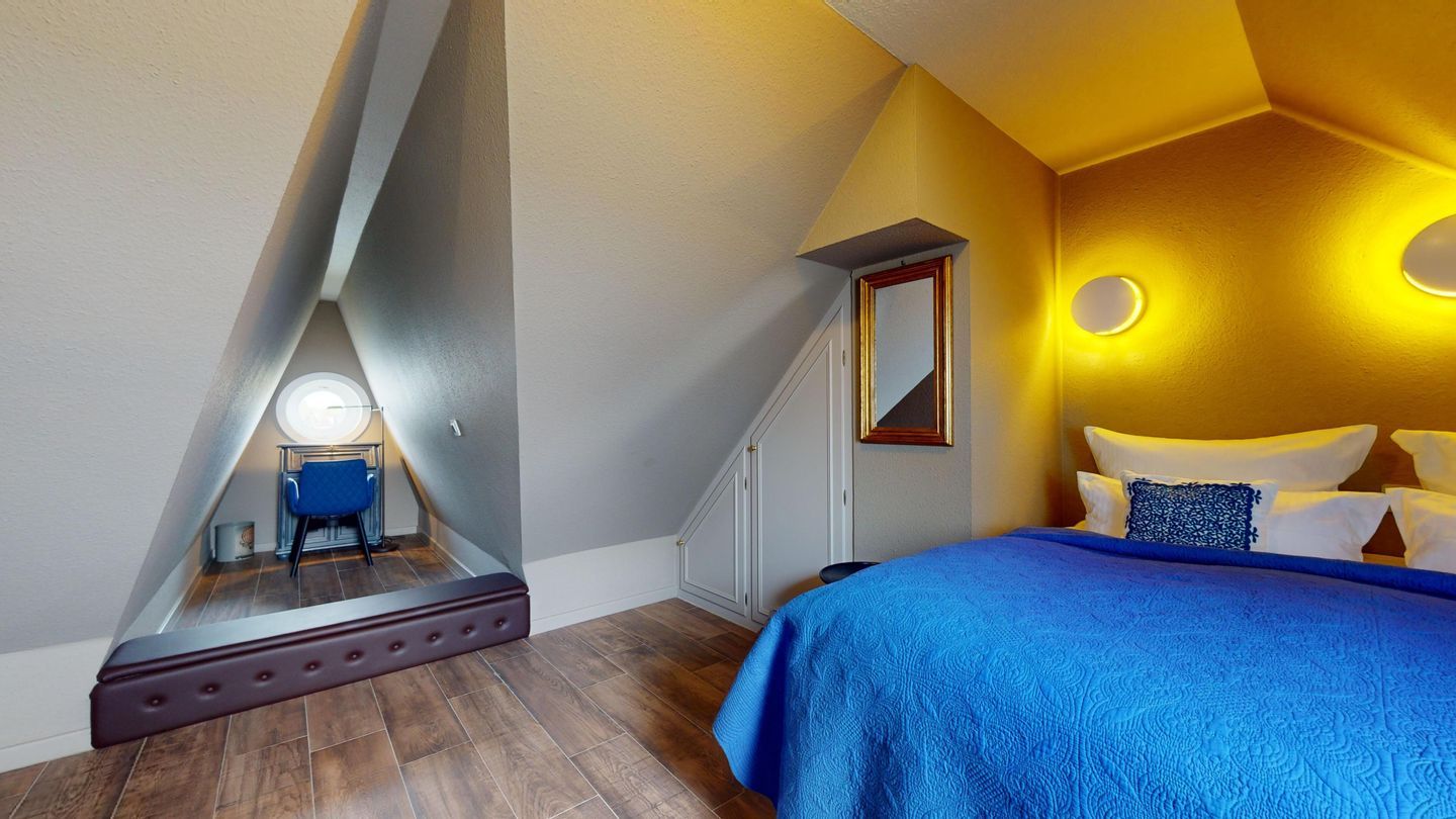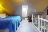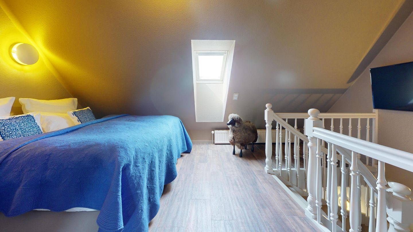 Über eine Treppe im Wohnbereich gelangen Sie in das Dachgeschoss, wo ein gemütliches Schlafzimmer mit einer Galerie und französischen Polsterbetten auf Sie wartet.