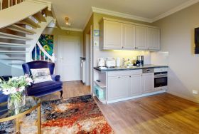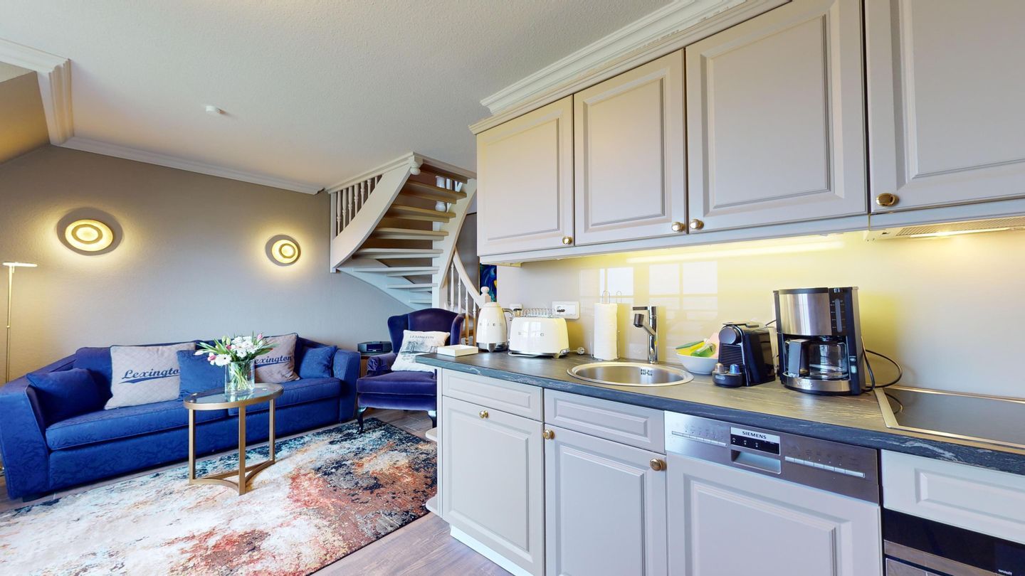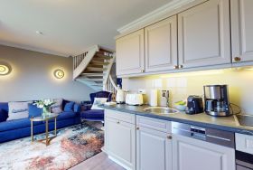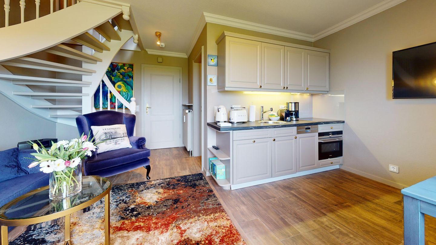 Der Wohnbereich lädt mit einer gemütlichen Sofaecke, einem kleinen Essbereich und einer gut ausgestatteten Küchenzeile mit hochwertigen Smeg-Geräten, einer Nespresso-Maschine und einer Senseo-Maschine zum Verweilen ein.
