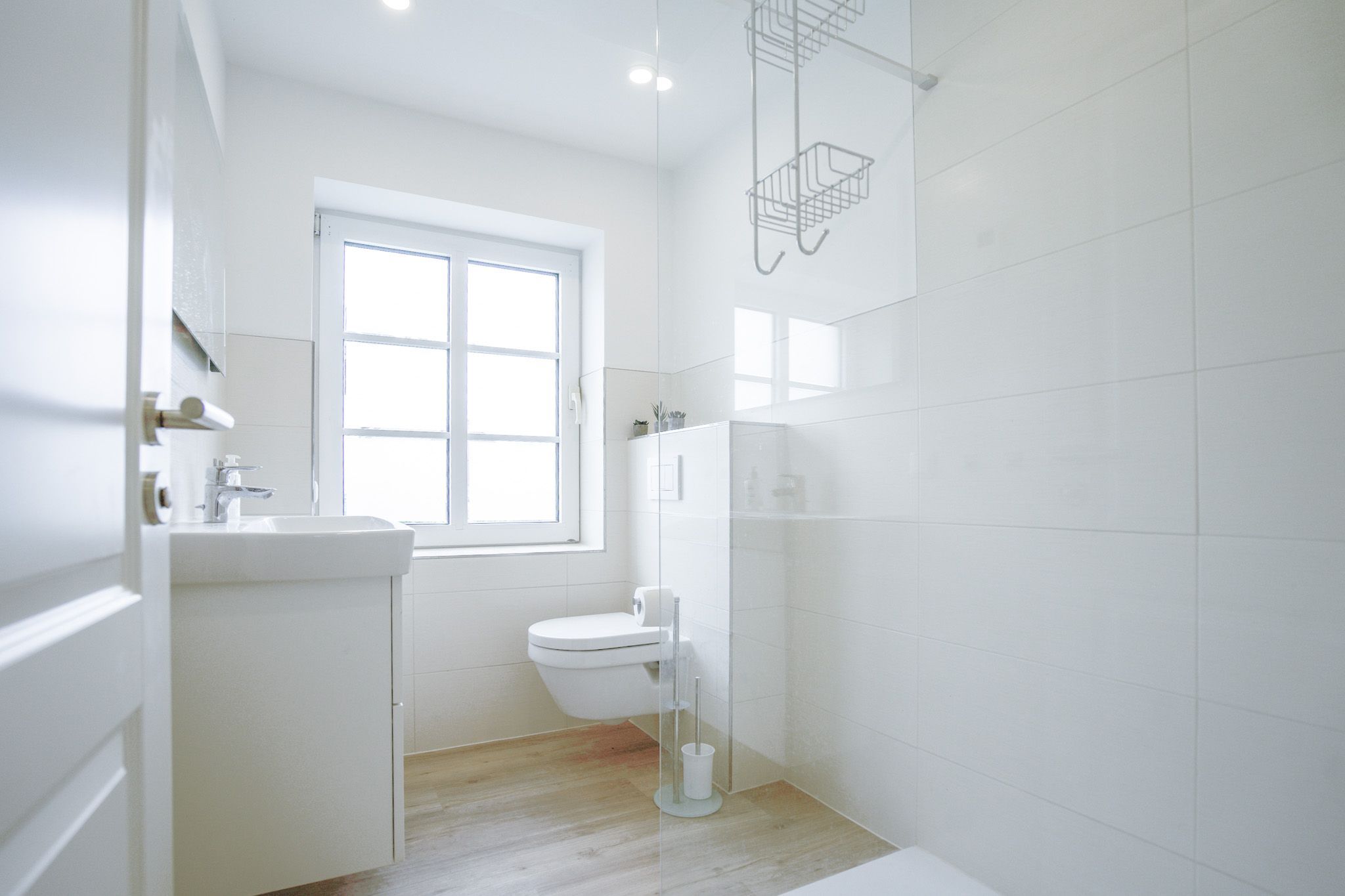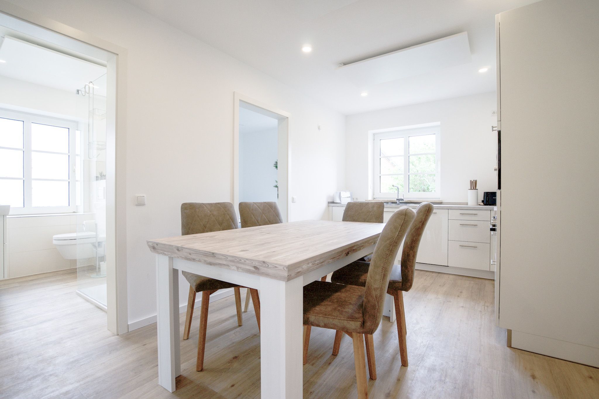 Das Bad bietet eine einladende ebenerdige Regendusche. In einem kleinen Hauswirtschaftsraum steht Ihnen eine Waschmaschine zur Verfügung. Die Wohnung wird über eine Fußbodenheizung und indirekte Infrarotelemente erwärmt.