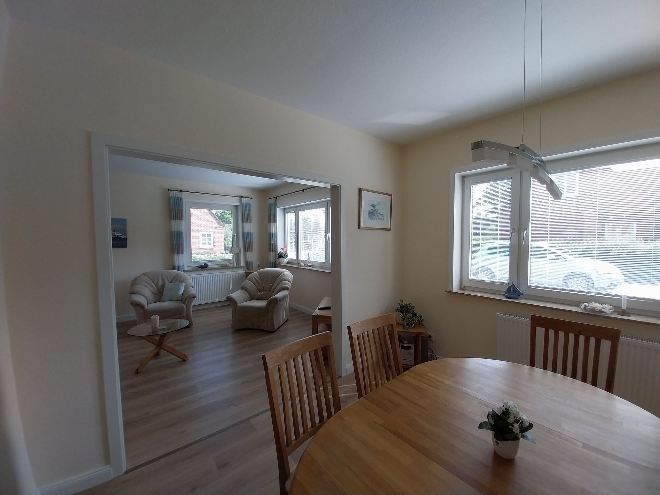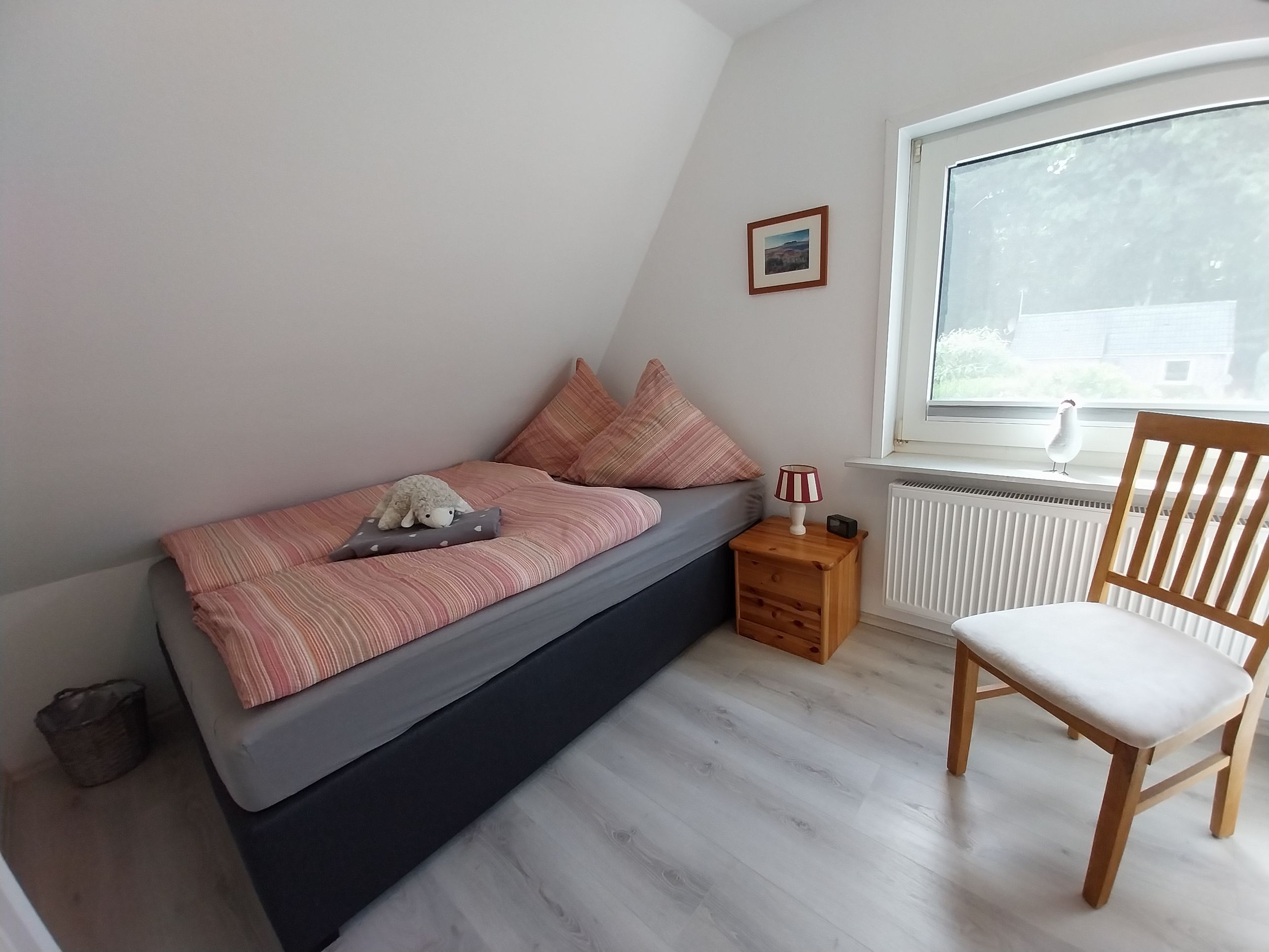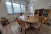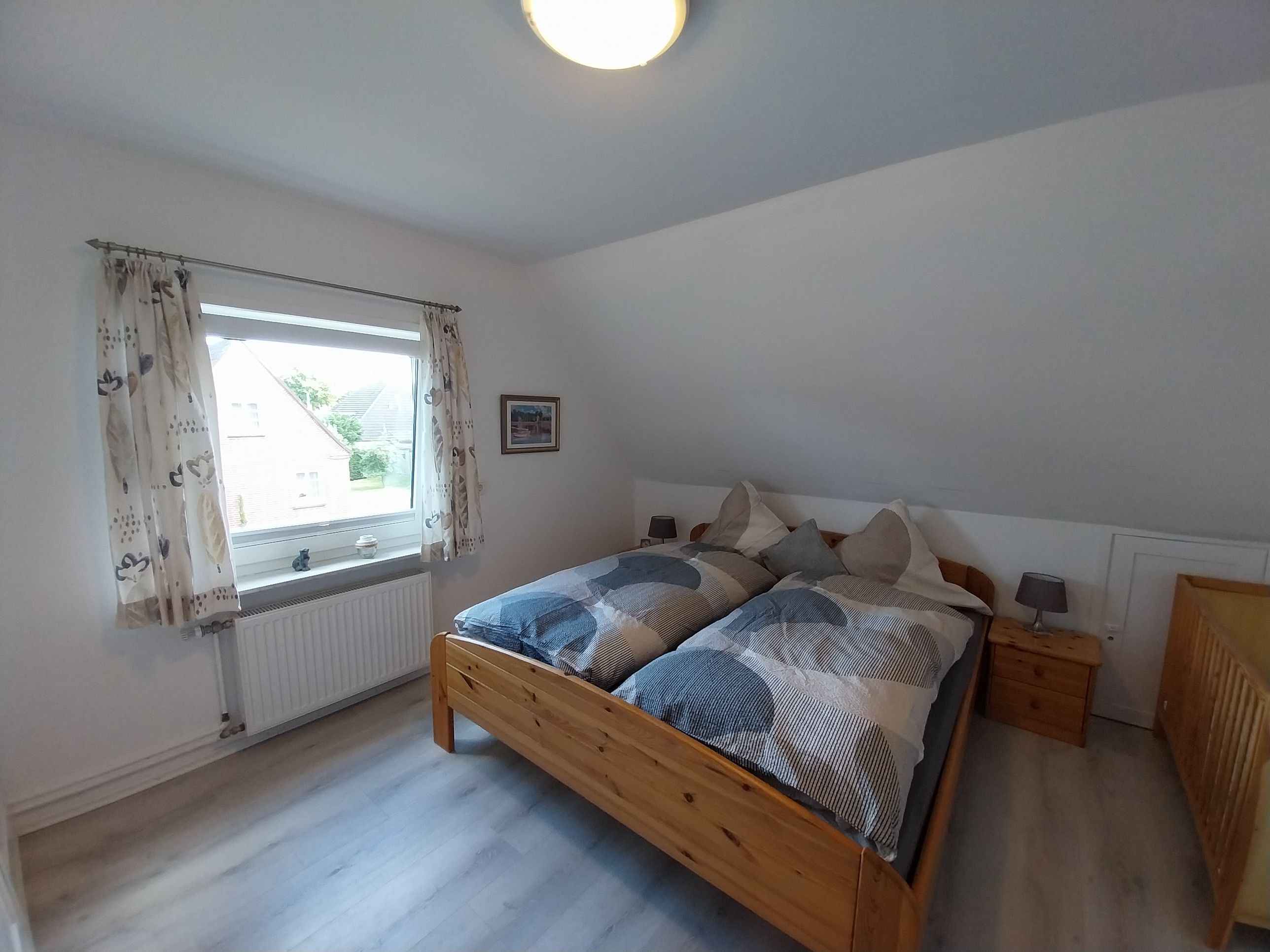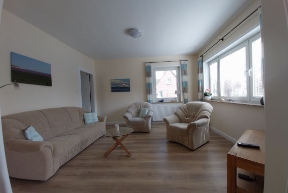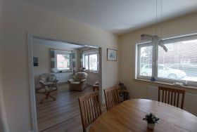Diese lichtdurchflutete Wohnung erstreckt sich über beide Etagen des Hauses und steht zur alleinigen Nutzung zur Verfügung. Wohn- und Esszimmer gehen ineinander über und bieten viel Platz, um sich auch bei Regentagen wohl zu fühlen. Kinderzimmer (Boxspringbett 1,40 x 2,00 m), Elternschlafzimmer (Doppelbett 1,80 m x 2 m) und 1 Babybett
