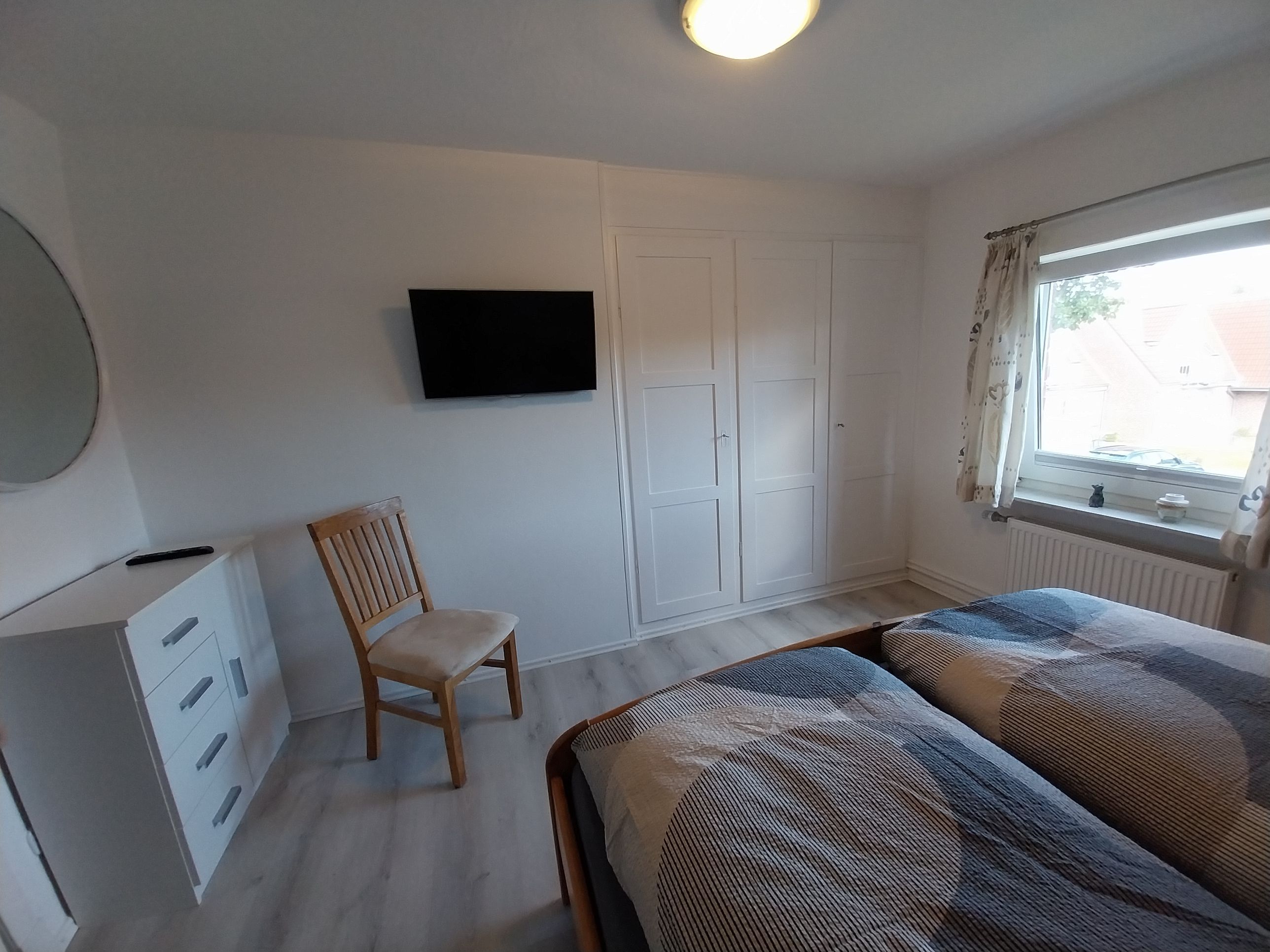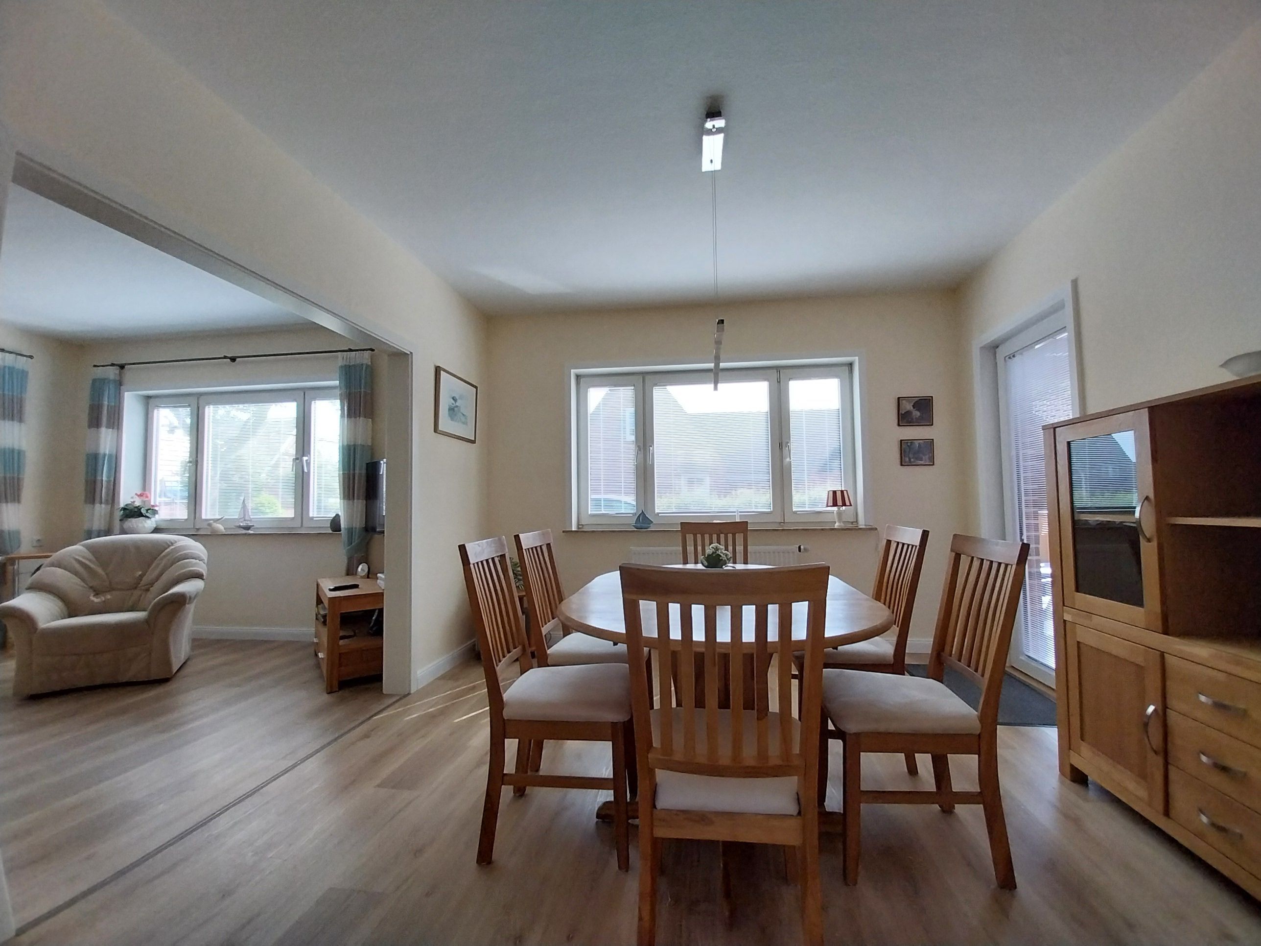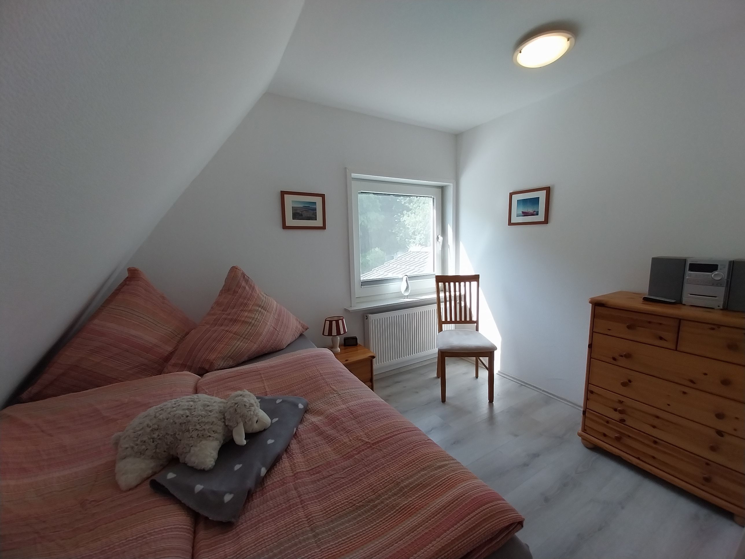 Diese lichtdurchflutete Wohnung erstreckt sich über beide Etagen des Hauses und steht zur alleinigen Nutzung zur Verfügung. Wohn- und Esszimmer gehen ineinander über und bieten viel Platz, um sich auch bei Regentagen wohl zu fühlen. Kinderzimmer (Boxspringbett 1,40 x 2,00 m), Elternschlafzimmer (Doppelbett 1,80 m x 2 m) und 1 Babybett
