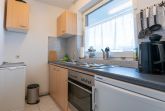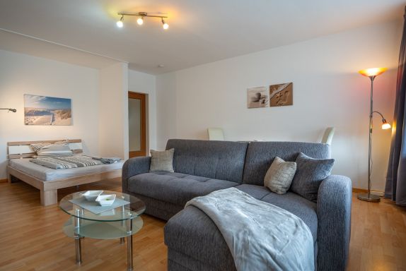 Der großzügige Wohn-/Schlafraum ist ausgestattet mit einem Doppelbett, 1,40m breit, einer gemütlichen Sitzecke mit Fernseher, Radio sowie einer Hifi-Anlage. Auch ist ein kleiner Essplatz im Wohnraum mit untergebracht. Die voll ausgestattete Küche verfügt über eine Kaffeemaschine, Mikrowelle, Wasserkocher und Toaster sowie einem Kühlschrank mit Gefrierfach.
