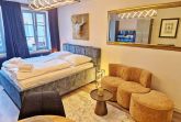 Wohn-/Schlafbereich mit einem komfortablen Doppelbett, einer stilvollen Couch zum Zurücklehnen sowie einem gemütlichen Essbereich für gemeinsame Mahlzeiten oder Spieleabende.