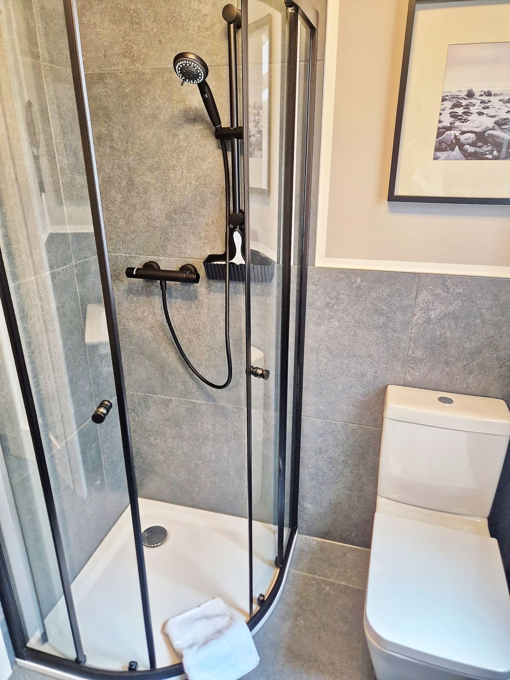 Modernes Duschbad mit ebenerdiger Dusche, hochwertigen Armaturen und Handtuchheizkörper für einen frischen Start in den Tag.