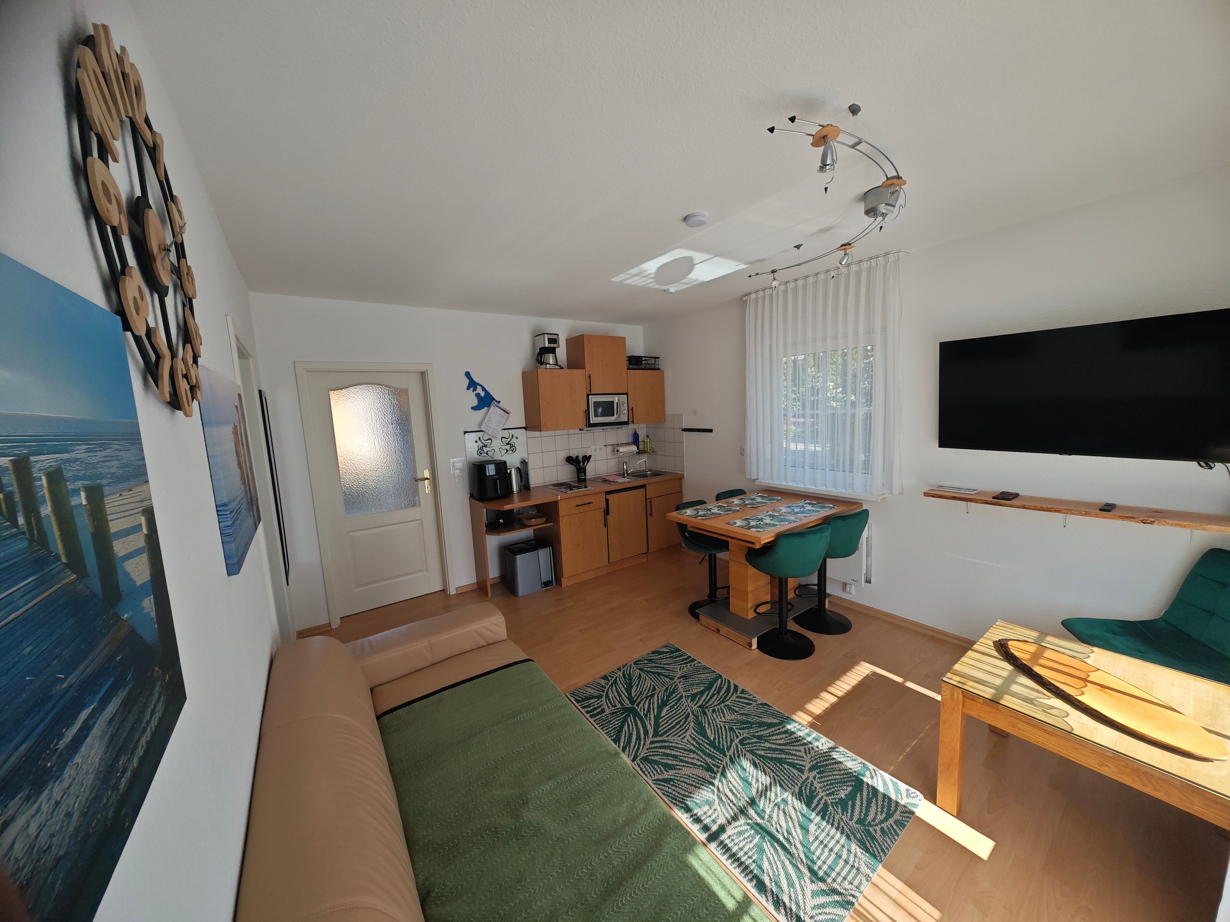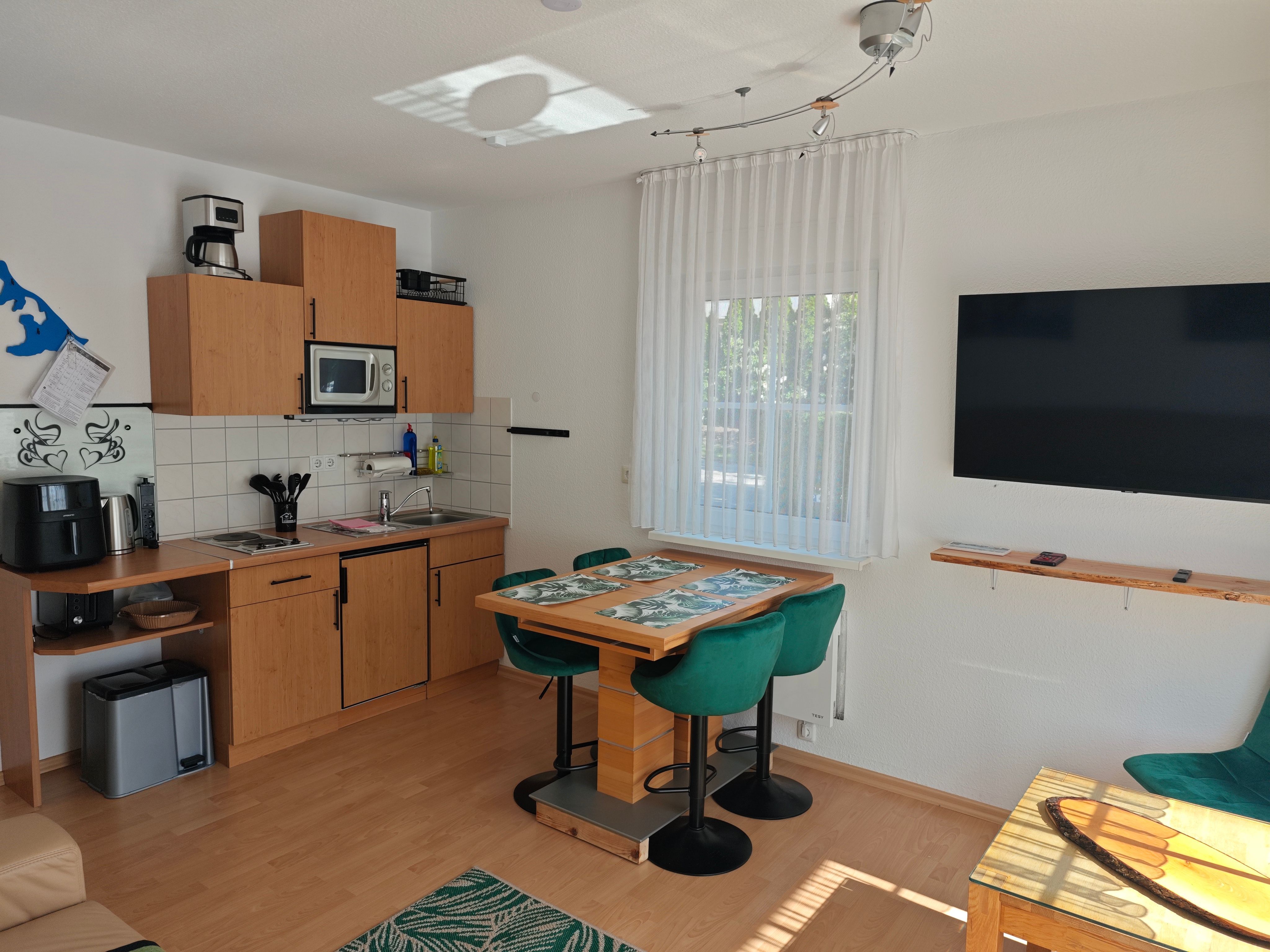 Gut ausgestattete Küche mit Heißluftfriteuse, Wasserkocher, Mikrowelle, Kaffeemaschine, Toaster, Kühlschrank, Geschirr, Besteck, Gläser und Wohnzimmer mit Flachbild-TV.
