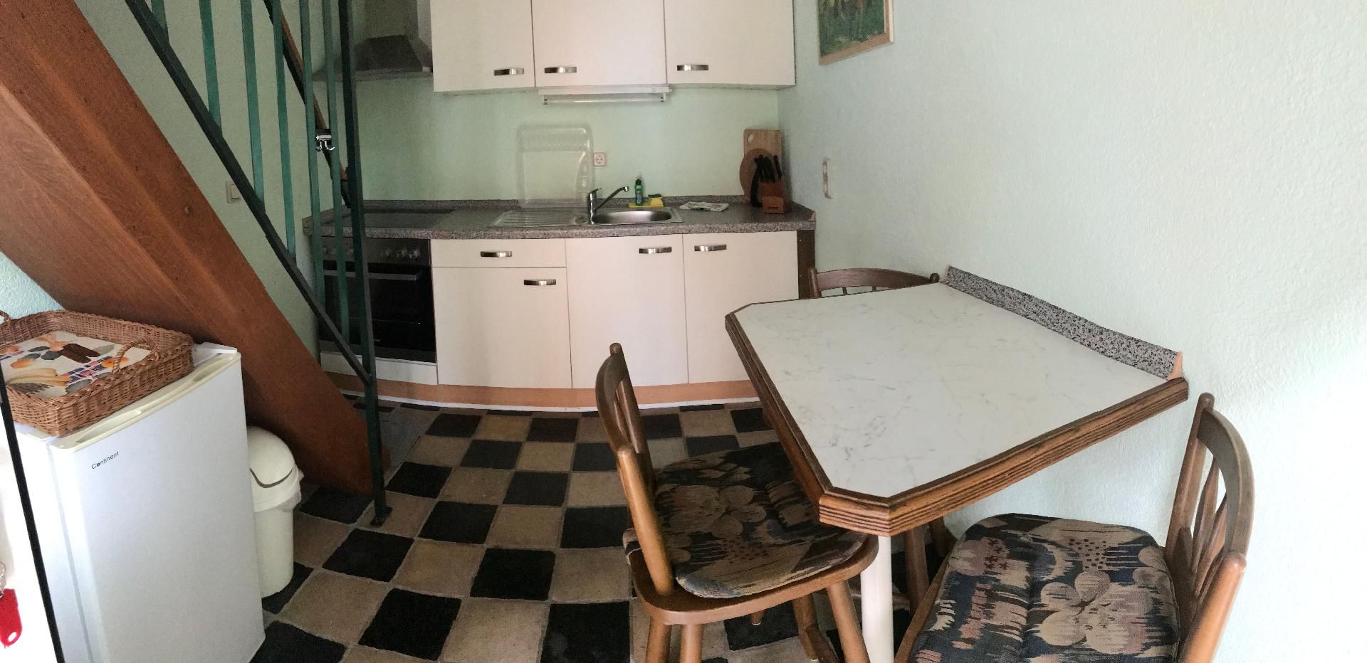 Innen erwartet Sie eine liebevoll ausgestattete Wohnung, die Ihren Aufenthalt angenehm und unbeschwert gestaltet. Annehmlichkeiten wie Klimaanlage und eine voll ausgestattete Küche, inklusive Cerankochfeld, zweier Kaffeemaschinen für Filter- und Pad-Kaffee sowie einem Wasserkocher, garantieren Komfort ab der ersten Minute. Der gemütliche Wohn-/Schlafbereich im Obergeschoss, zu erreichen über eine Stiege, und die Küche im Erdgeschoss, die direkt zur Terrasse führt, sind durchdacht gestaltet, wobei die Deckenhöhe im OG zwischen 1,67 Meter und 1,99 Meter variiert.