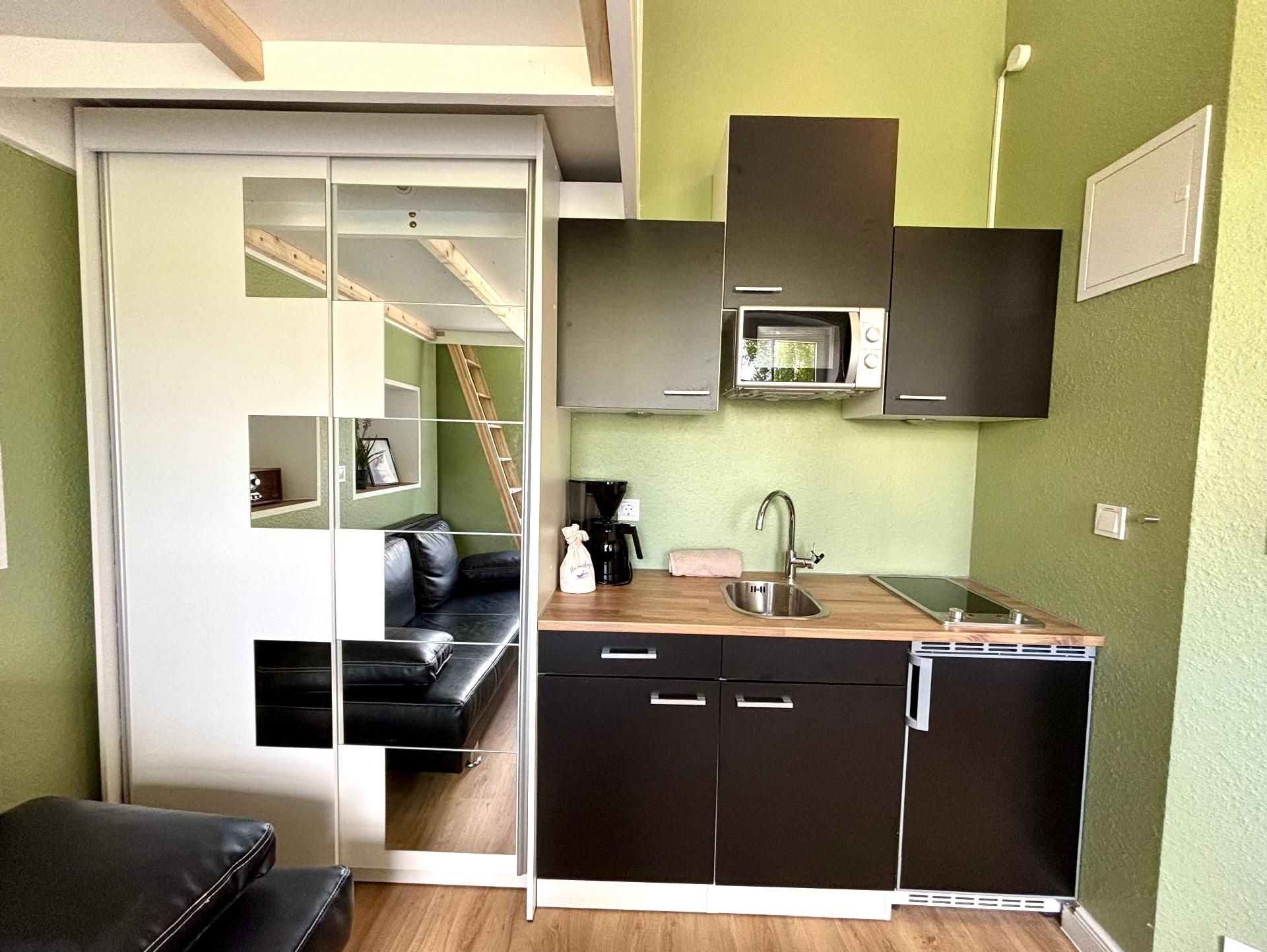 Kochen: 2-Plattenherd; Kaffeemaschine; Kühlschrank; Mikrowelle; Toaster; Wasserkocher