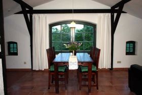 Die über 100 m² große, sehr individuell geschnittene Wohnung in der 1. Etage, auf dem ehemaligen Kornboden des Hofes ist im ländlich bäuerlichen Stil eingerichtet. Hier wohnen Sie komfortabel mit einer modernen voll ausgestatteten Küche und massivem Holz- und Ledermobiliar. Das Bad verfügt über WC, Dusche und eine Waschmaschine. Sie schlafen in zwei separaten Schlafzimmern, mit jeweils zwei Einzelbetten, die bei Bedarf zusammenschiebbar sind. Die Wohnung hat einen Terracotta - Fliesenfußboden.