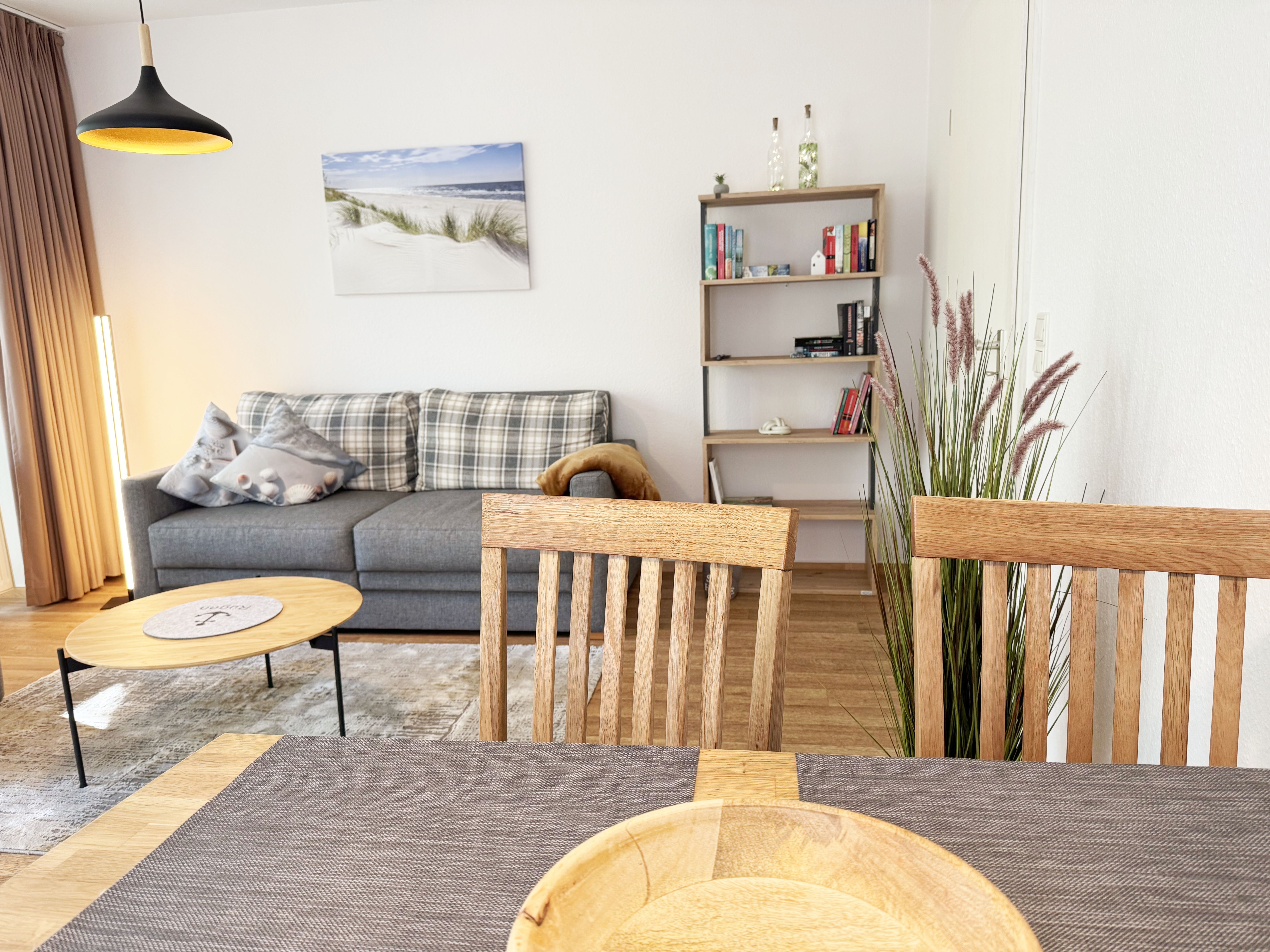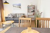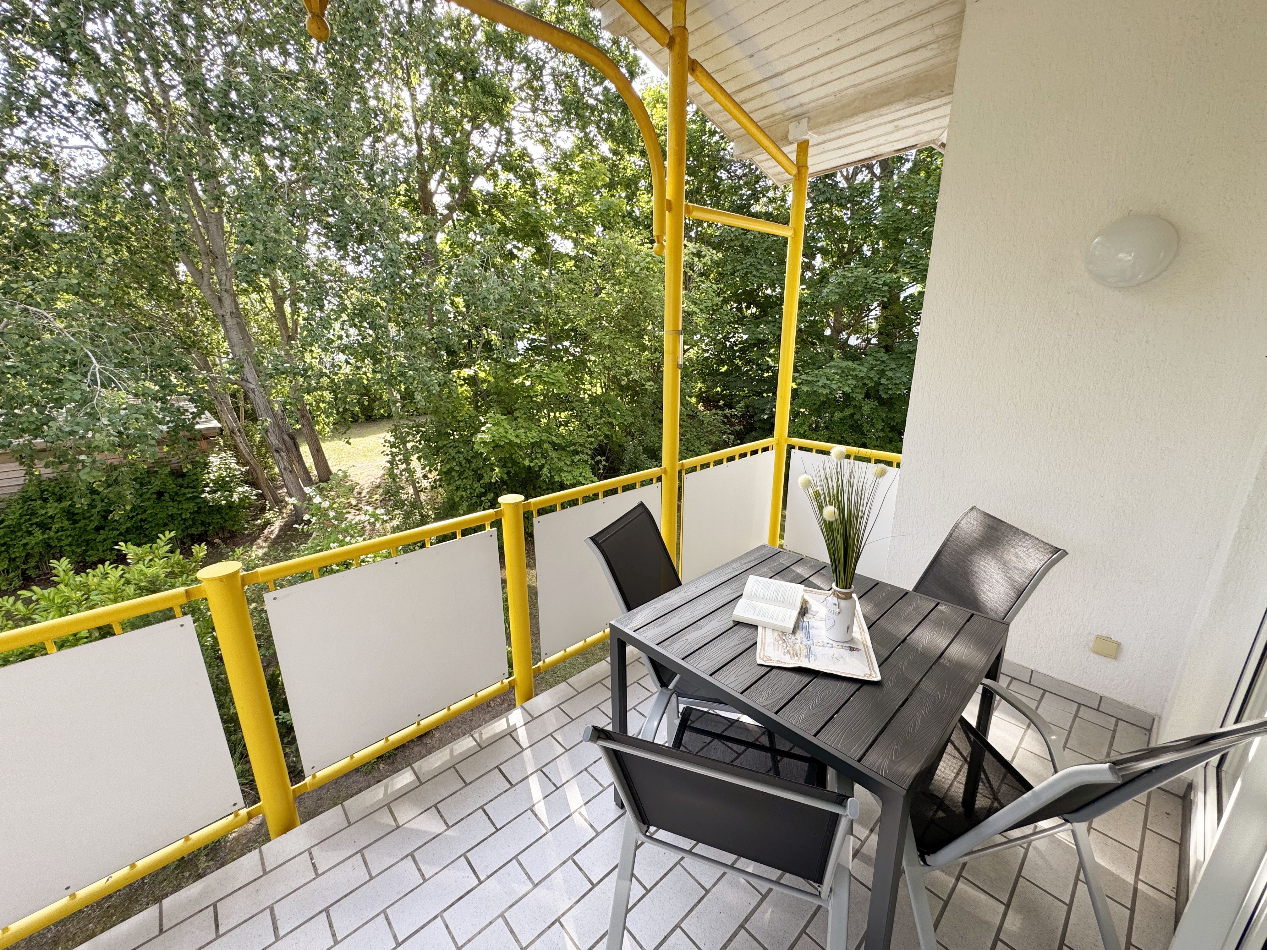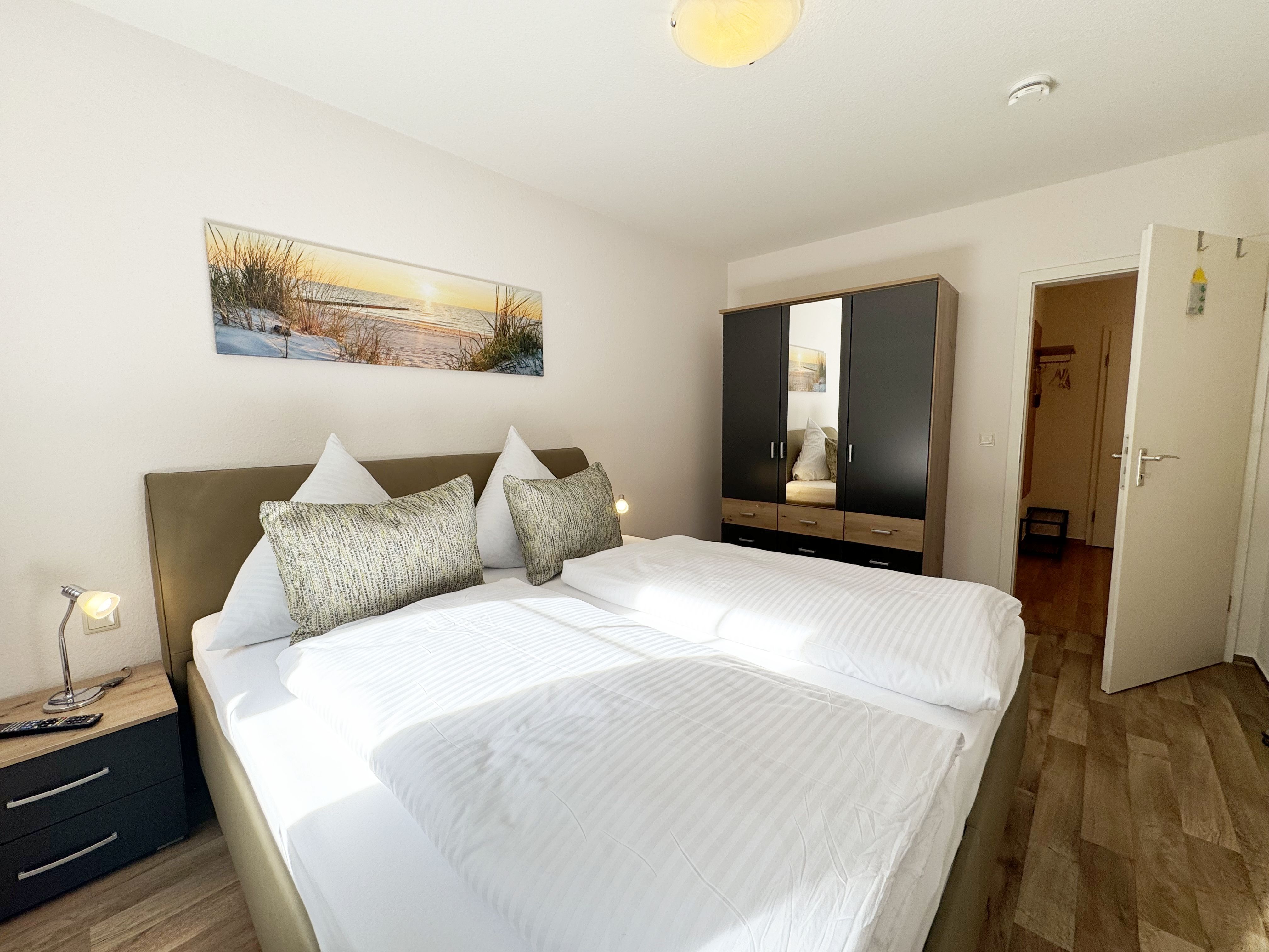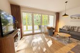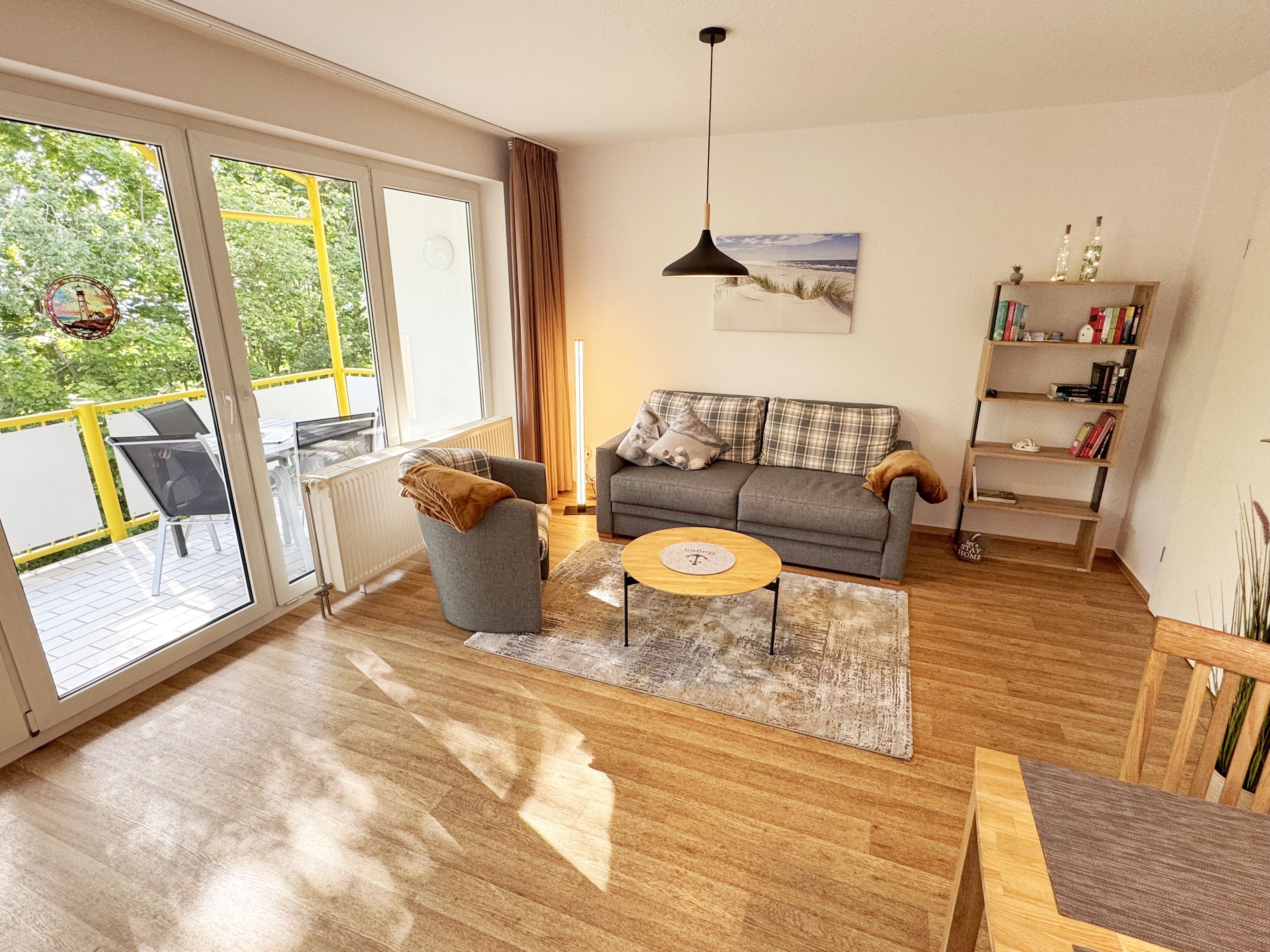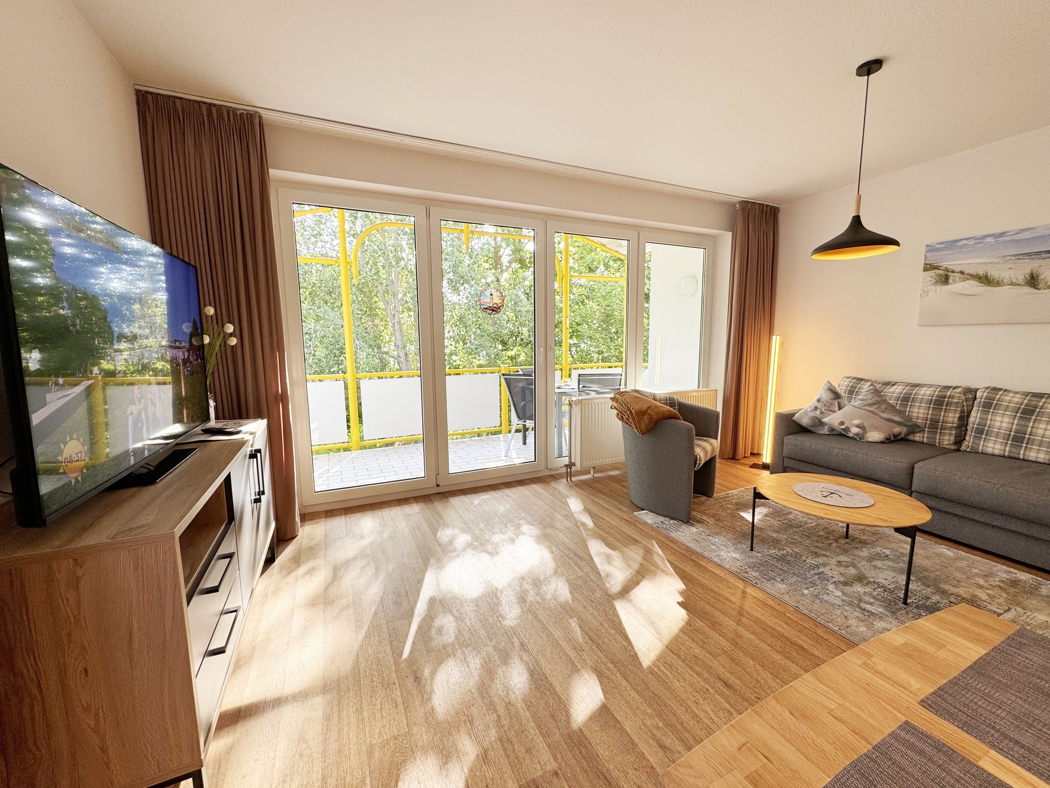 Die gemütliche ca. 52 m² große Nichtraucher-Oase der Ruhe liegt idyllisch im 1. Obergeschoss der Villa Störtebeker (Nr. 15) und bietet Ihnen für max. 2 bis 4 Personen, einen herrlichen Blick ins Grüne. Vom großen Flur aus, mit Garderobe, einem Spiegel und einem Schrank, gelangen Sie in alle Räume. Die in allen Räumen verwendeten Möbel und Accessoires strahlen Ruhe und Gemütlichkeit aus – perfekt, um dem Alltag zu entfliehen. Der großzügige, lichtdurchflutete Wohnbereich lädt mit einer Essecke, einer komfortablen Schlafcouch (1,60m x 2,00m, Aufbettung für 3./4. Person), einem Sessel, einen Relaxesessel, einer Stehlampe, einem TV-Board und einem 55-Zoll-Smart-TV zum Entspannen ein. Auch bei nicht so gutem Wetter kommt keine Langeweile auf: denn Spiele, ein DAB-Radio und eine Bücherecke sorgen für zusätzliche Unterhaltung. Ein kostenfreier WLAN-Zugang ist ebenfalls vorhanden. Stilvolle, teilweise dimmbare Lampen sorgen für eine Wohlfühlatmosphäre. Vom Wohnbereich gelangen Sie auf den 10 m² große, überdachten und nach Osten ausgerichteten Balkon, umgeben von Grün und Bäumen, ist es der perfekte Ort für entspannte Stunden.  Je nach Windrichtung können Sie auch das Meer zart rauschen hören. Die separate Küche ist komplett ausgestattet mit einem Cerankochfeld, einem Backofen, einem Geschirrspüler, einem Kühlschrank mit Eisfach, einer Spüle sowie weiteren Elektrogeräten wie einer Nespresso-Kaffeemaschine, einer Kaffeemaschine, einen Eierkocher, einem Wasserkocher, einem Toaster, einer Mikrowelle und einem Rührgerät/Mixer. Im geräumigen Schlafzimmer erwartet Sie ein erholsamer Schlaf in einem Doppelbett in Komforthöhe (1,80m x 2,00m) mit verstellbaren Lattenrosten. Nachttischablagen mit Beleuchtung, ein Herrendiener, ein Kleiderschrank und ein weiterer Flachbild-TV sind ebenfalls vorhanden. Die Verdunklungsmöglichkeit, sowie Insektenschutzgitter und die ruhige Lage sind beste Voraussetzungen für ruhige Nächte. Das innenliegende Badezimmer, mit einem WC, einer Dusche, einem Fön, einem Kosmetikspiegel und einem Waschplatz, bietet Ihnen den täglichen Komfort. Eine Waschmaschine und ein Trockner stehen gegen Gebühr im Waschraum zur Verfügung. Haustiere sind nicht erlaubt. Ihre Fahrräder können Sie im gemeinschaftlichen, abschließbaren Fahrradhäuschen hinter dem Haus oder im abschließbaren Keller des Hauses abstellen. Ihr PKW-Stellplatz (Nr. 15) befindet sich direkt vor dem Haus. Die Erstausstattung eines Wäschepaketes (komplette Bettwäsche, 1 Duschhandtuch, 1 kleines Handtuch) können Sie bis 14 Tage vor Anreise gegen Aufpreis dazu buchen oder durch eigene Ergänzen. Ab 2 gebuchten Paketen erhalten Sie einmalig 1 Geschirrhandtuch und 1 Duschvorleger dazu.