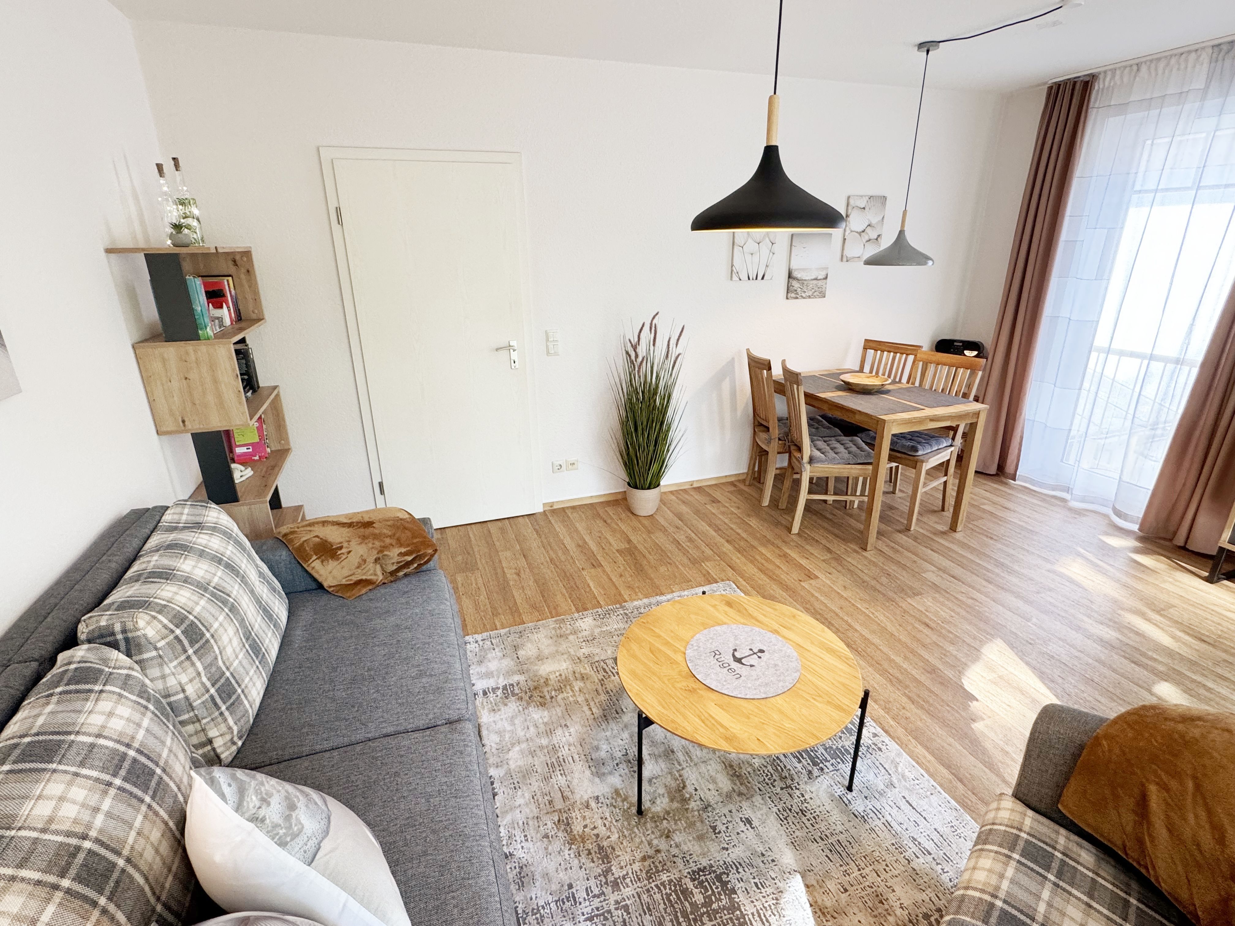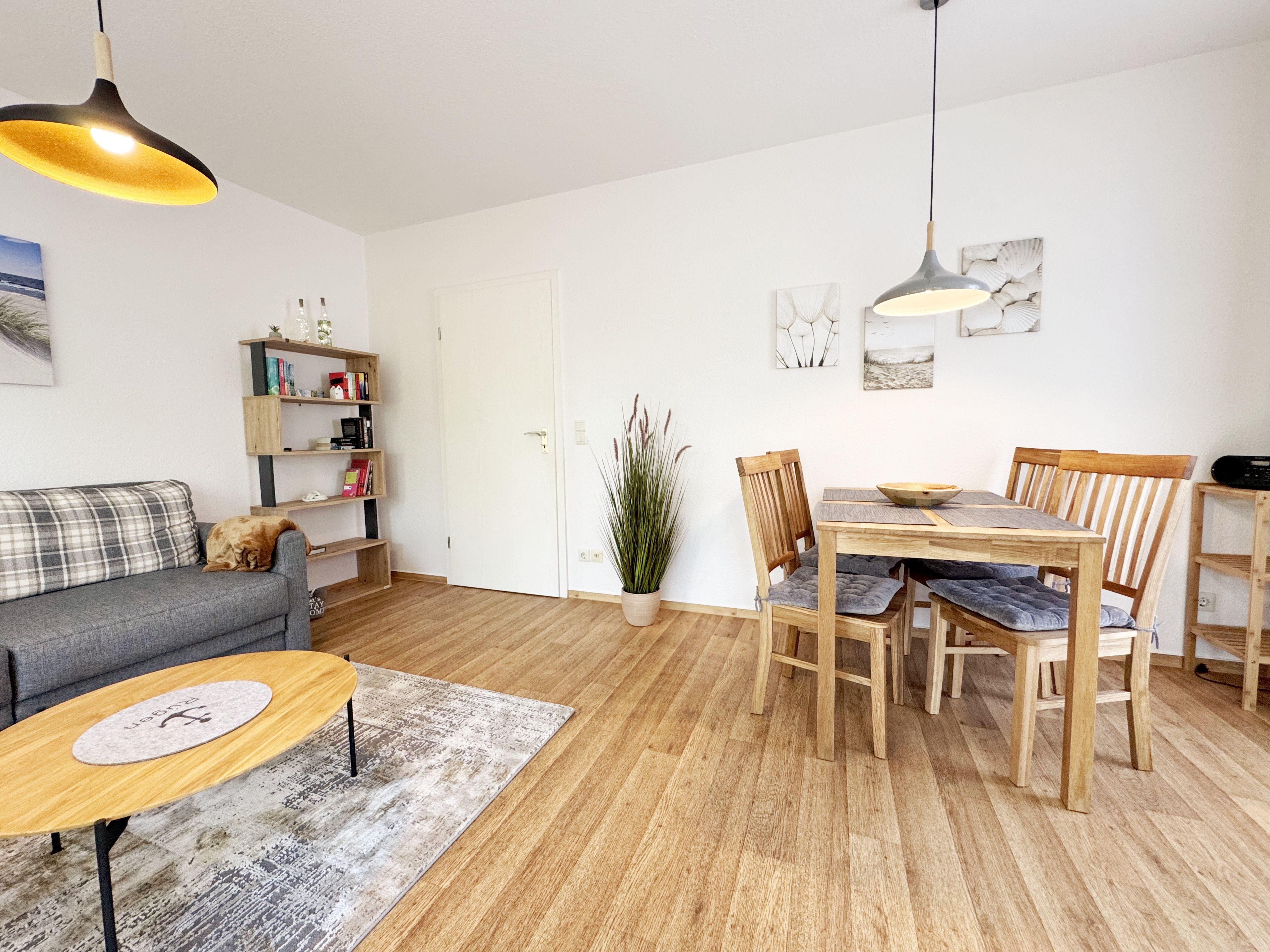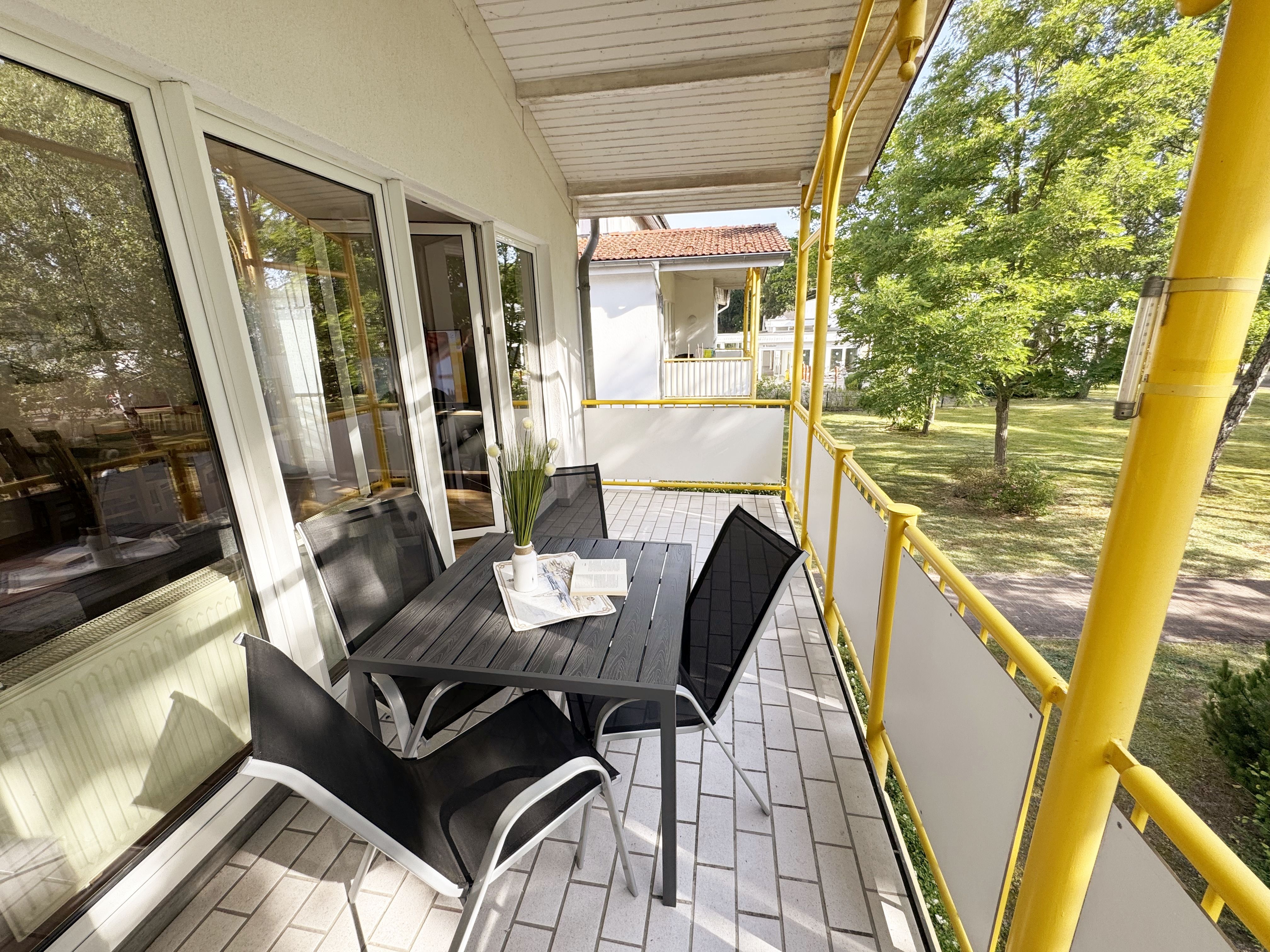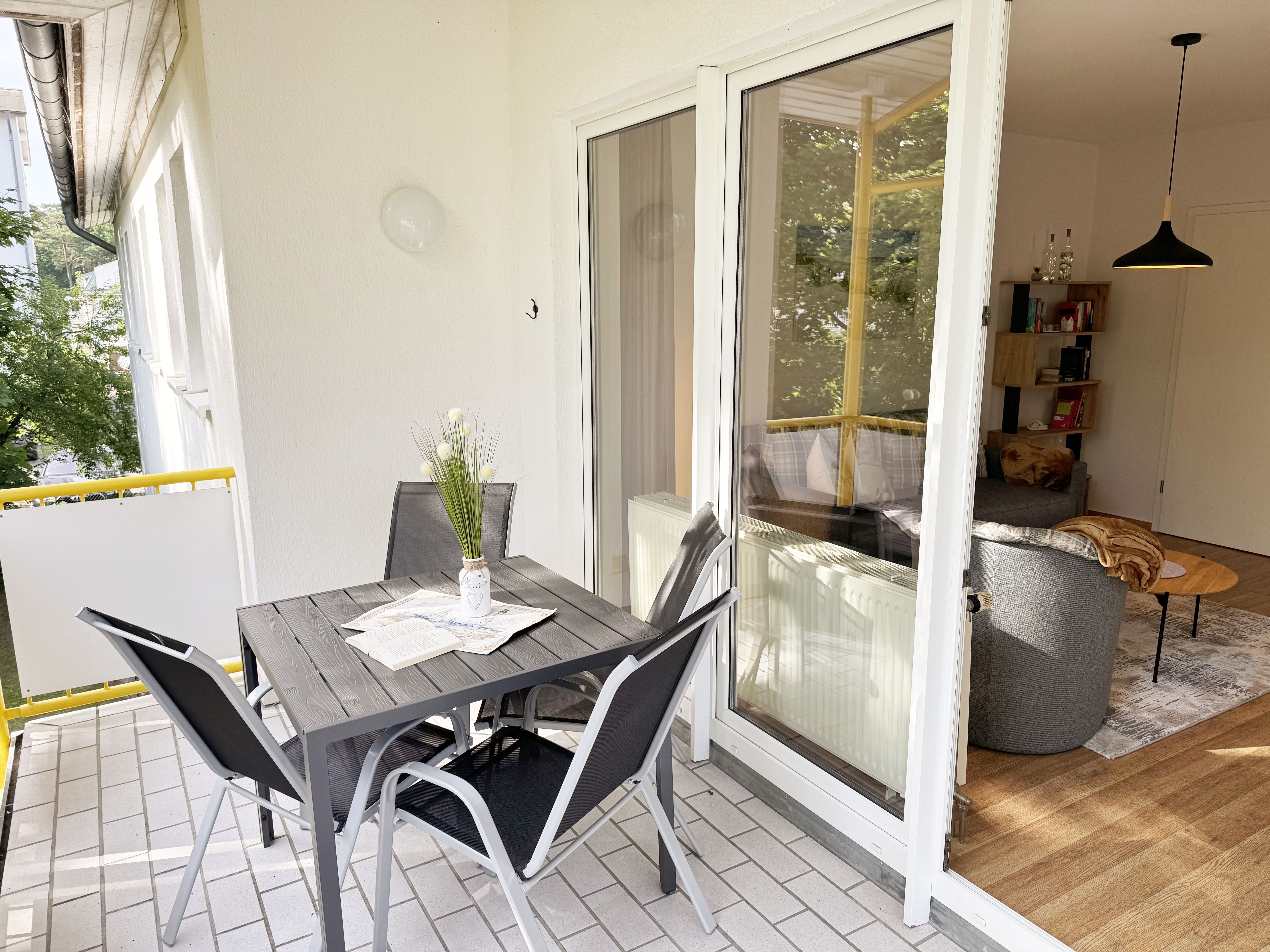 Die gemütliche ca. 52 m² große Nichtraucher-Oase der Ruhe liegt idyllisch im 1. Obergeschoss der Villa Störtebeker (Nr. 15) und bietet Ihnen für max. 2 bis 4 Personen, einen herrlichen Blick ins Grüne. Vom großen Flur aus, mit Garderobe, einem Spiegel und einem Schrank, gelangen Sie in alle Räume. Die in allen Räumen verwendeten Möbel und Accessoires strahlen Ruhe und Gemütlichkeit aus – perfekt, um dem Alltag zu entfliehen. Der großzügige, lichtdurchflutete Wohnbereich lädt mit einer Essecke, einer komfortablen Schlafcouch (1,60m x 2,00m, Aufbettung für 3./4. Person), einem Sessel, einen Relaxesessel, einer Stehlampe, einem TV-Board und einem 55-Zoll-Smart-TV zum Entspannen ein. Auch bei nicht so gutem Wetter kommt keine Langeweile auf: denn Spiele, ein DAB-Radio und eine Bücherecke sorgen für zusätzliche Unterhaltung. Ein kostenfreier WLAN-Zugang ist ebenfalls vorhanden. Stilvolle, teilweise dimmbare Lampen sorgen für eine Wohlfühlatmosphäre. Vom Wohnbereich gelangen Sie auf den 10 m² große, überdachten und nach Osten ausgerichteten Balkon, umgeben von Grün und Bäumen, ist es der perfekte Ort für entspannte Stunden.  Je nach Windrichtung können Sie auch das Meer zart rauschen hören. Die separate Küche ist komplett ausgestattet mit einem Cerankochfeld, einem Backofen, einem Geschirrspüler, einem Kühlschrank mit Eisfach, einer Spüle sowie weiteren Elektrogeräten wie einer Nespresso-Kaffeemaschine, einer Kaffeemaschine, einen Eierkocher, einem Wasserkocher, einem Toaster, einer Mikrowelle und einem Rührgerät/Mixer. Im geräumigen Schlafzimmer erwartet Sie ein erholsamer Schlaf in einem Doppelbett in Komforthöhe (1,80m x 2,00m) mit verstellbaren Lattenrosten. Nachttischablagen mit Beleuchtung, ein Herrendiener, ein Kleiderschrank und ein weiterer Flachbild-TV sind ebenfalls vorhanden. Die Verdunklungsmöglichkeit, sowie Insektenschutzgitter und die ruhige Lage sind beste Voraussetzungen für ruhige Nächte. Das innenliegende Badezimmer, mit einem WC, einer Dusche, einem Fön, einem Kosmetikspiegel und einem Waschplatz, bietet Ihnen den täglichen Komfort. Eine Waschmaschine und ein Trockner stehen gegen Gebühr im Waschraum zur Verfügung. Haustiere sind nicht erlaubt. Ihre Fahrräder können Sie im gemeinschaftlichen, abschließbaren Fahrradhäuschen hinter dem Haus oder im abschließbaren Keller des Hauses abstellen. Ihr PKW-Stellplatz (Nr. 15) befindet sich direkt vor dem Haus. Die Erstausstattung eines Wäschepaketes (komplette Bettwäsche, 1 Duschhandtuch, 1 kleines Handtuch) können Sie bis 14 Tage vor Anreise gegen Aufpreis dazu buchen oder durch eigene Ergänzen. Ab 2 gebuchten Paketen erhalten Sie einmalig 1 Geschirrhandtuch und 1 Duschvorleger dazu.
