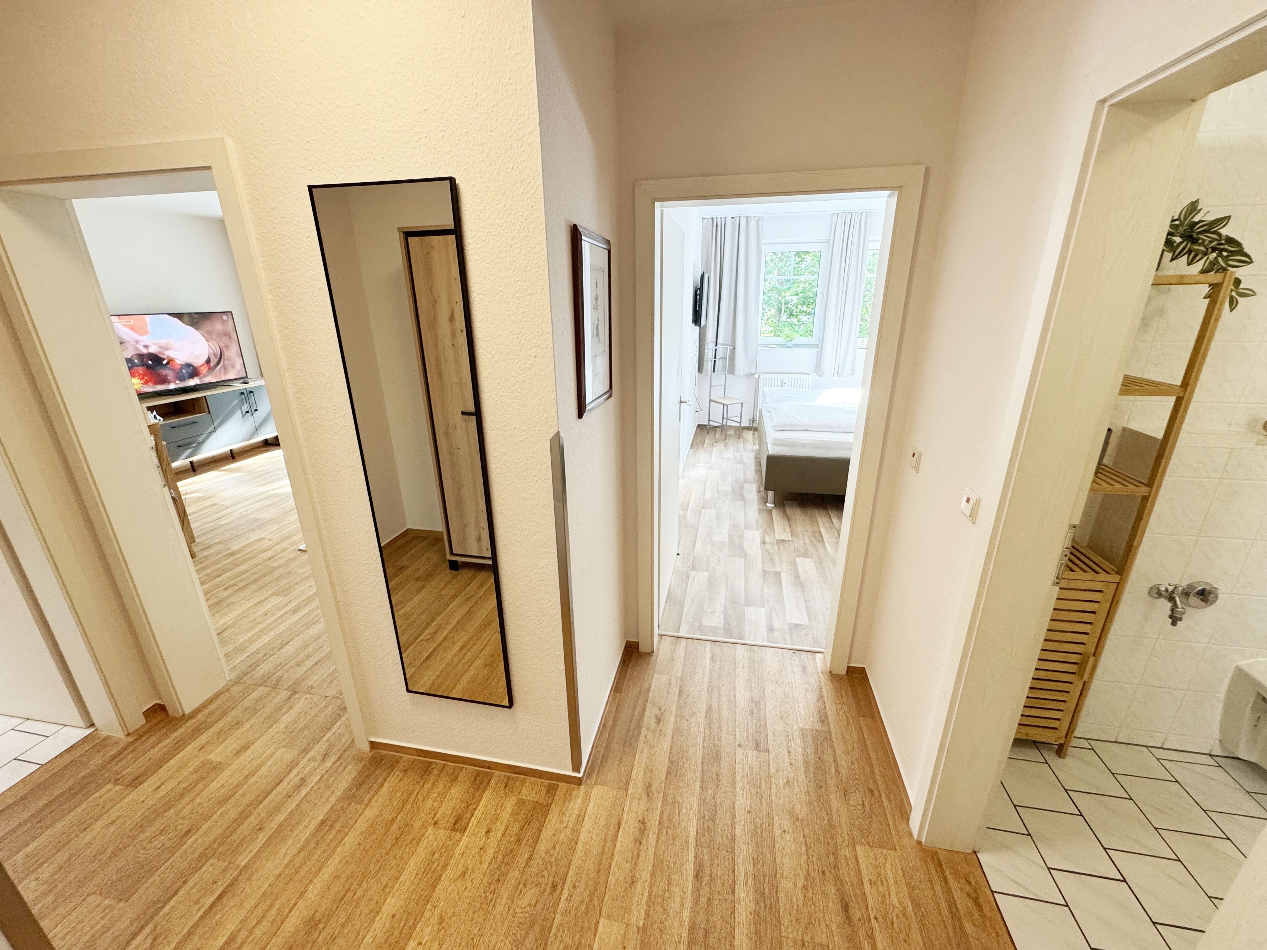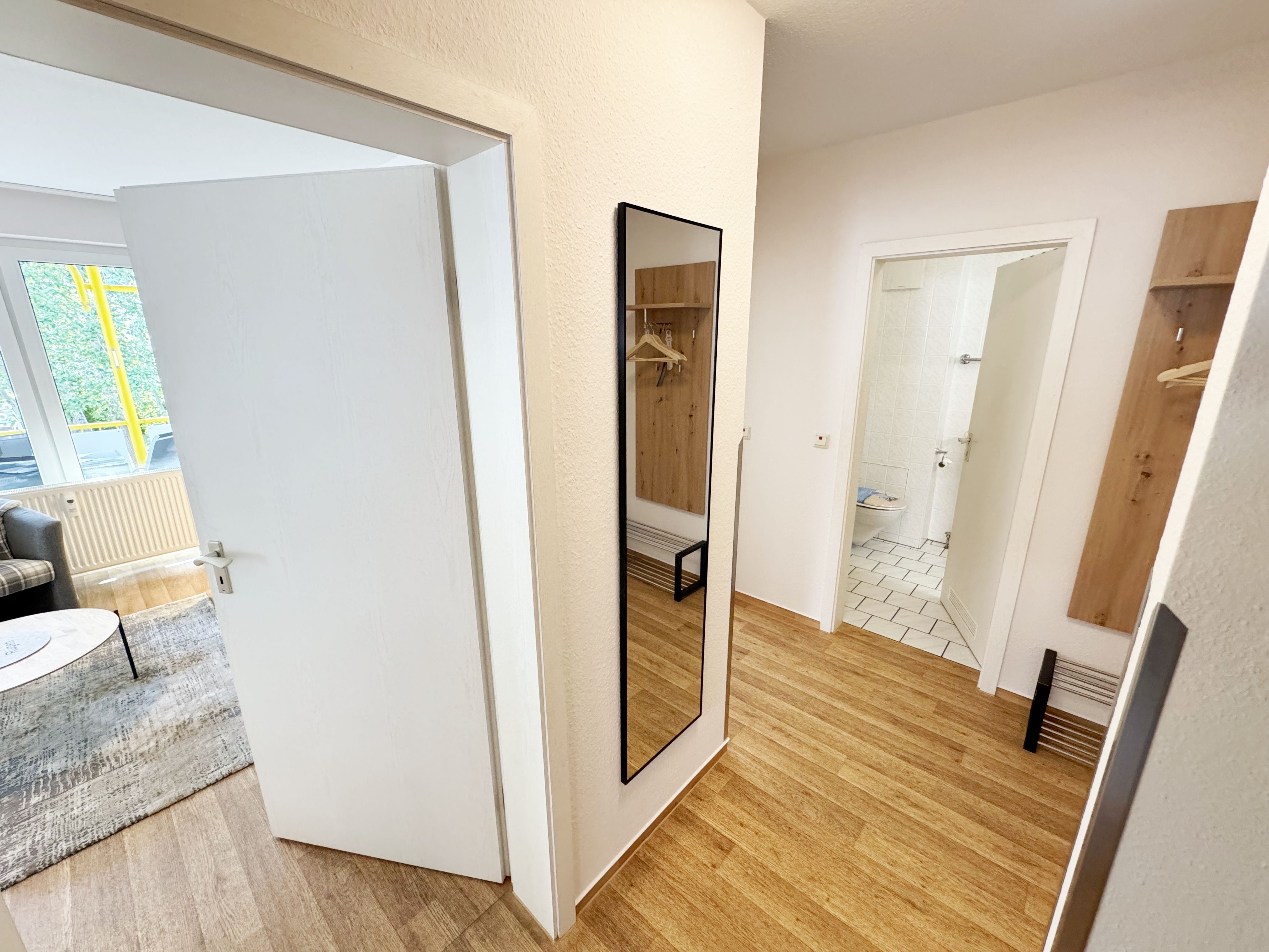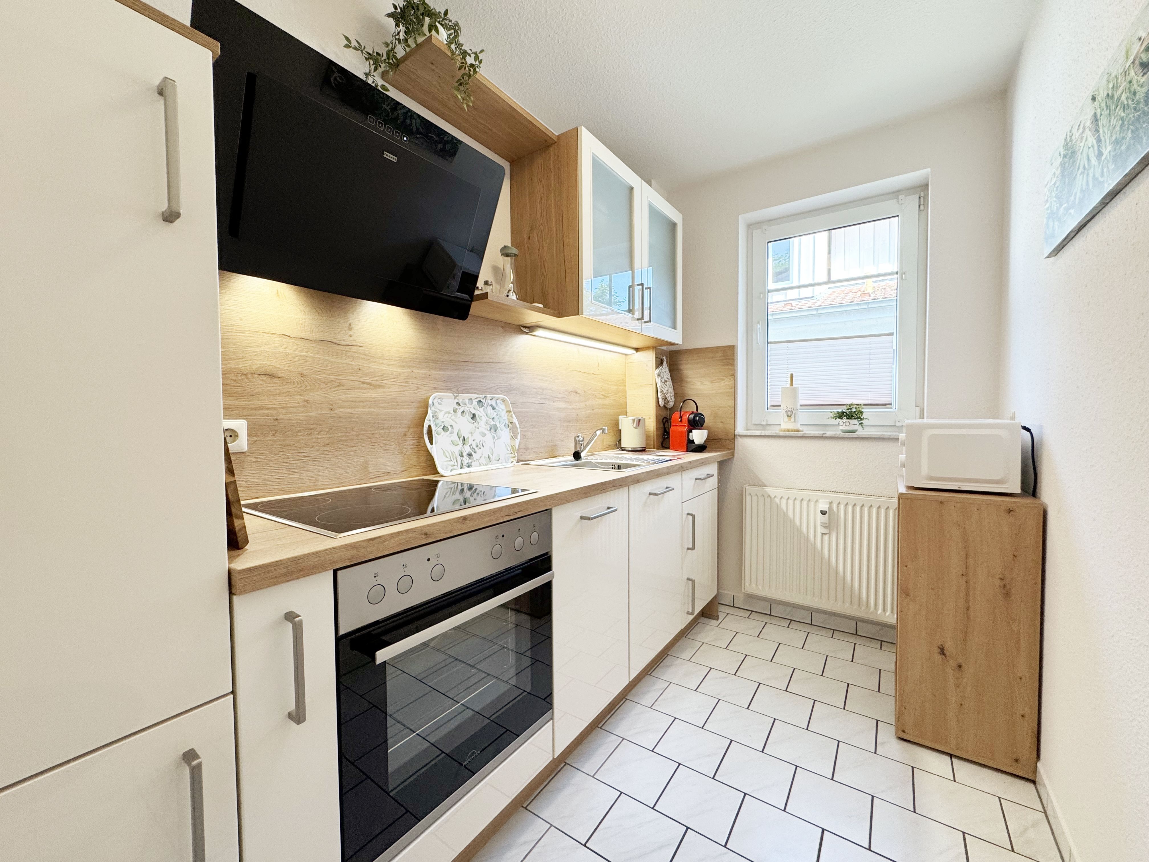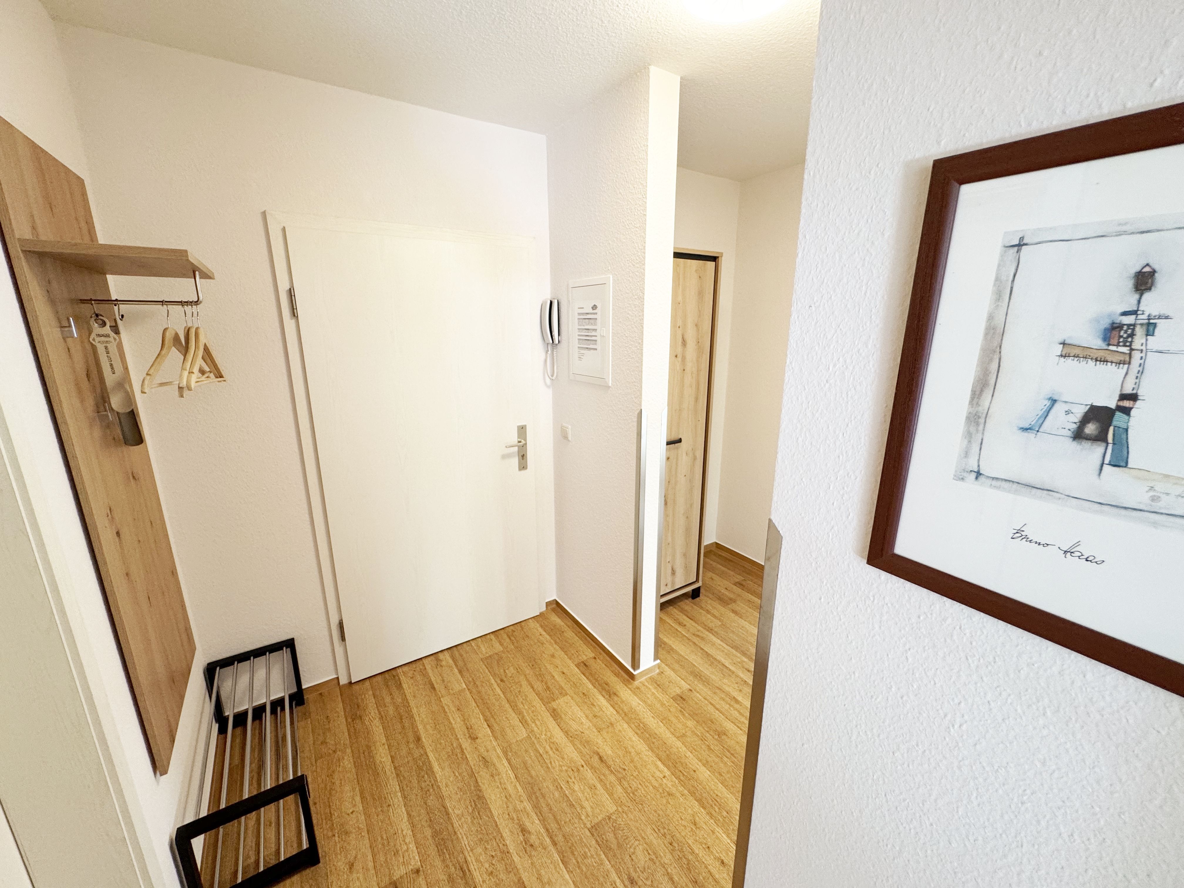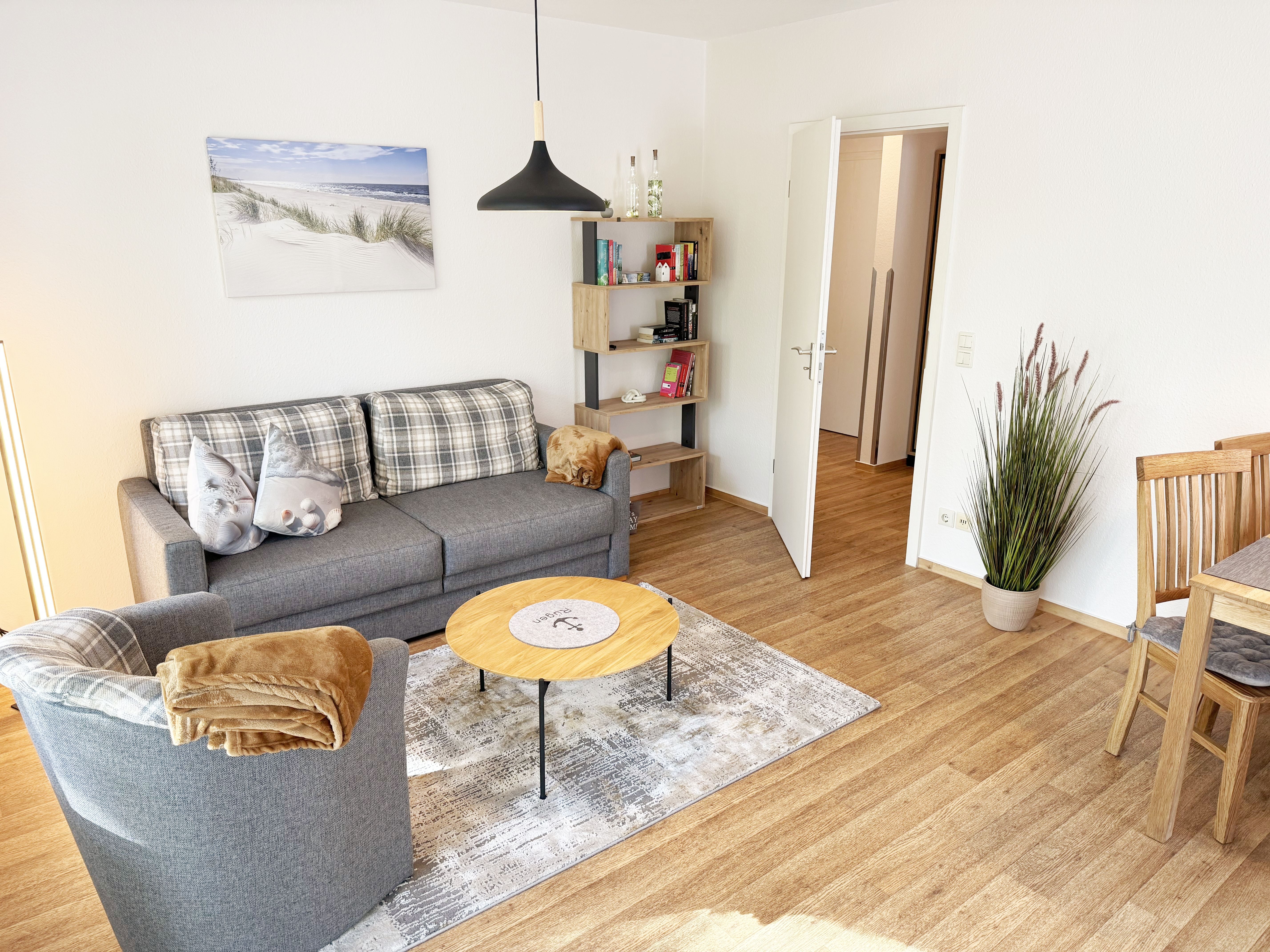 Die gemütliche ca. 52 m² große Nichtraucher-Oase der Ruhe liegt idyllisch im 1. Obergeschoss der Villa Störtebeker (Nr. 15) und bietet Ihnen für max. 2 bis 4 Personen, einen herrlichen Blick ins Grüne. Vom großen Flur aus, mit Garderobe, einem Spiegel und einem Schrank, gelangen Sie in alle Räume. Die in allen Räumen verwendeten Möbel und Accessoires strahlen Ruhe und Gemütlichkeit aus – perfekt, um dem Alltag zu entfliehen. Der großzügige, lichtdurchflutete Wohnbereich lädt mit einer Essecke, einer komfortablen Schlafcouch (1,60m x 2,00m, Aufbettung für 3./4. Person), einem Sessel, einen Relaxesessel, einer Stehlampe, einem TV-Board und einem 55-Zoll-Smart-TV zum Entspannen ein. Auch bei nicht so gutem Wetter kommt keine Langeweile auf: denn Spiele, ein DAB-Radio und eine Bücherecke sorgen für zusätzliche Unterhaltung. Ein kostenfreier WLAN-Zugang ist ebenfalls vorhanden. Stilvolle, teilweise dimmbare Lampen sorgen für eine Wohlfühlatmosphäre. Vom Wohnbereich gelangen Sie auf den 10 m² große, überdachten und nach Osten ausgerichteten Balkon, umgeben von Grün und Bäumen, ist es der perfekte Ort für entspannte Stunden.  Je nach Windrichtung können Sie auch das Meer zart rauschen hören. Die separate Küche ist komplett ausgestattet mit einem Cerankochfeld, einem Backofen, einem Geschirrspüler, einem Kühlschrank mit Eisfach, einer Spüle sowie weiteren Elektrogeräten wie einer Nespresso-Kaffeemaschine, einer Kaffeemaschine, einen Eierkocher, einem Wasserkocher, einem Toaster, einer Mikrowelle und einem Rührgerät/Mixer. Im geräumigen Schlafzimmer erwartet Sie ein erholsamer Schlaf in einem Doppelbett in Komforthöhe (1,80m x 2,00m) mit verstellbaren Lattenrosten. Nachttischablagen mit Beleuchtung, ein Herrendiener, ein Kleiderschrank und ein weiterer Flachbild-TV sind ebenfalls vorhanden. Die Verdunklungsmöglichkeit, sowie Insektenschutzgitter und die ruhige Lage sind beste Voraussetzungen für ruhige Nächte. Das innenliegende Badezimmer, mit einem WC, einer Dusche, einem Fön, einem Kosmetikspiegel und einem Waschplatz, bietet Ihnen den täglichen Komfort. Eine Waschmaschine und ein Trockner stehen gegen Gebühr im Waschraum zur Verfügung. Haustiere sind nicht erlaubt. Ihre Fahrräder können Sie im gemeinschaftlichen, abschließbaren Fahrradhäuschen hinter dem Haus oder im abschließbaren Keller des Hauses abstellen. Ihr PKW-Stellplatz (Nr. 15) befindet sich direkt vor dem Haus. Die Erstausstattung eines Wäschepaketes (komplette Bettwäsche, 1 Duschhandtuch, 1 kleines Handtuch) können Sie bis 14 Tage vor Anreise gegen Aufpreis dazu buchen oder durch eigene Ergänzen. Ab 2 gebuchten Paketen erhalten Sie einmalig 1 Geschirrhandtuch und 1 Duschvorleger dazu.
