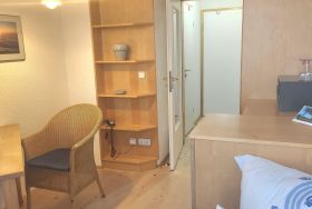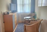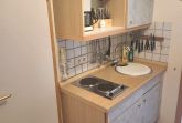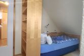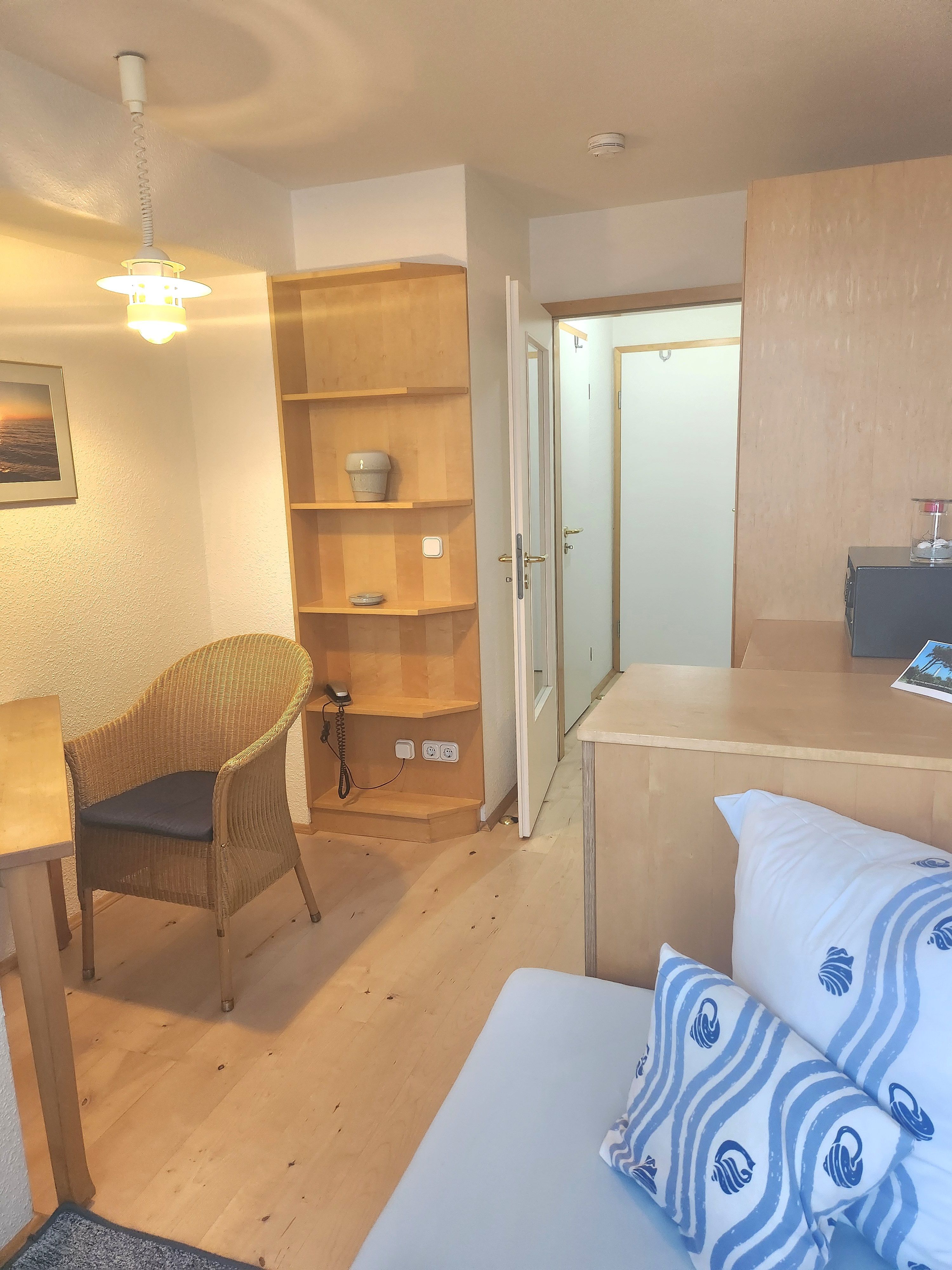 Diese charmante, ca. 23 m² große Dachgeschosswohnung bietet alles, was man für einen erholsamen Aufenthalt zu zweit braucht. Der kombinierte Wohn- und Schlafraum ist mit zwei getrennt stehenden Betten ausgestattet und überzeugt durch seine besondere Atmosphäre mit Dachschrägen und einem markanten Dachbalken.