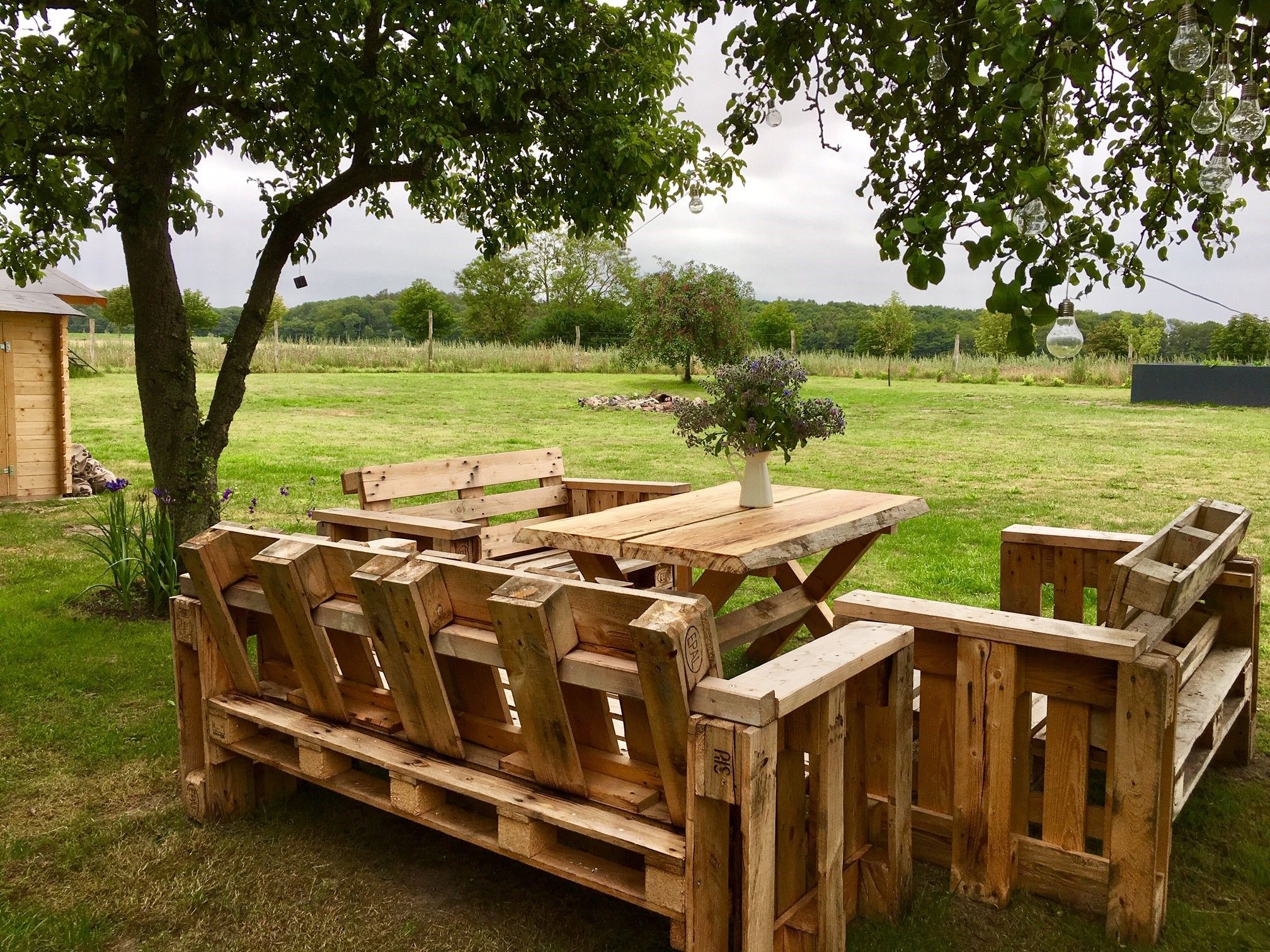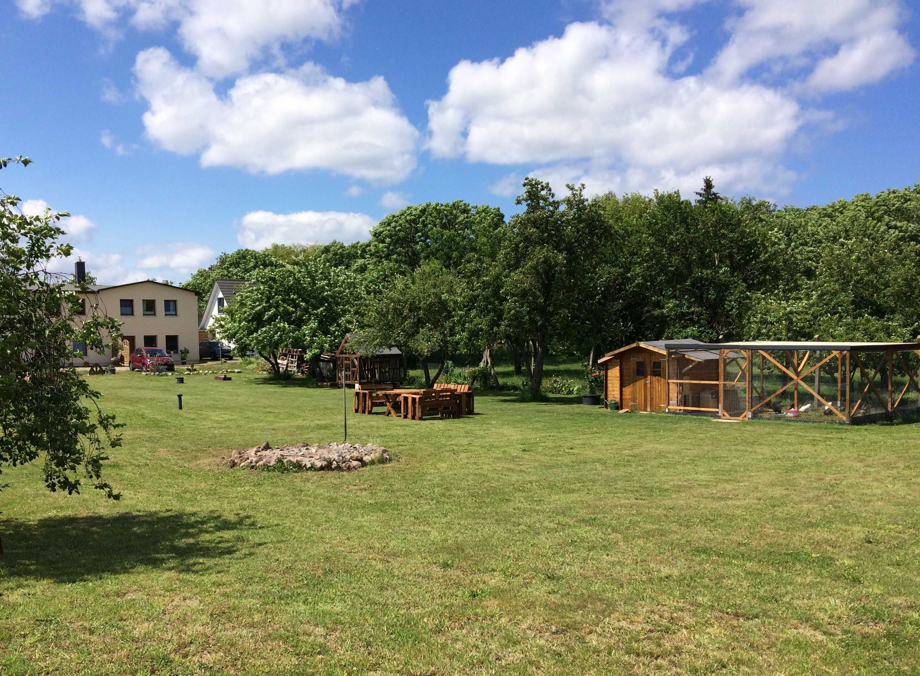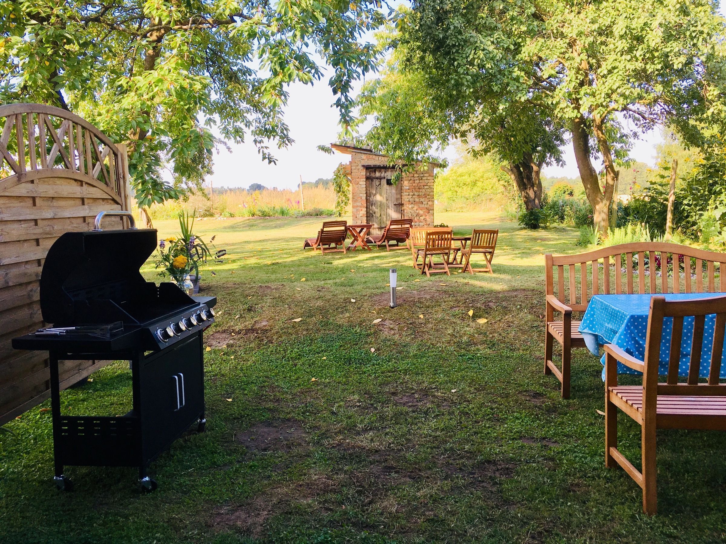 Im weitläufigen Garten des Landhauses mit alten Obstbäumen, separaten Sitzecken mit Grill und Kinder-Gartenhaus für Kinder findet sich genug Raum für Entspannung und Spiel.
