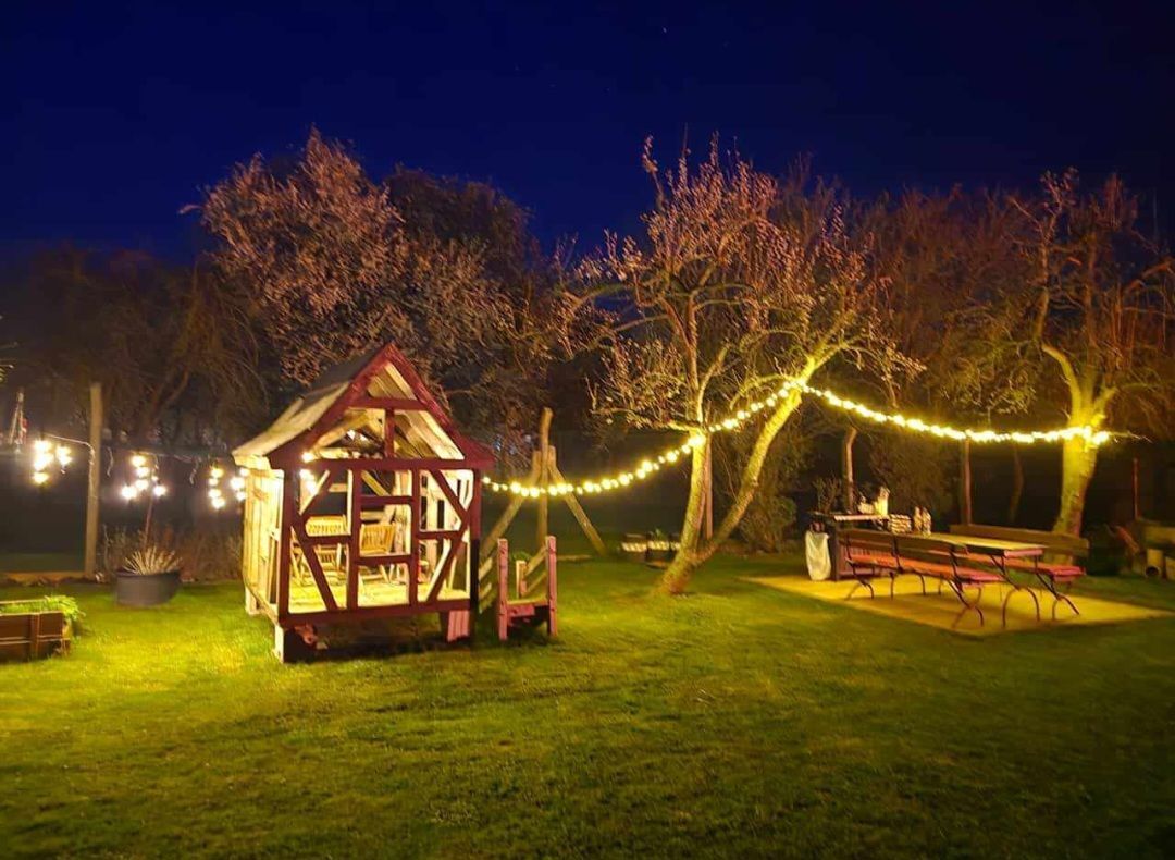Im weitläufigen Garten des Landhauses mit alten Obstbäumen, separater Sitzecke mit Grill und Feuerschale, sowie ein Fachwerkhäuschen für Kinder findet sich Raum für Entspannung und Spiel. Ein PKW-Stellplatz mit Lademöglichkeit für Elektroautos (11KW) befindet sich direkt gegenüber vom Landhaus.