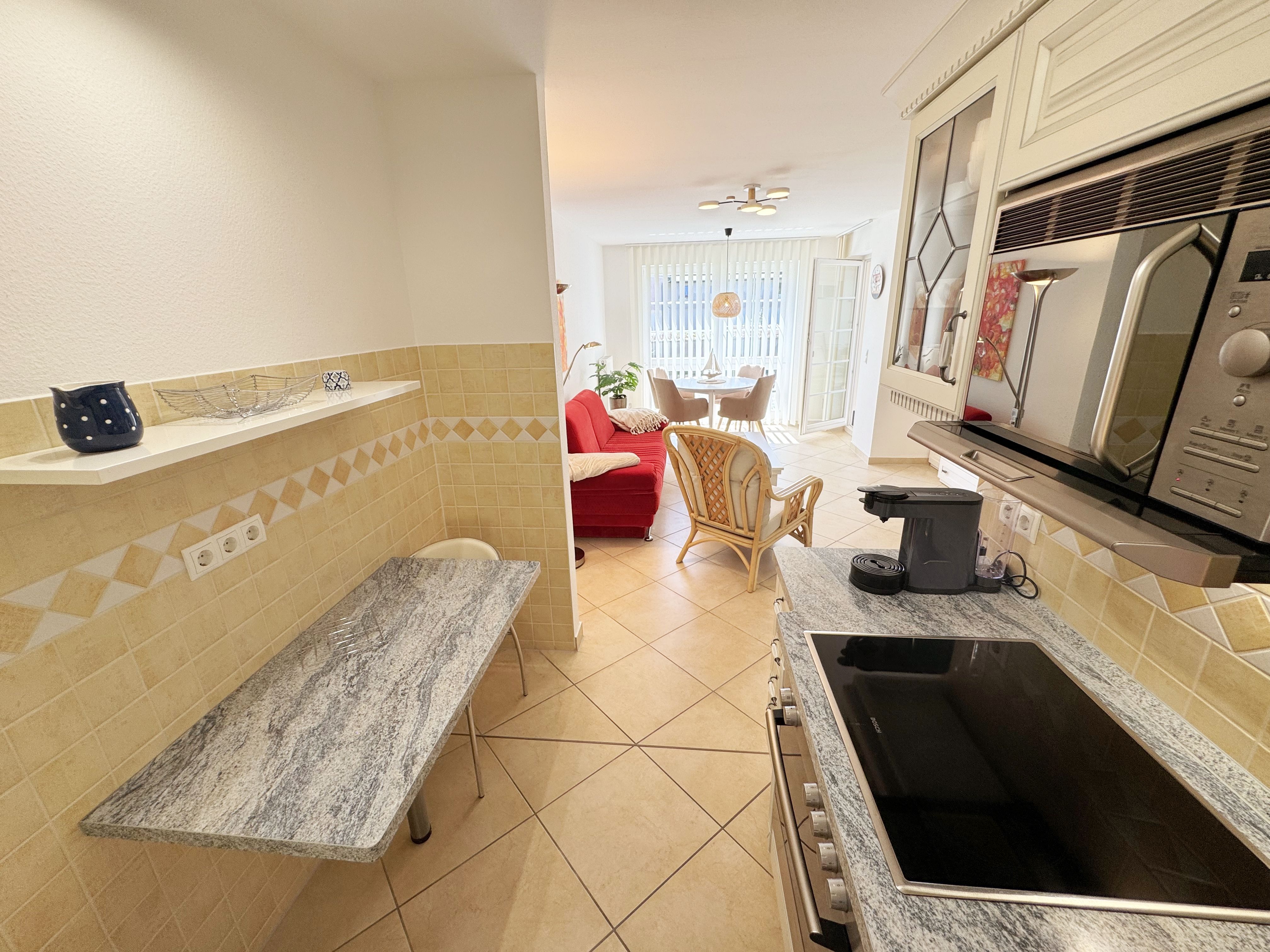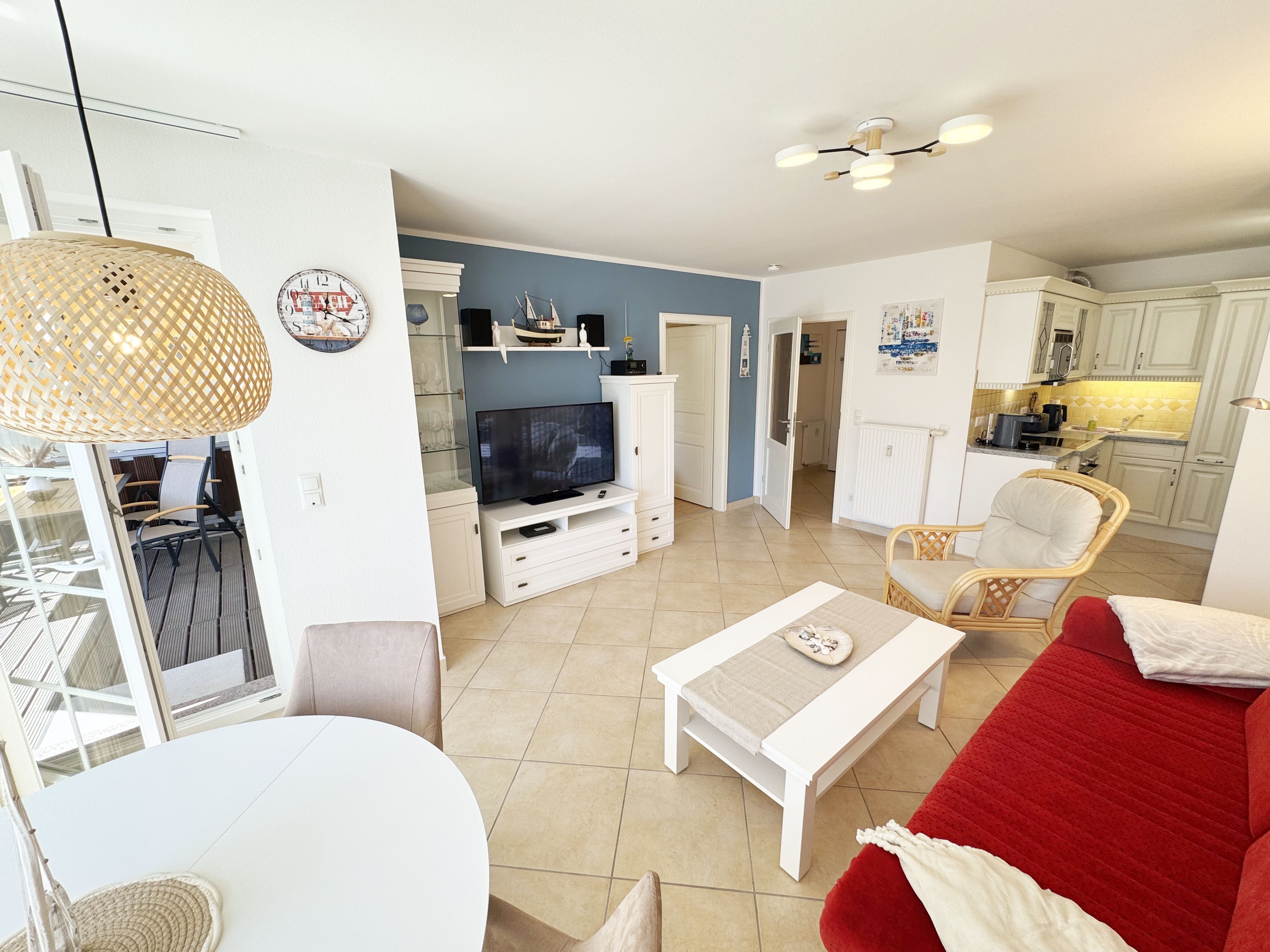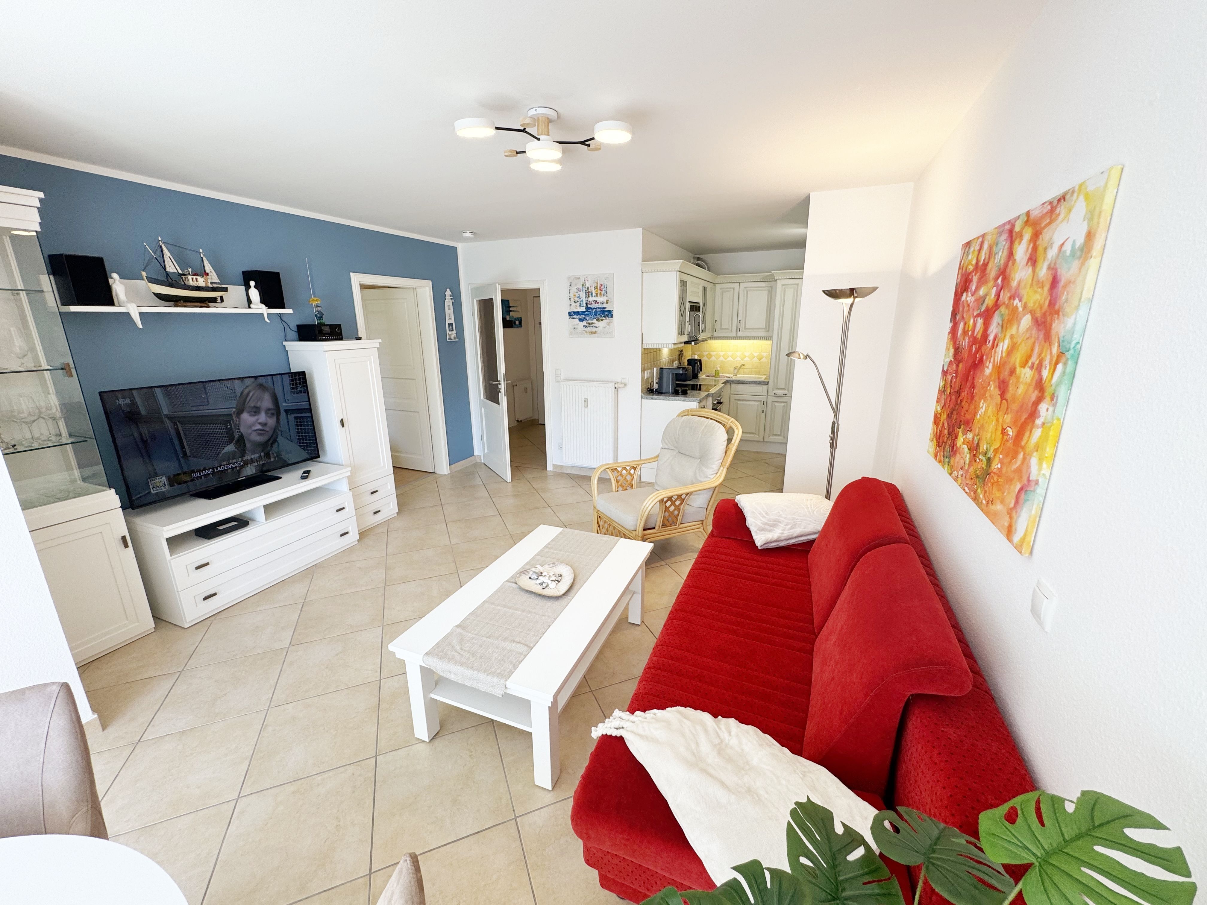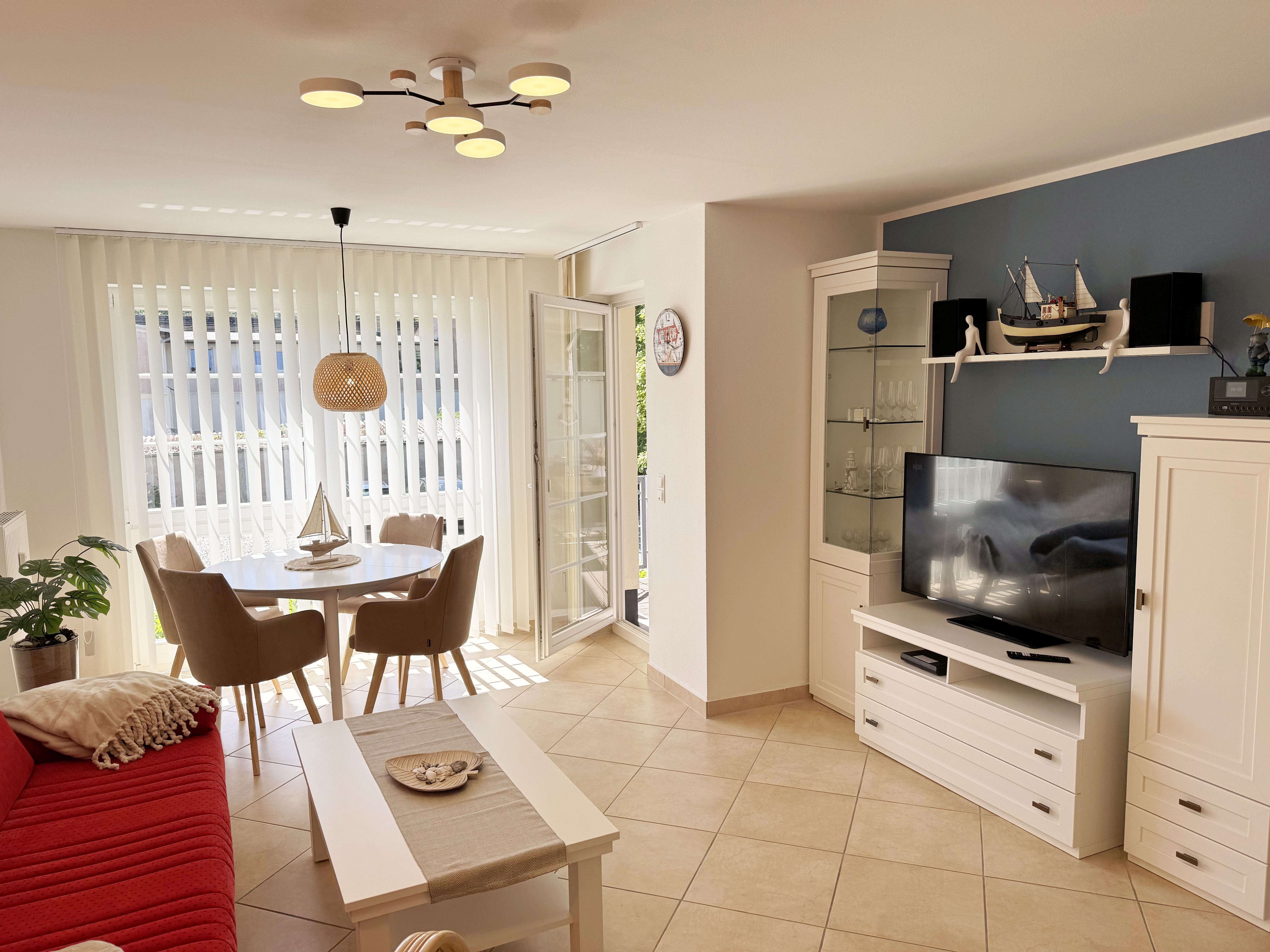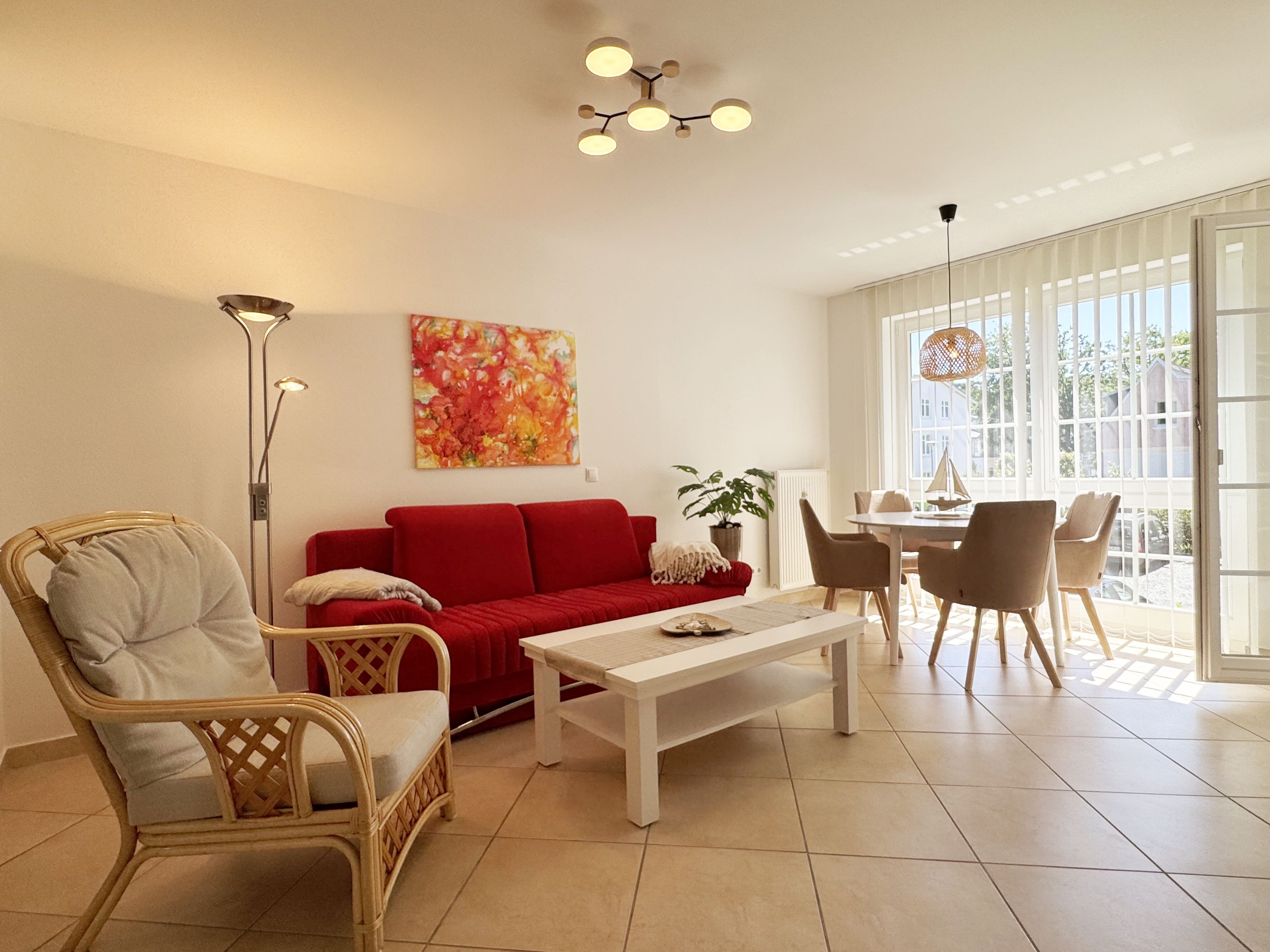 Herzlich Willkommen in unserer liebevoll eingerichteten 2-Zimmer-Wohnung (Nr.06) mit überdachtem Balkon im ersten Obergeschoß des modernen Apartmenthauses Villa Mara im schönen Ostseebad Baabe! Mit ca. 52 qm bietet die lichtdurchflutete Nichtraucherwohnung eine angenehme Atmosphäre und ist perfekt für max. 2 - 3 Personen. Der Wohnbereich ist mit einer Schlafcouch (Aufbettungsmöglichkeit 3. Person, 1,56m x 2,00m), einem Couchtisch, einem Sessel, einer Leselampe, einer Anrichte mit einem Smart-TV und einer Internet/DAB-Stereo-Anlage ausgestattet. Mit einer kleinen Auswahl an Gesellschaftsspielen und spannenden Büchern können Sie auch hier entspannte Stunden verbringen. Abgerundet wird der Bereich mit einem Essplatz am Fenster. Die angrenzende offene Wohnküchenzeile verfügt über einen kleinen Esstisch, ein Cerankochfeld, einen Backofen, eine Mikrowelle, einen Kühlschrank mit Gefrierfach, einen Geschirrspüler, einen Pürierstab, eine kombinierte Kaffeefilter/Senseo-Pad-Maschine mit Thermoskanne, einen Wasserkocher und einen Toaster. Ebenso sind die nötigen Küchenutensilien vorhanden, sodass Sie hier bequem selbst kochen können. Der sonnige und bestuhlte Südbalkon ist sowohl vom Wohnbereich als auch vom Schlafzimmer zugänglich und lädt zum Frühstücken ein oder um gemütliche Abende ausklingen zu lassen und gleichzeitig die frischen Ostseeluft in vollen Zügen zu genießen. Das Schlafzimmer bietet Ihnen ein bequemes Doppelbett (1,80m x 2,00m), verstellbare Lattenroste, Nachttischablagen mit Beleuchtung, Kleiderablage, einen geräumigen Kleiderschrank und einen Smart-TV. Das geräumige innenliegende Badezimmer ist komfortabel mit einer Fußbodenheizung, einem WC, einem Fön, einem Kosmetikspiegel und einer ebenerdigen Dusche ausgestattet. Haustiere sind in der Wohnung nicht erlaubt. Im vorhandenen Abstellraum welcher sich zusätzlich in der Wohnung befindet, finden Sie unteranderem Reinigungsutensilien ein Bügelbrett, ein Bügeleisen und ein Kinderreisebett für unsere kleinen Gäste. Der weitläufige Außenbereich mit altem Baumbestand und Grillplatz lädt zum Verweilen an der frischer Ostseeluft ein. Dort befindet sich auch eine geschützte Unterstellmöglichkeit für Ihre mitgebrachten Fahrräder. Ein PKW-Stellplatz (Nr.06) befindet sich direkt hinter dem Haus. Die Erstausstattung eines Wäschepaketes (komplette Bettwäsche, 1 Duschhandtuch, 1 kleines Handtuch) können Sie bis 14 Tage vor Anreise gegen Aufpreis dazu buchen oder durch eigene ergänzen. Ab 2 gebuchten Paketen erhalten Sie einmalig 1 Geschirrhandtuch und 1 Duschvorleger dazu. Wir wünschen Ihnen eine erholsame Zeit im Ostseebad Baabe und würden uns freuen, Sie wieder als Gäste begrüßen zu dürfen.