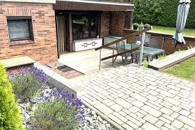 Zusätzlich gibt es 2 Schlafzimmer, 1 Zimmer ist mit Doppelbett ( 1,80 x 2,00 m ) und abgeteiltem Ruhe- Leseraum und das andere Zimmer mit einer Schlafcouch ( 1,60 x 2,00 m ) und einem LED- Flachbild Fernseher ausgestattet. Im Bad gibt es WC und Dusche. Vor der Wohnung haben Sie eine offene Terrasse für sonnige Stunden zur Verfügung. Ein PKW- Stellplatz ist auf dem Grundstück ebenfalls vorhanden.