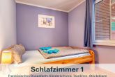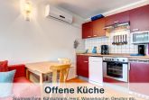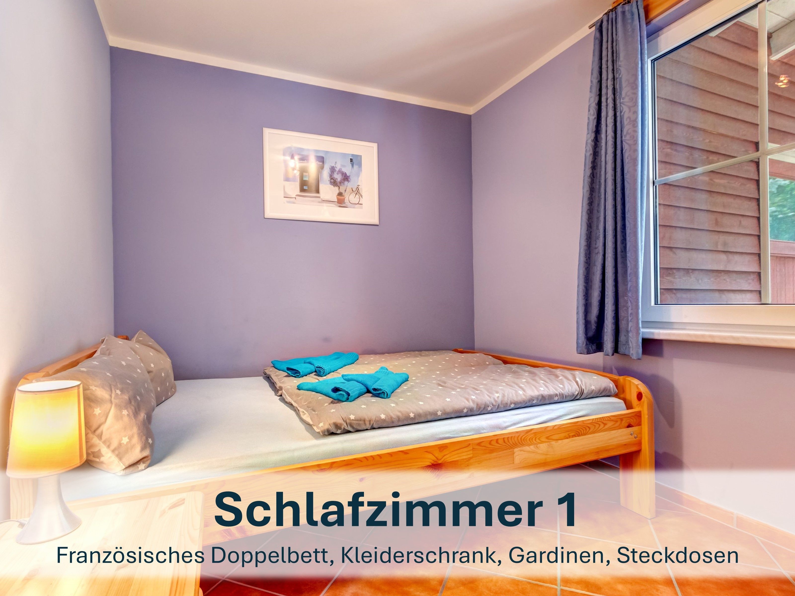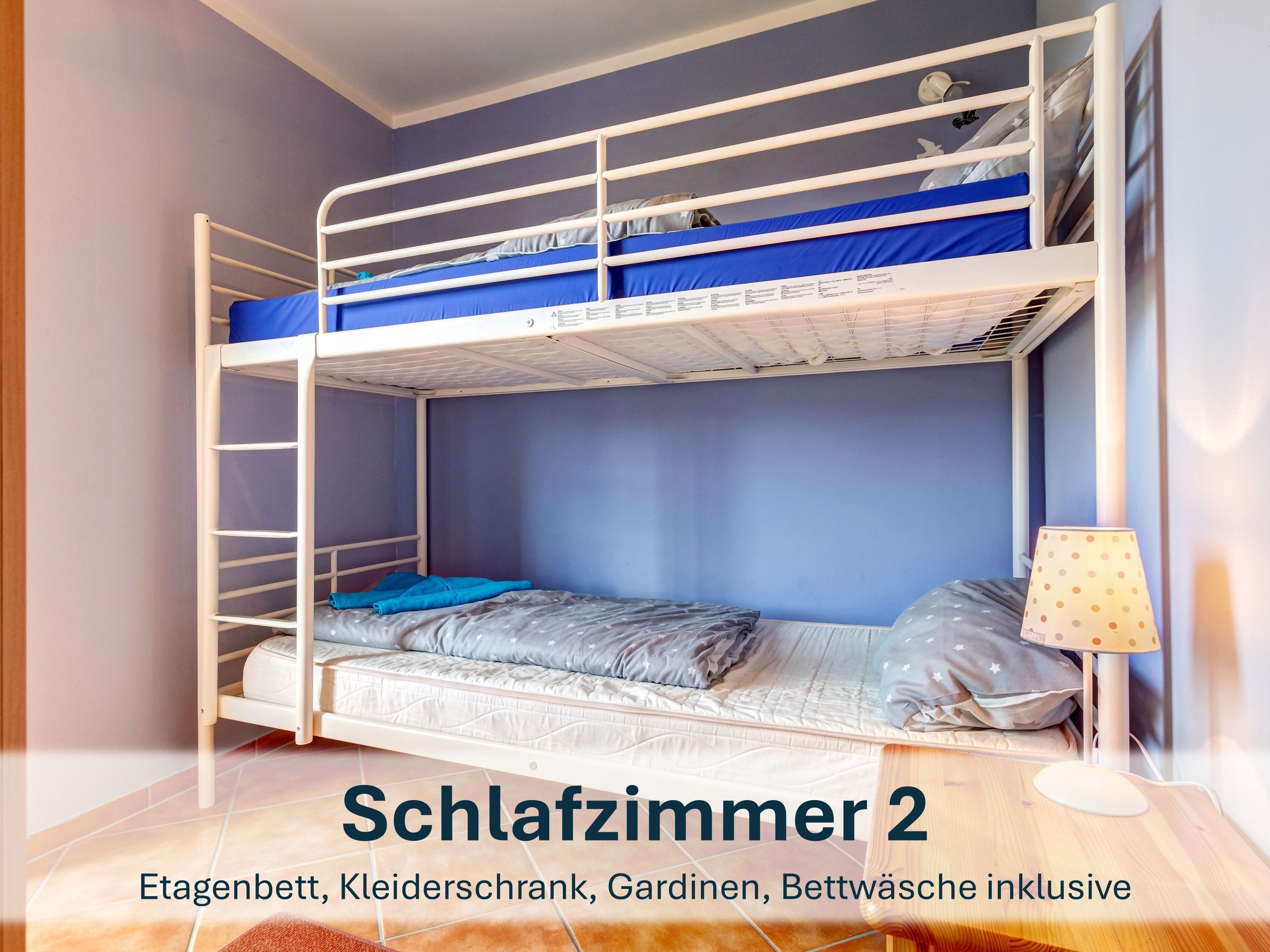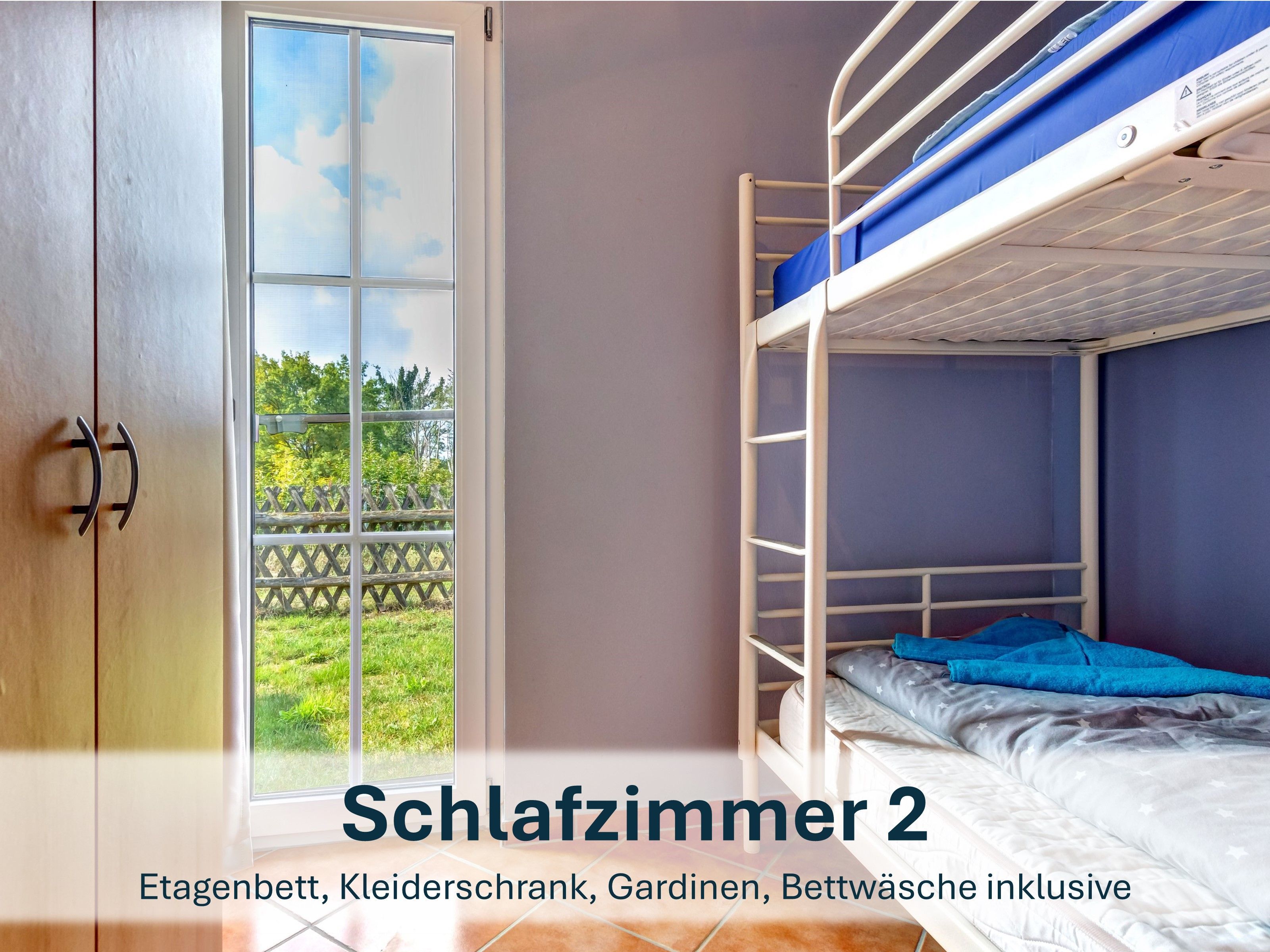 Außerdem findet man im Anschluss eine offene, gut ausgestattete Küche. Das erste Schlafzimmer ist mit einem Doppelbett (140cm Breite) ausgestattet, im zweiten befindet sich ein Etagenbett.