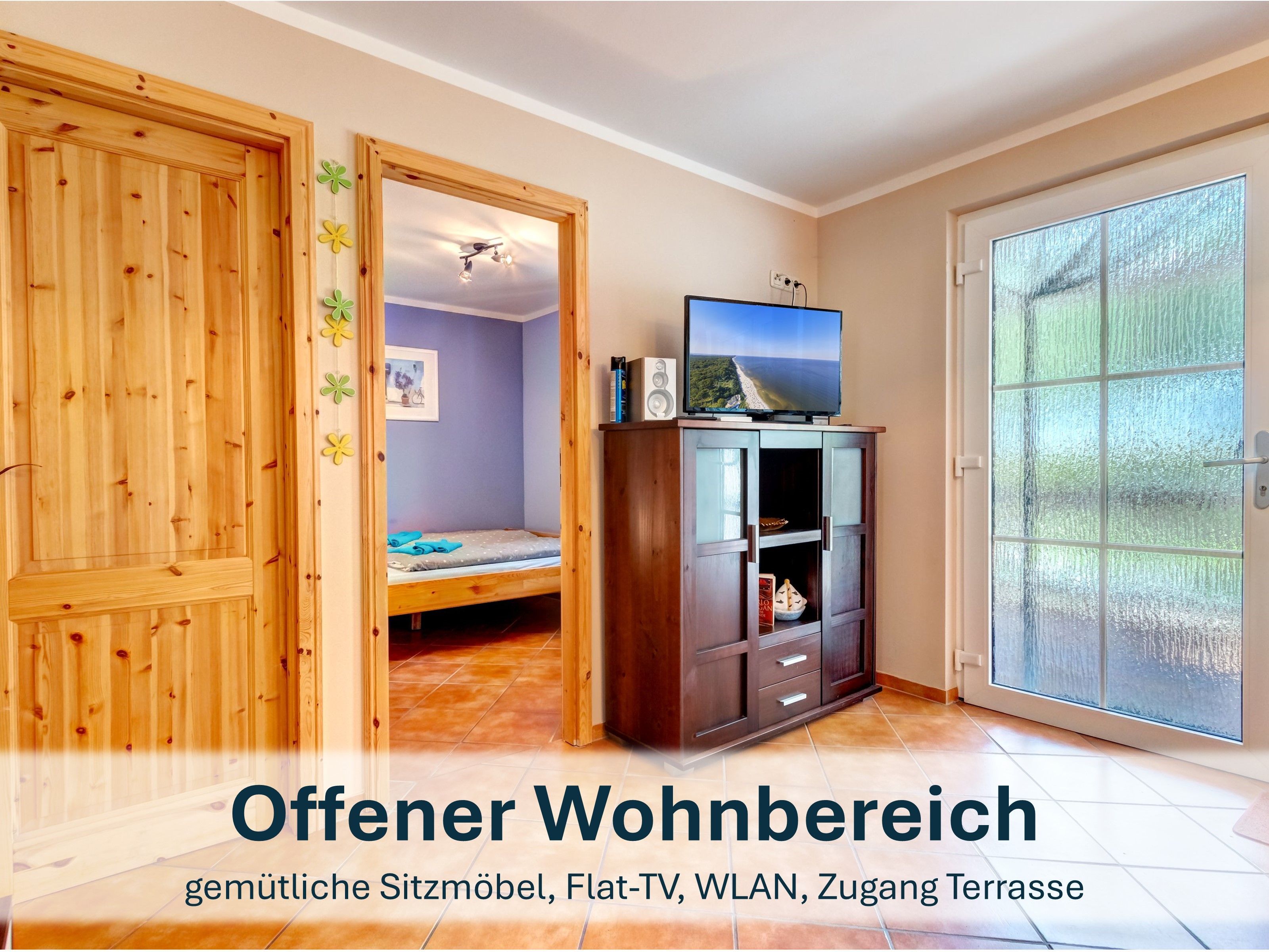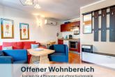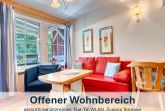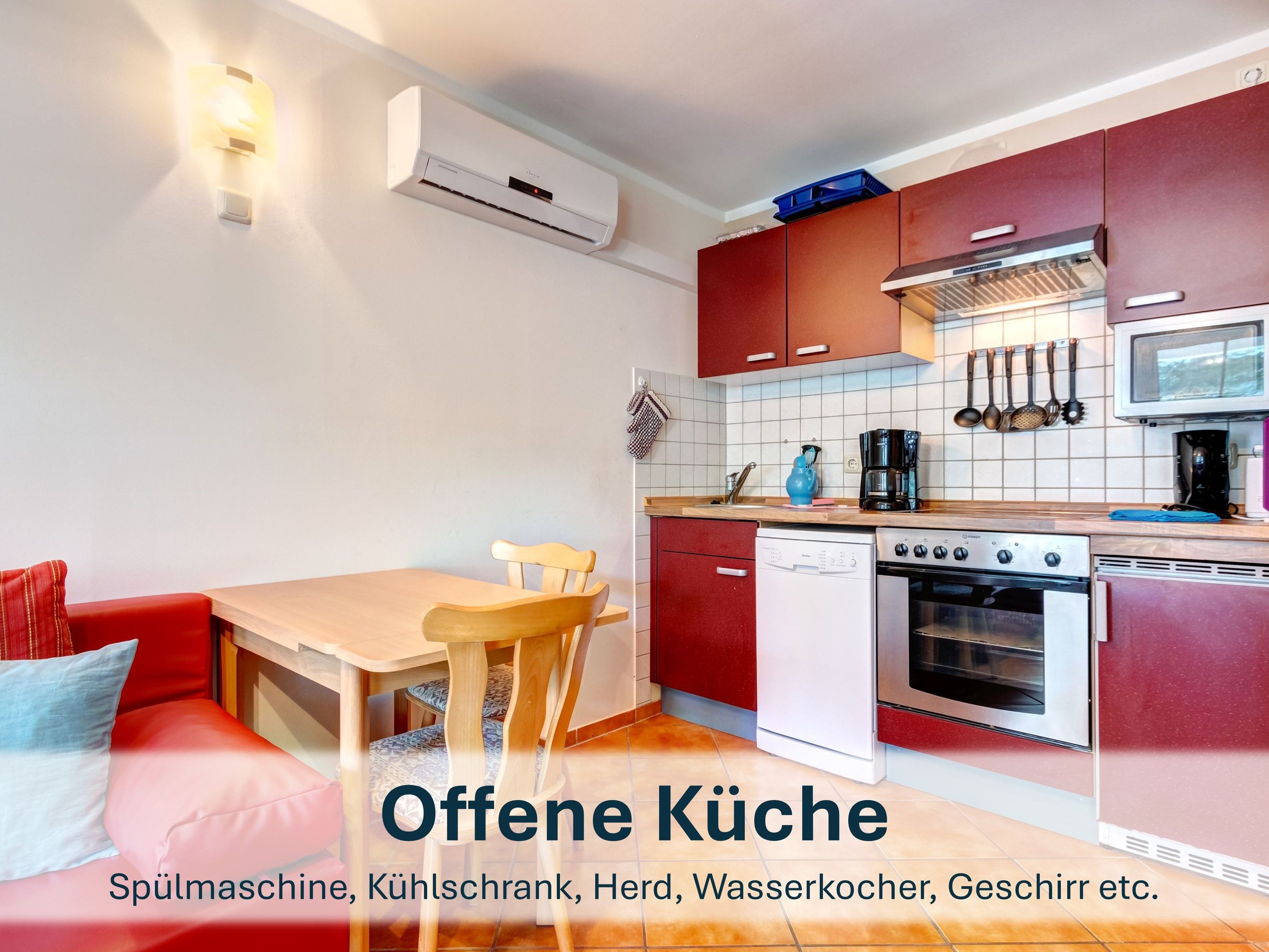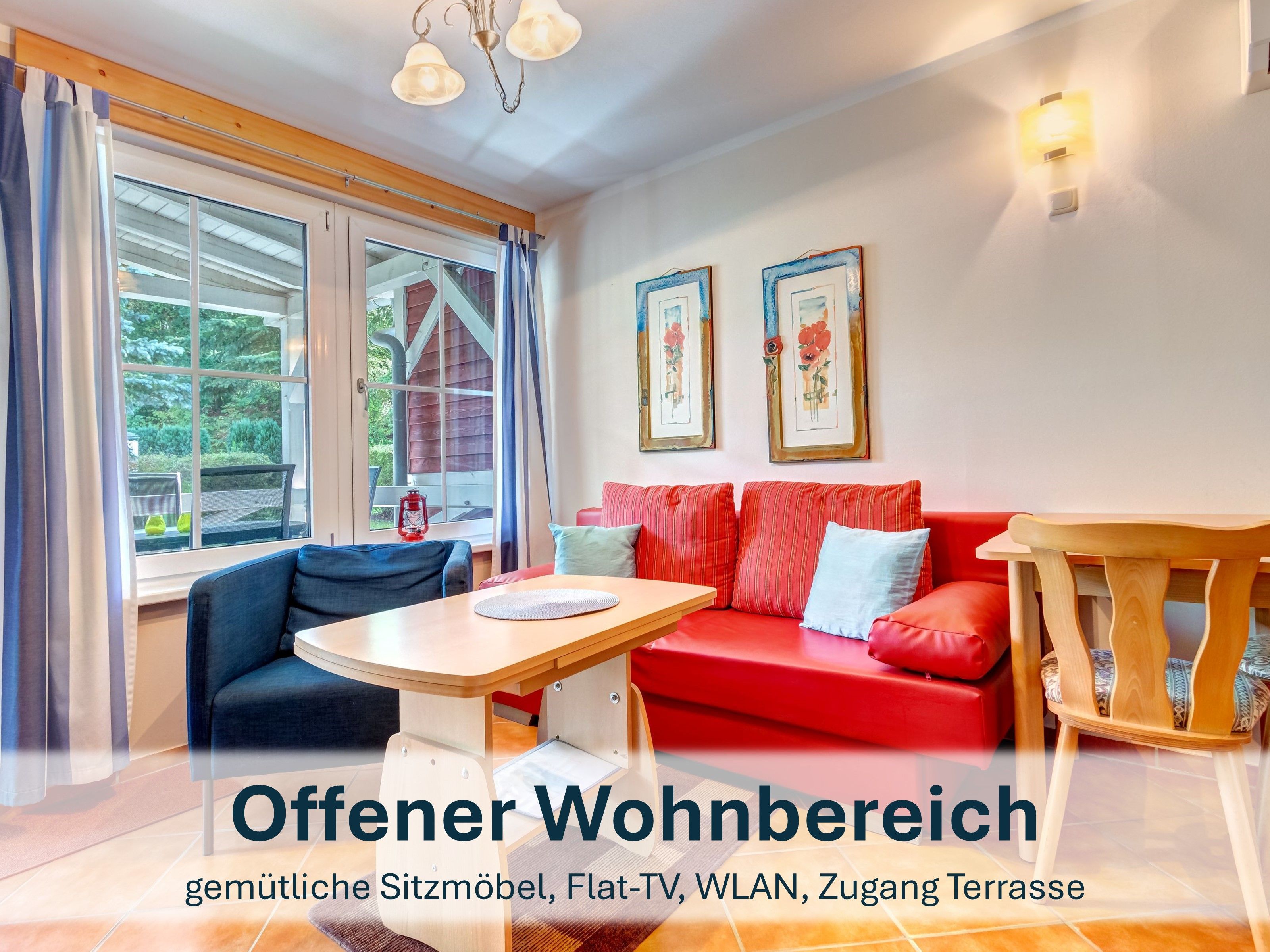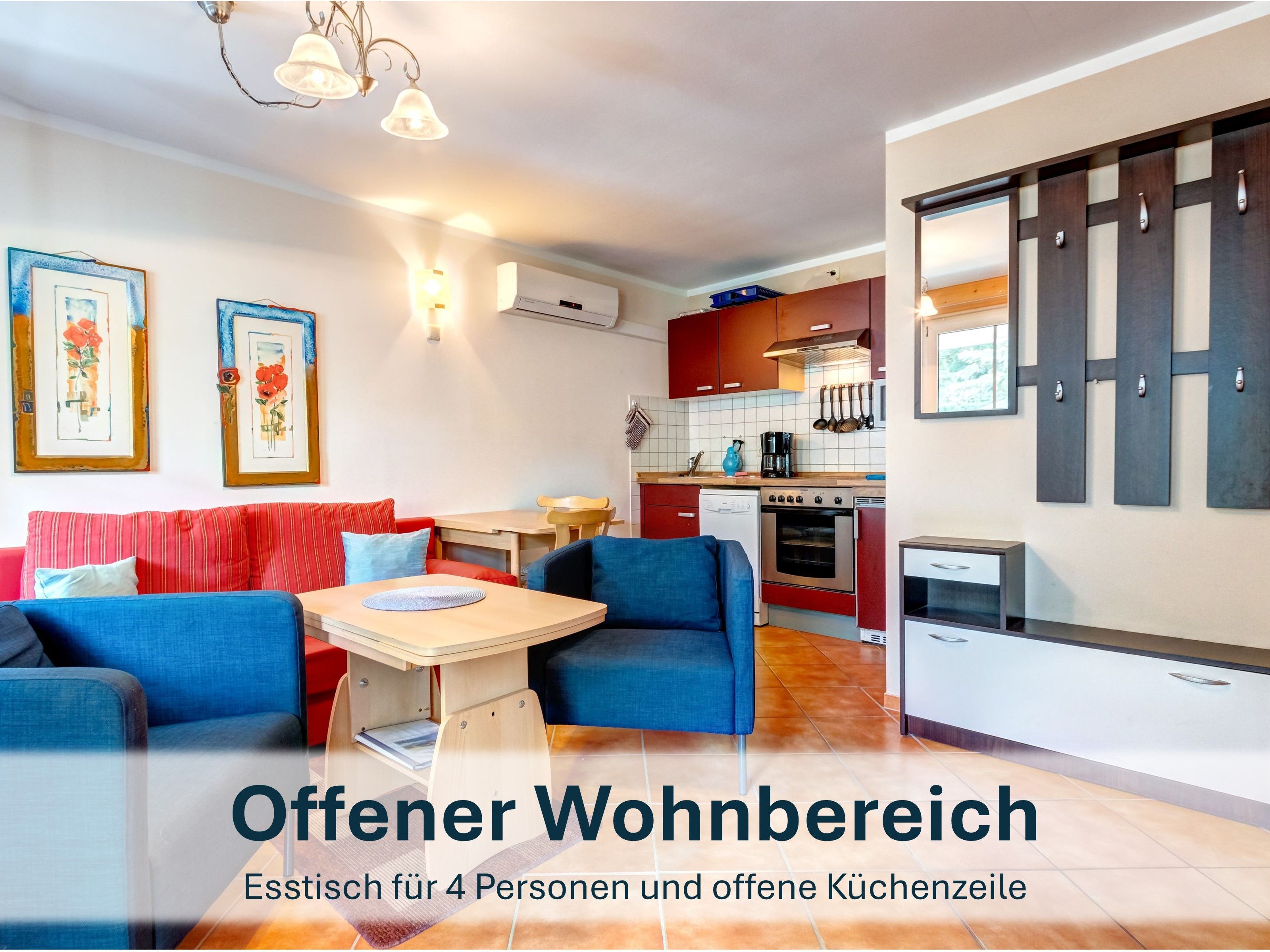 Der Wohnbereich zeichnet sich durch seine geschmackvolle Einrichtung mit Sofa, Tisch und Sessel und einem Regal mit TV und Radio aus. Vollendet wird das Bild durch einen mit als Garderobe nutzbaren Schrank. Daran schließt sich die voll ausgestattete, offene Küchenzeile an.
