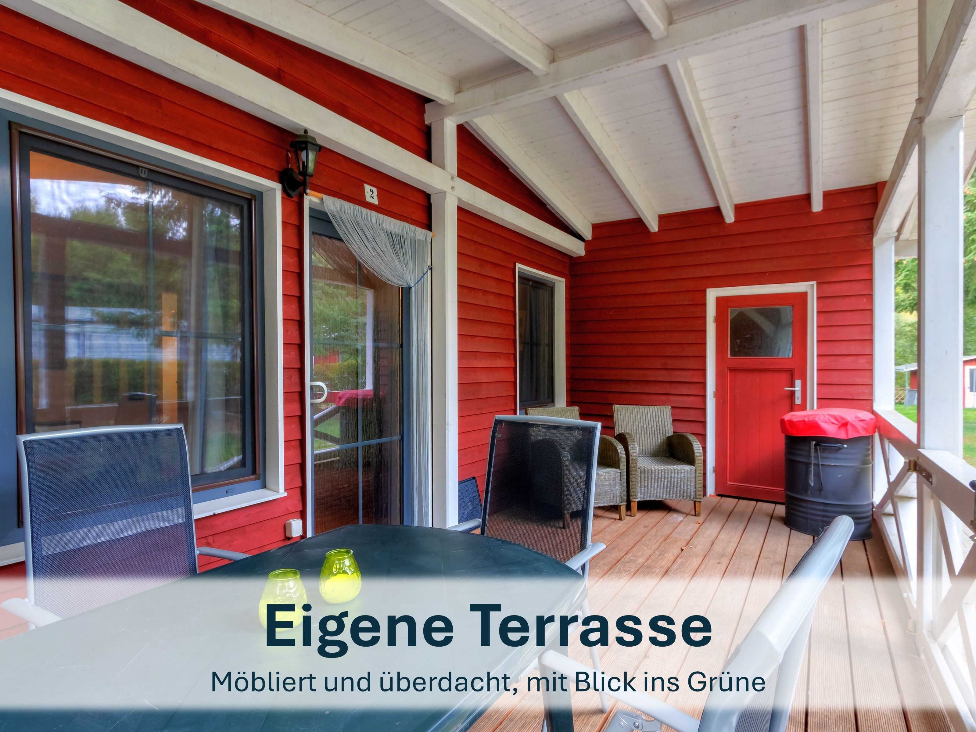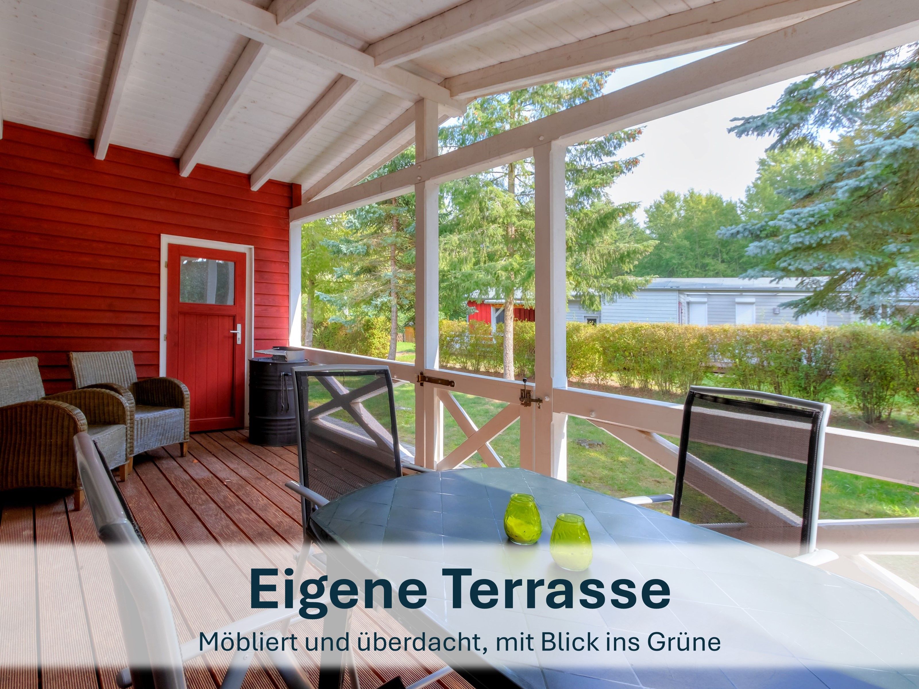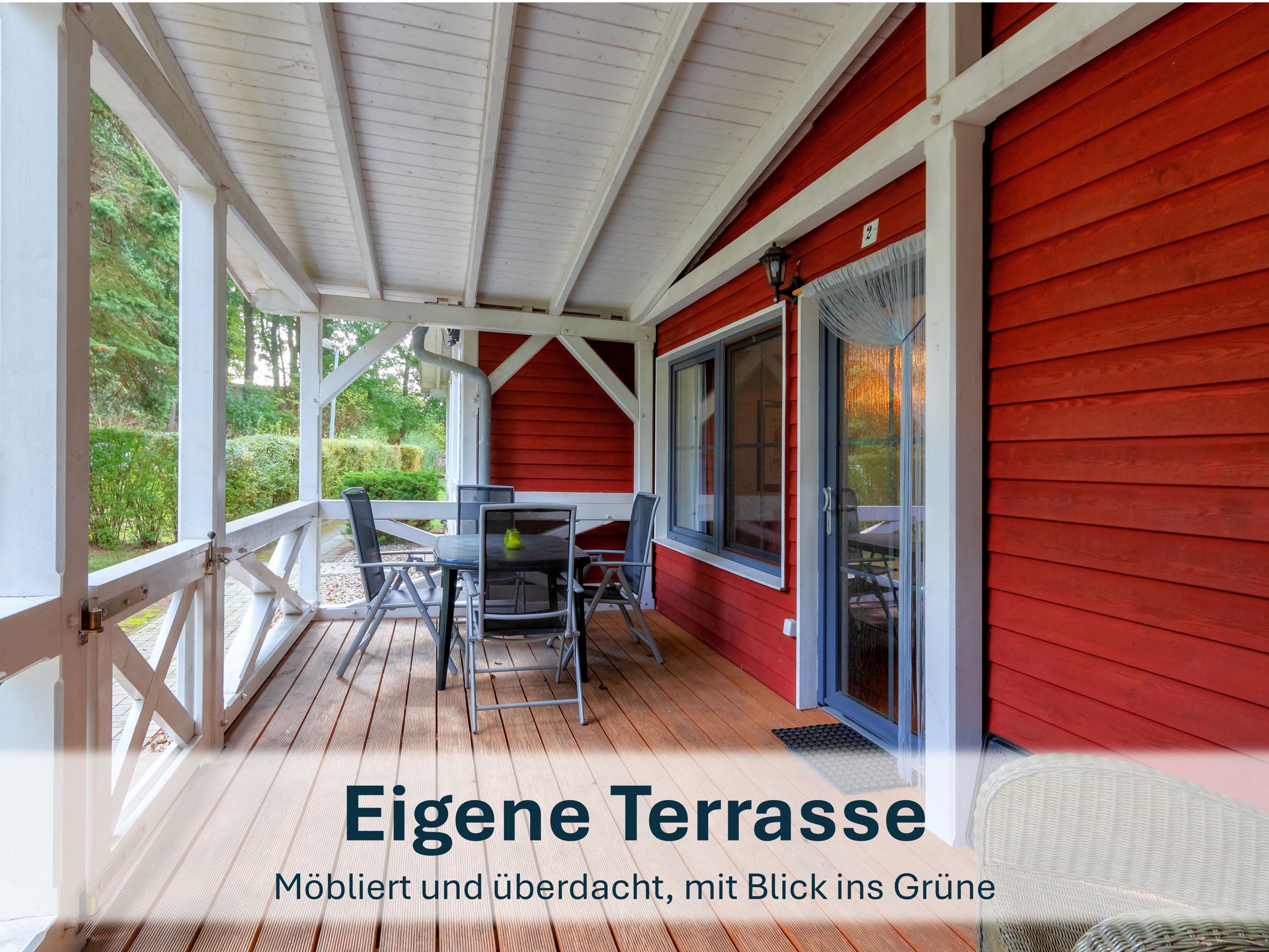 Jeder Bungalow verfügt über eine überdachte, möblierte Terrasse sowie einen abschließbaren Abstellraum.