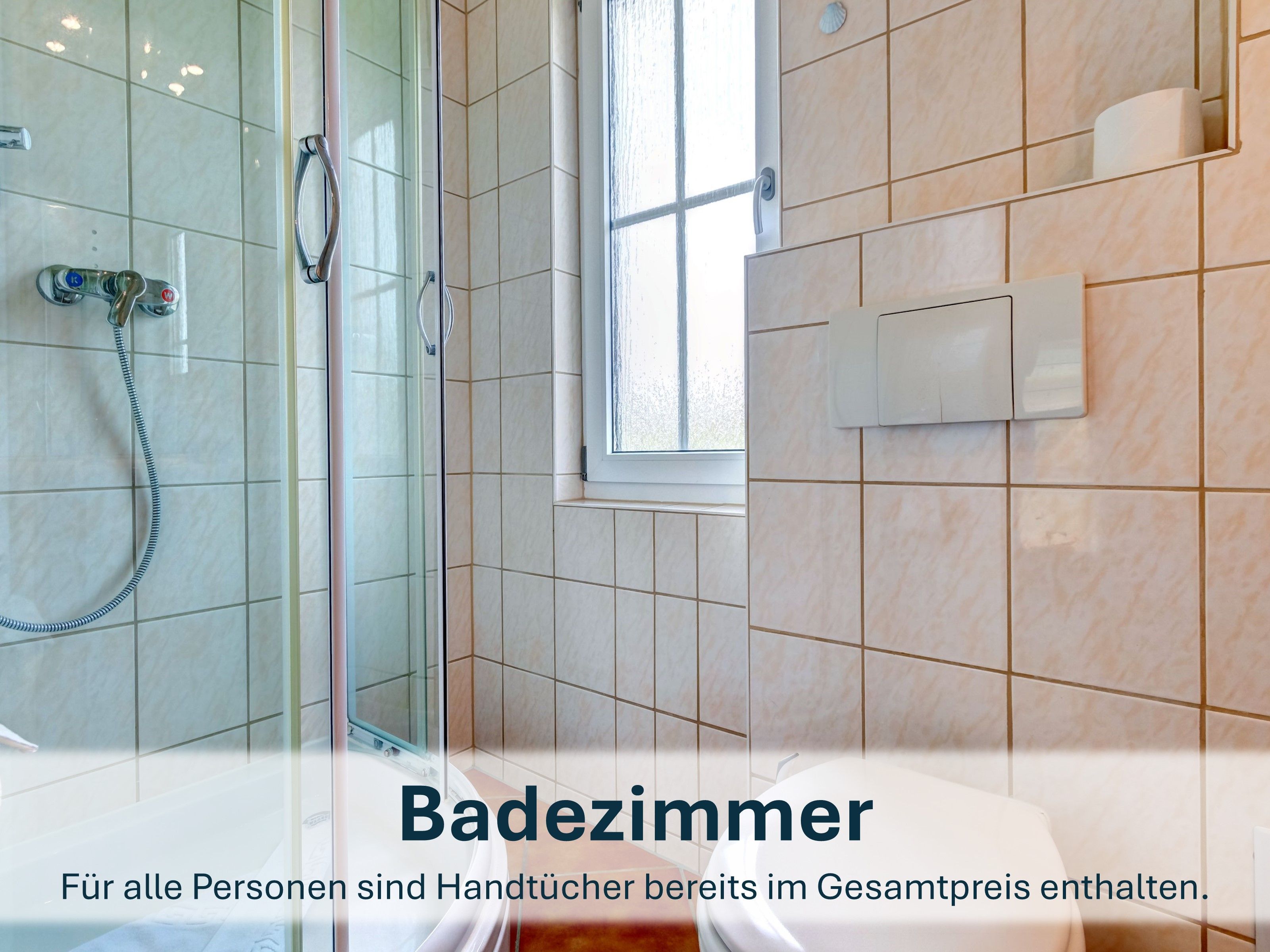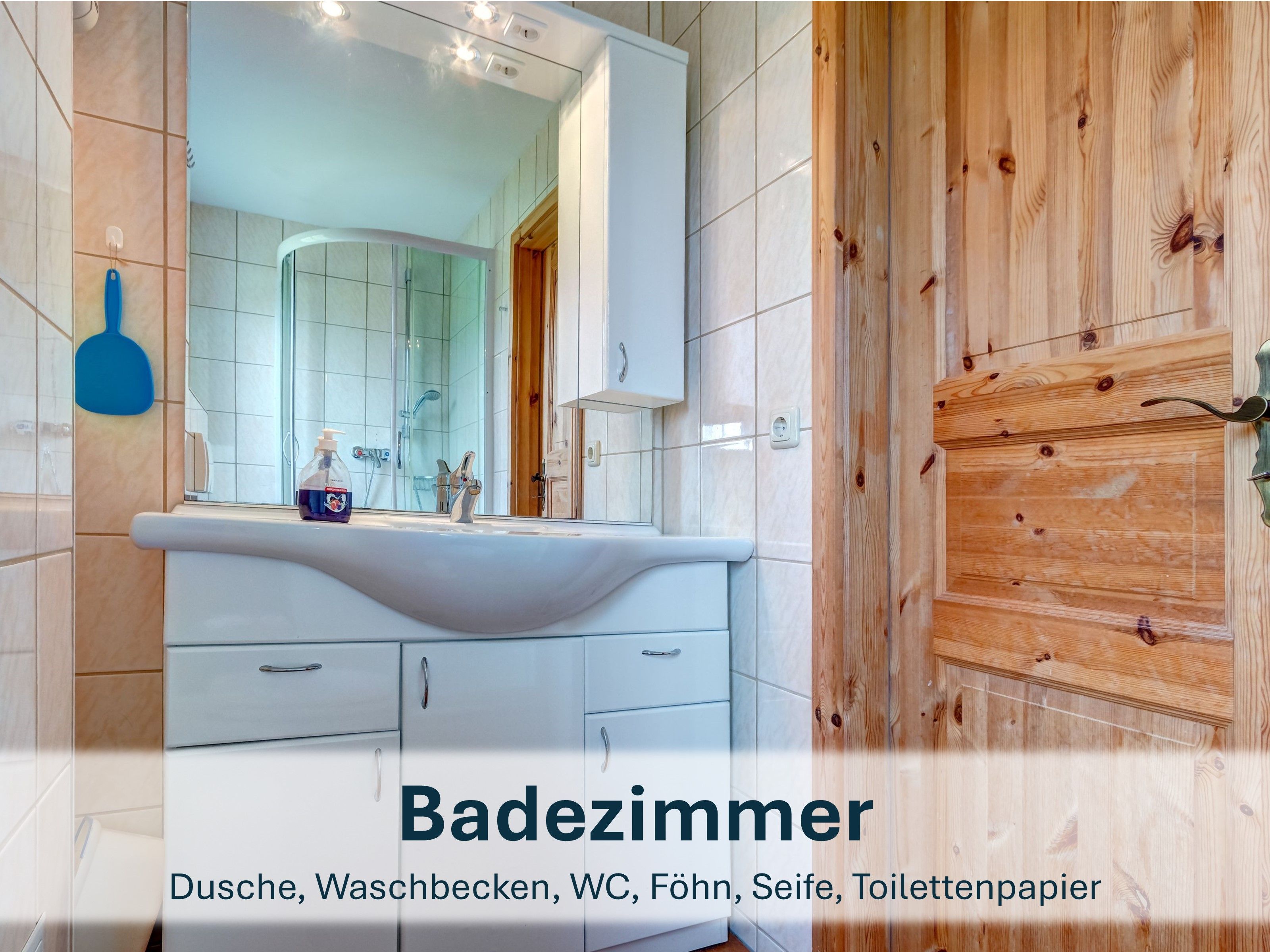 Ein kleines, zweckmäßig eingerichtetes Bad komplettiert den Bungalow. Sie finden dort eine Dusche, ein WC sowie ein Waschbecken mit Spiegelschrank und Regal.