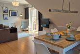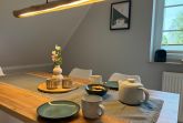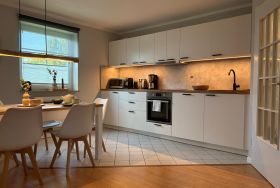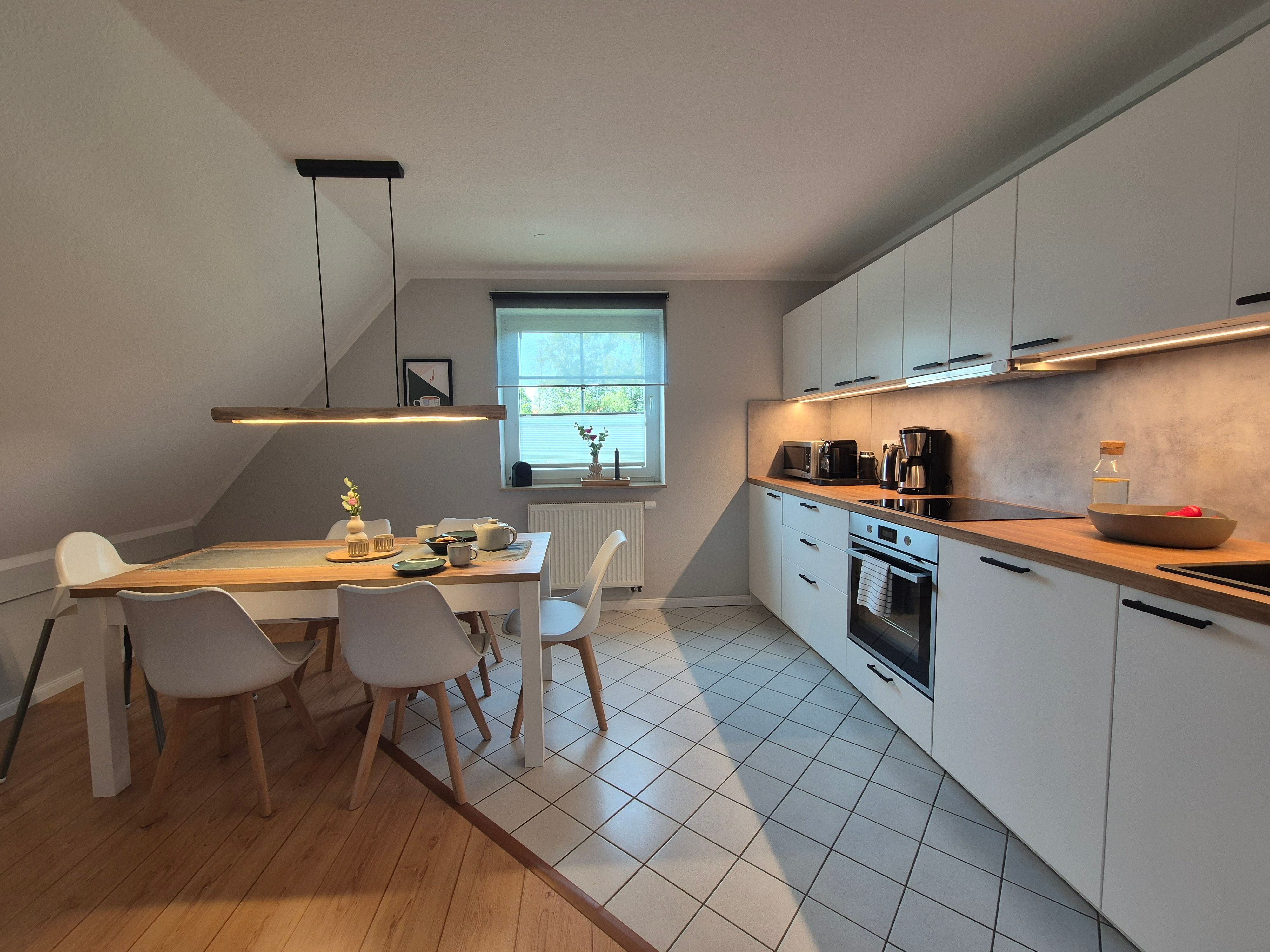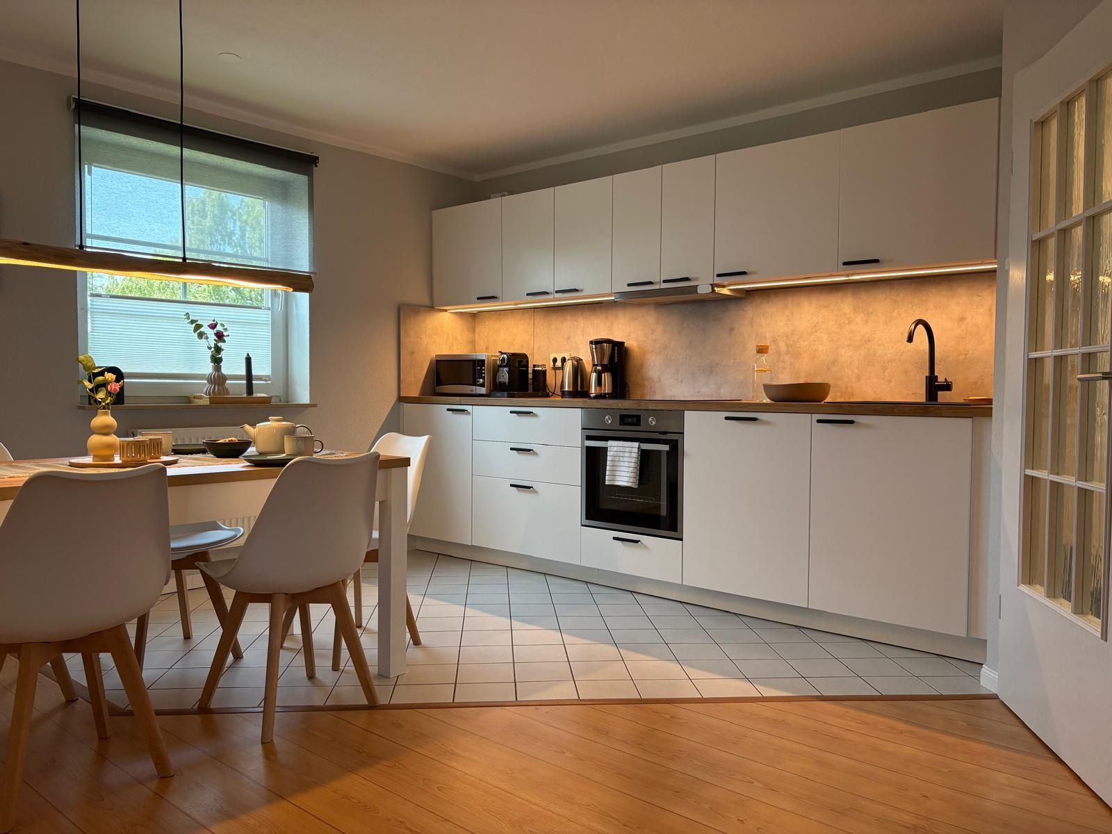 Der stilvoll eingerichtete Wohn-Ess-Bereich mit Blick ins Grüne lädt zum Entspannen und Genießen ein. Die offene Einbauküche ist komplett ausgestattet mit Induktionsherd, Backofen, Wasserkocher, Toaster, Filterkaffeemaschine, Nespresso-Maschine, Milchschäumer, Kühlschrank mit Gefrierfach und Mikrowelle.