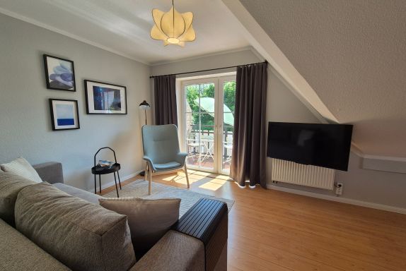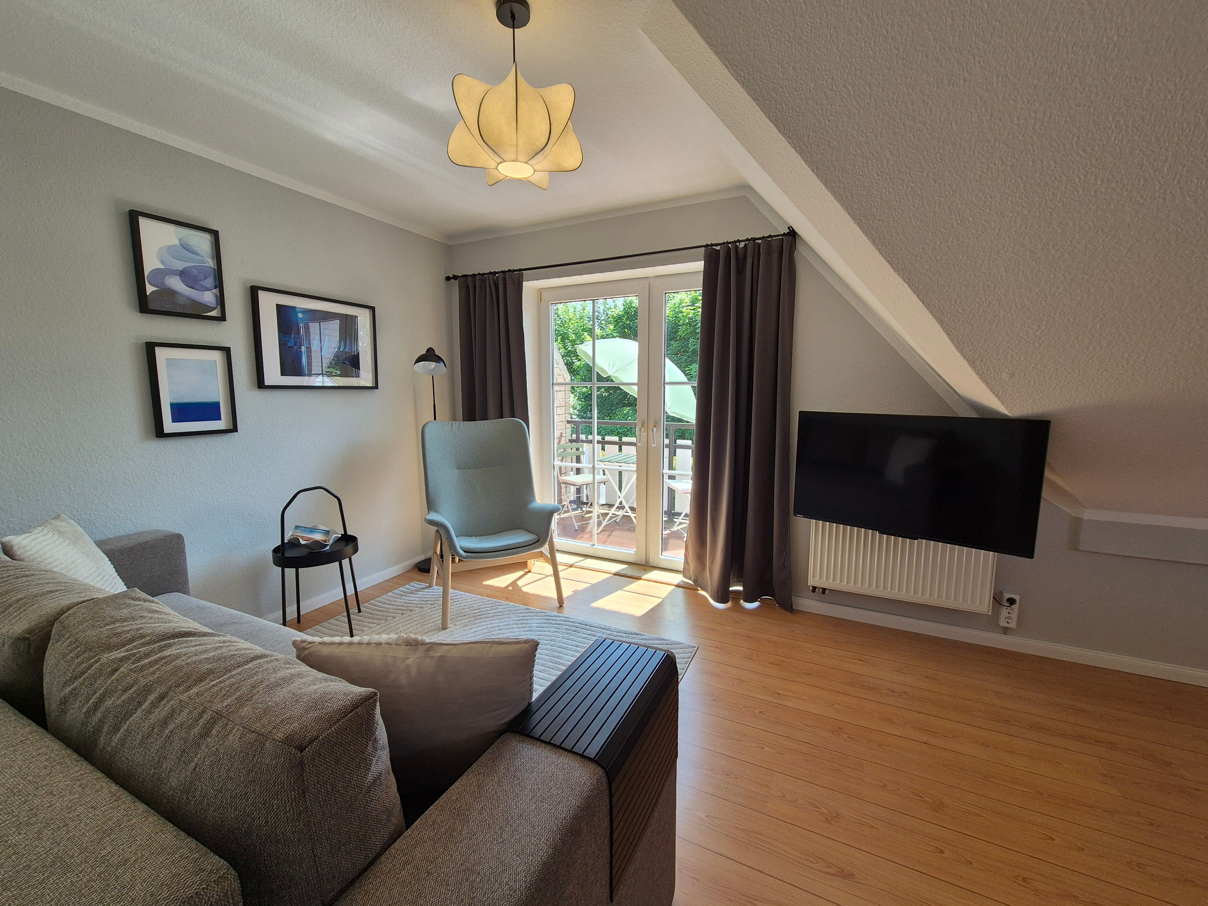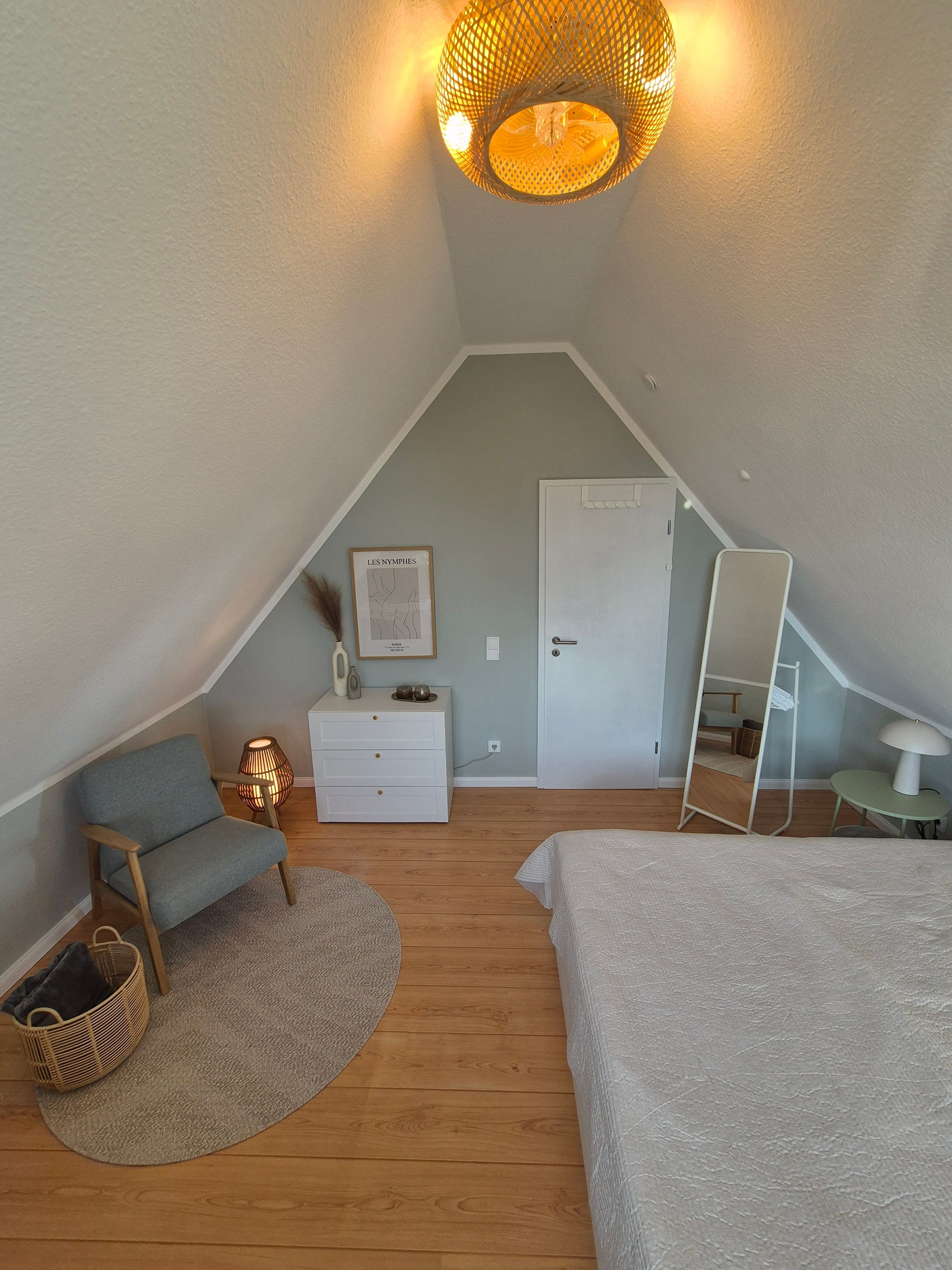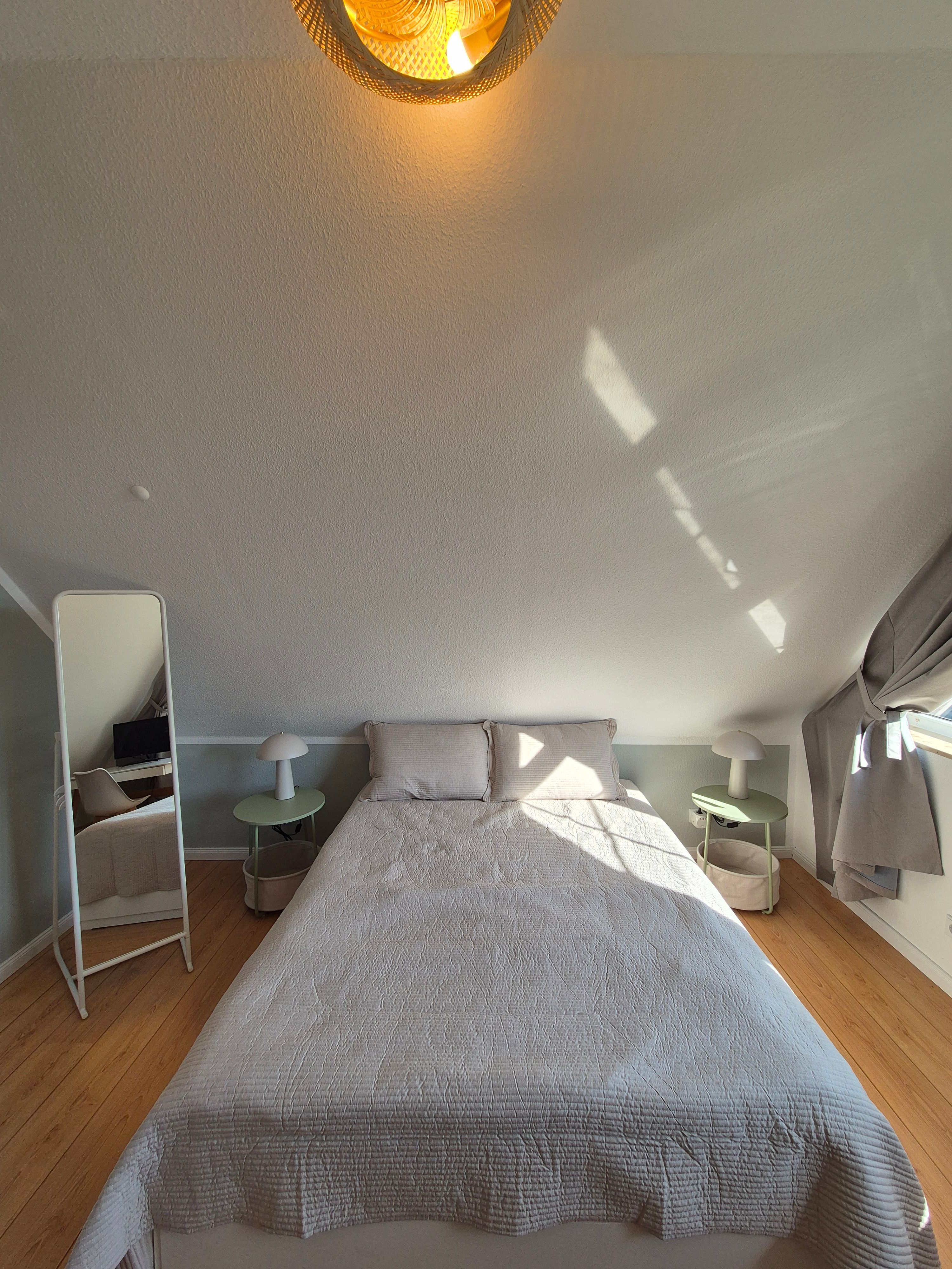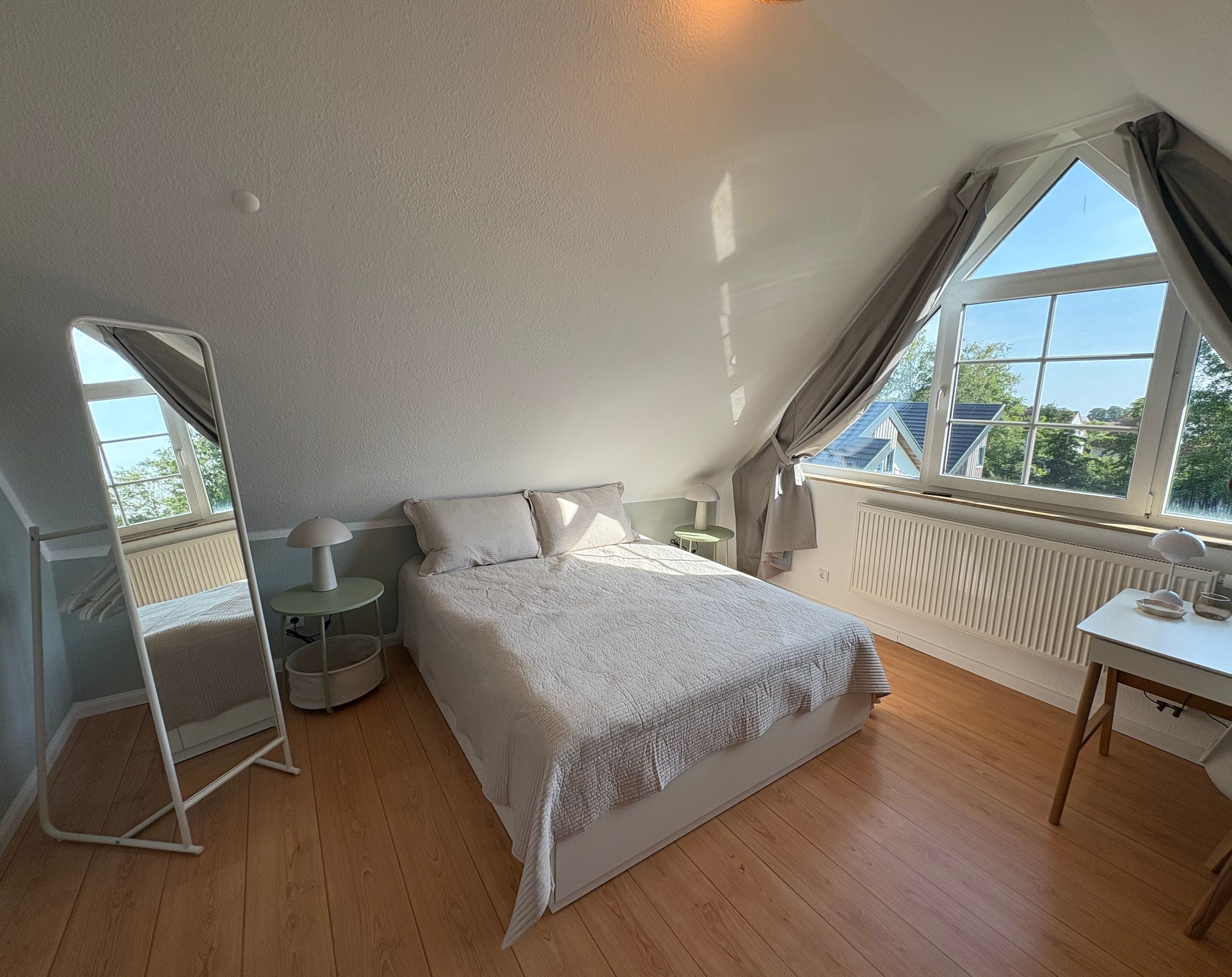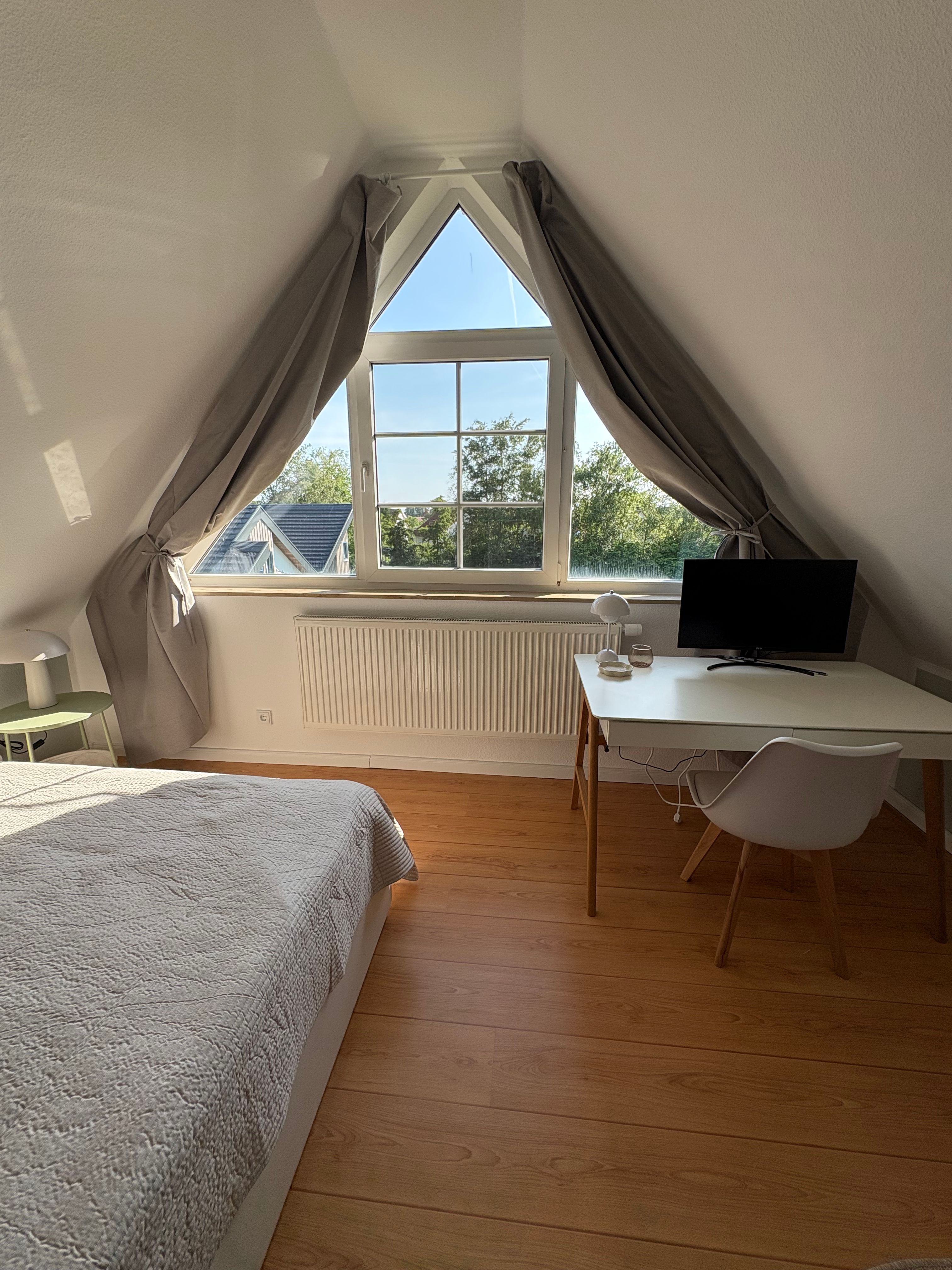 Im geräumigen, durch eine Wendeltreppe erreichbaren Giebelzimmer befindet sich ein Doppelbett (160 x 200 cm), eine gemütliche Leseecke sowie ein Schreibtisch und Smart-Bildschirm, der sich auch für Homeoffice und Workation bestens eignet.