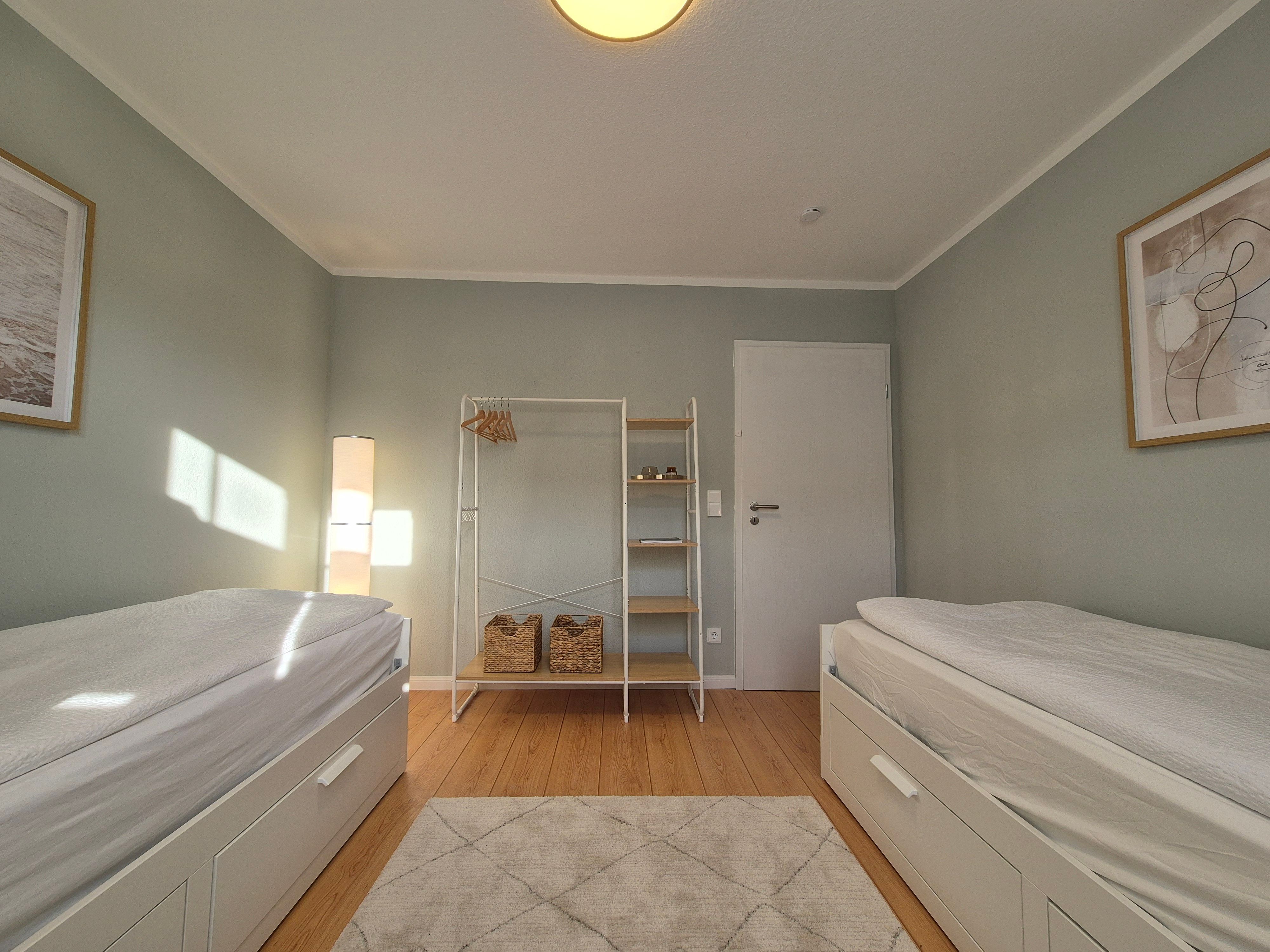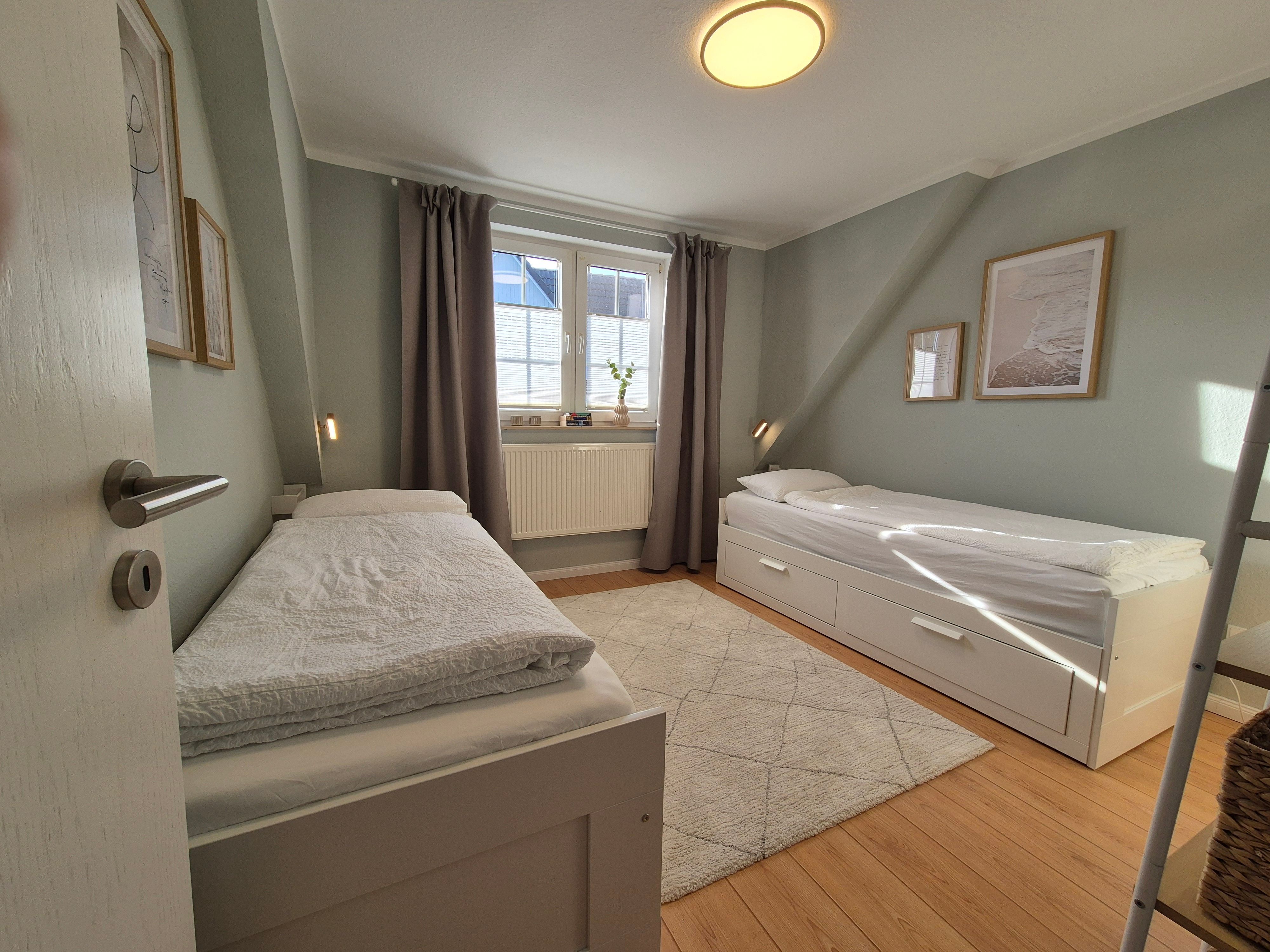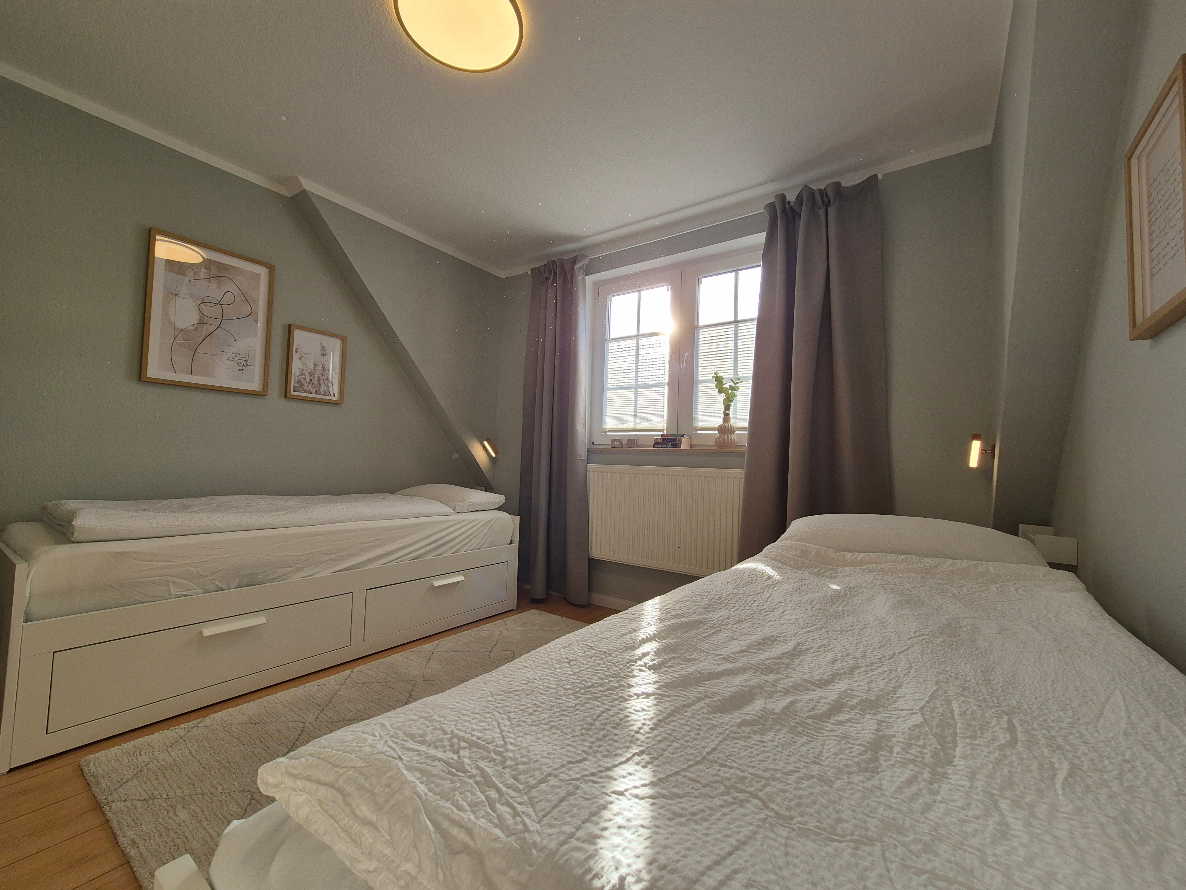 Im Schlafzimmer im 1. OG gibt es zwei Einzelbetten, die für Paare jeweils auch zu einem Doppelbett (160 x 200 cm) umfunktioniert werden können - ganz nach Ihrem Bedarf.