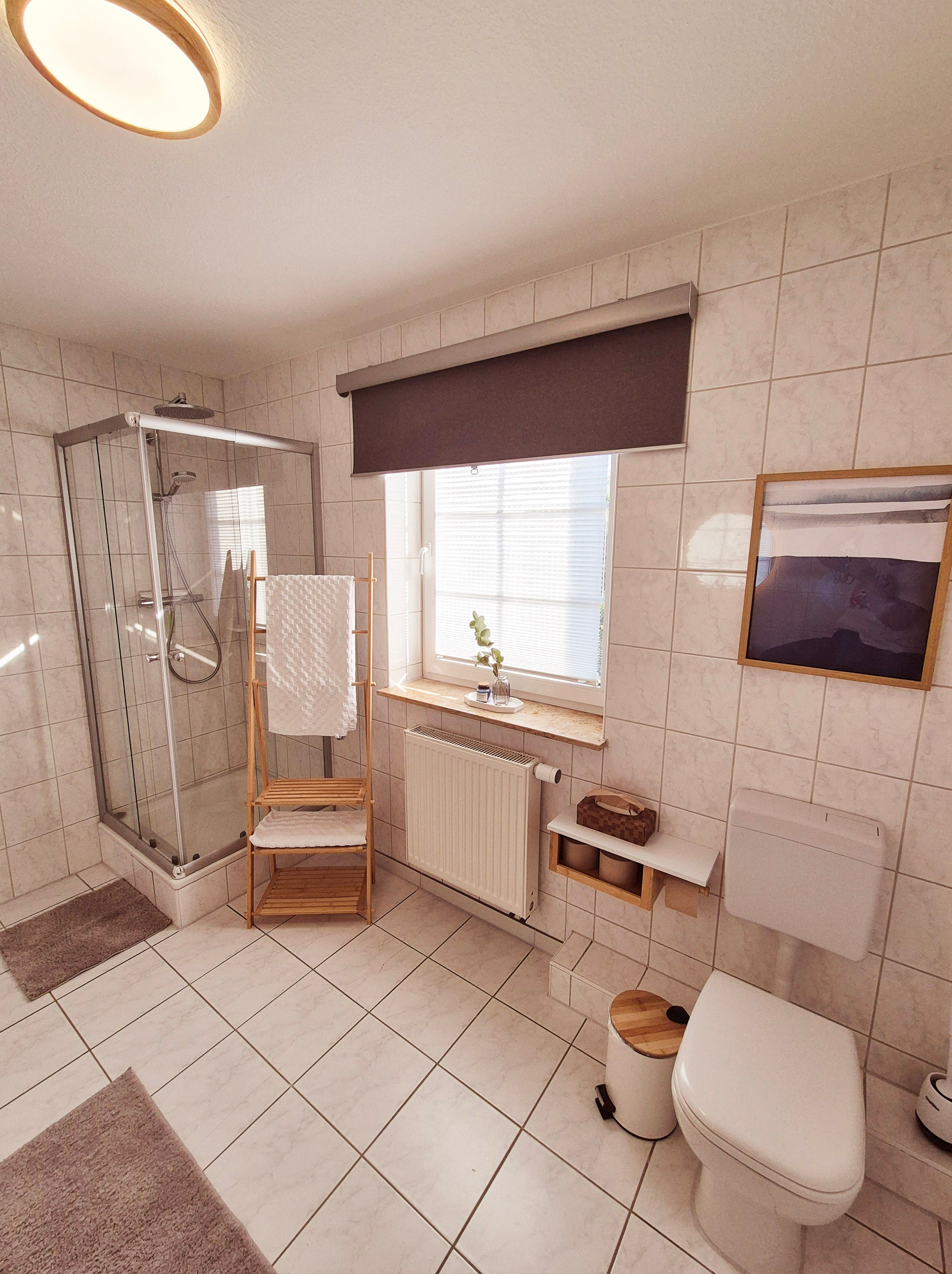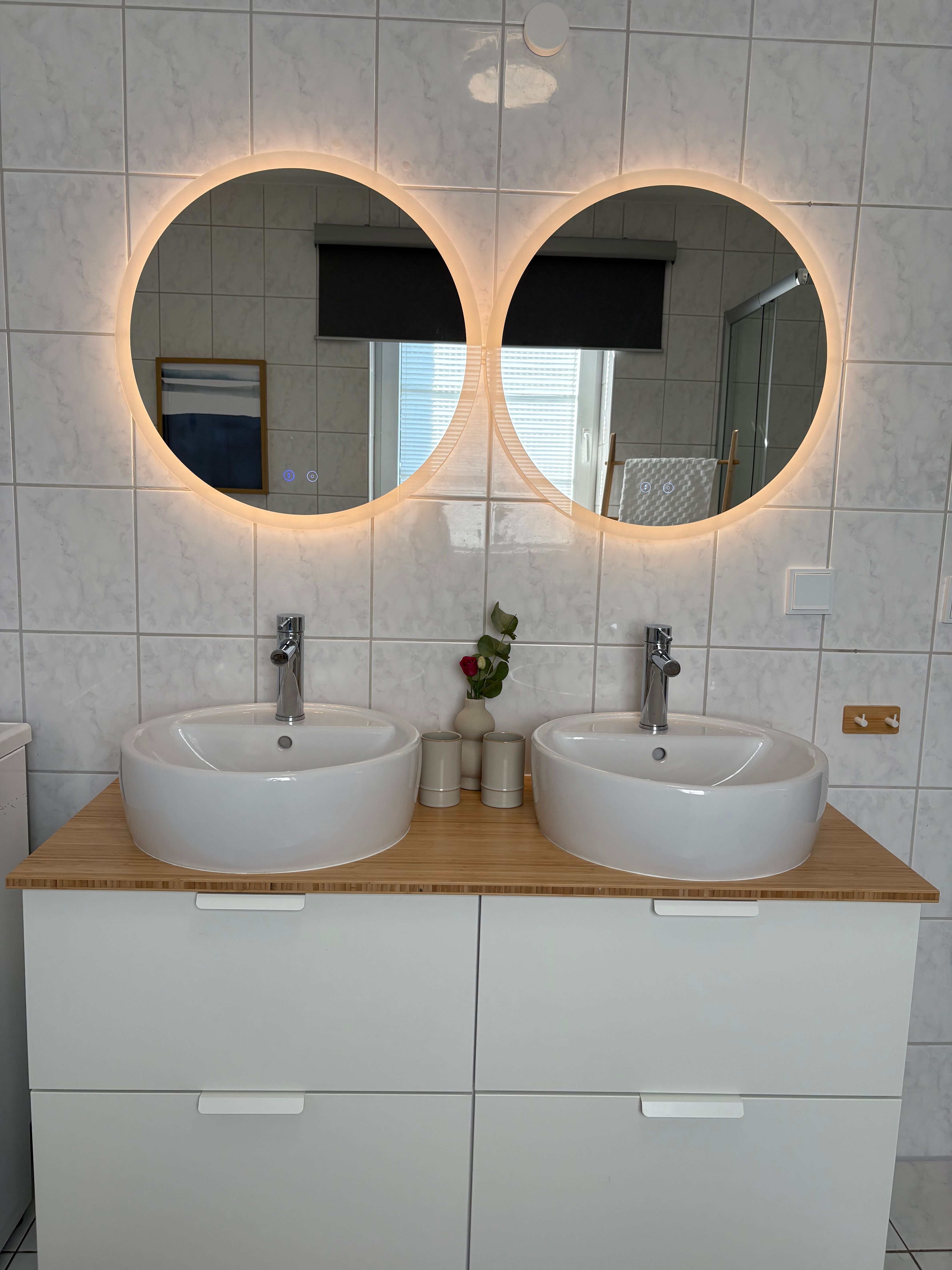 Das großzügige Bad mit Fenster zum Park ist mit zwei Waschbecken, Regendusche und Waschmaschine mit Trocknerfunktion ausgestattet.