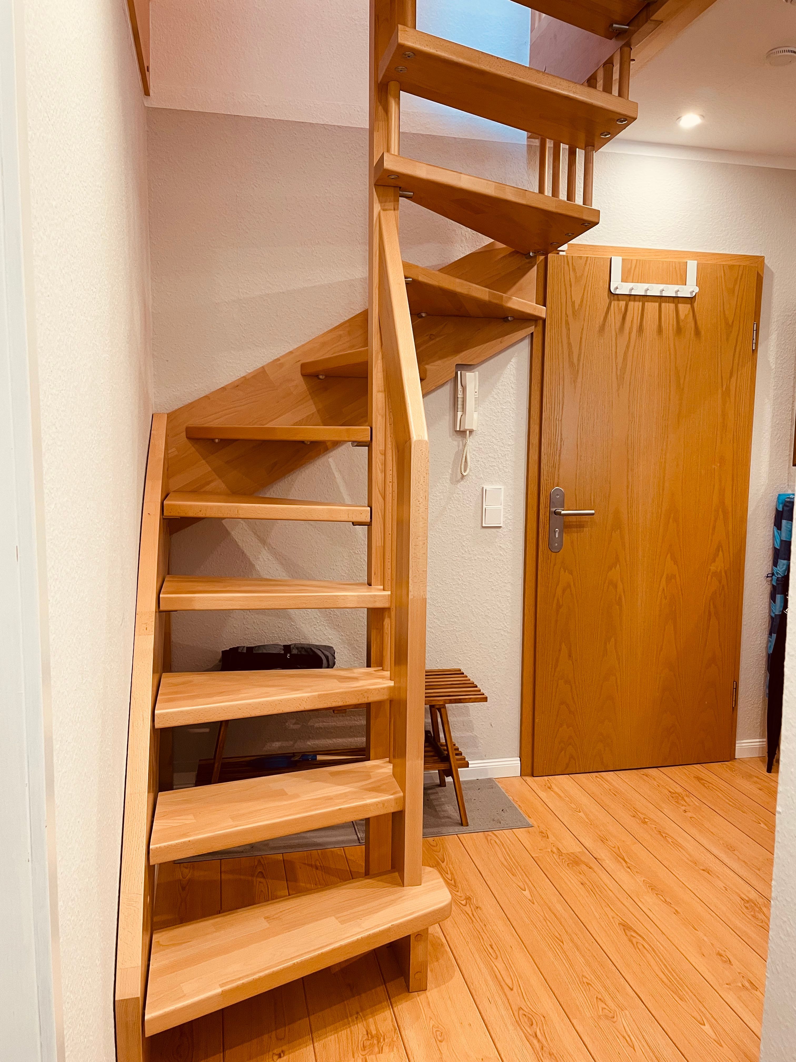 Das obere Stockwerk ist über eine schmale Treppe zu erreichen, deren Benutzung auf eigene Gefahr erfolgt. Der Treppenschutz für Kleinkinder ist nach bestem Wissen und Gewissen installiert, die Benutzung erfolgt auf eigene Gefahr, eine Haftung wird nicht übernommen.