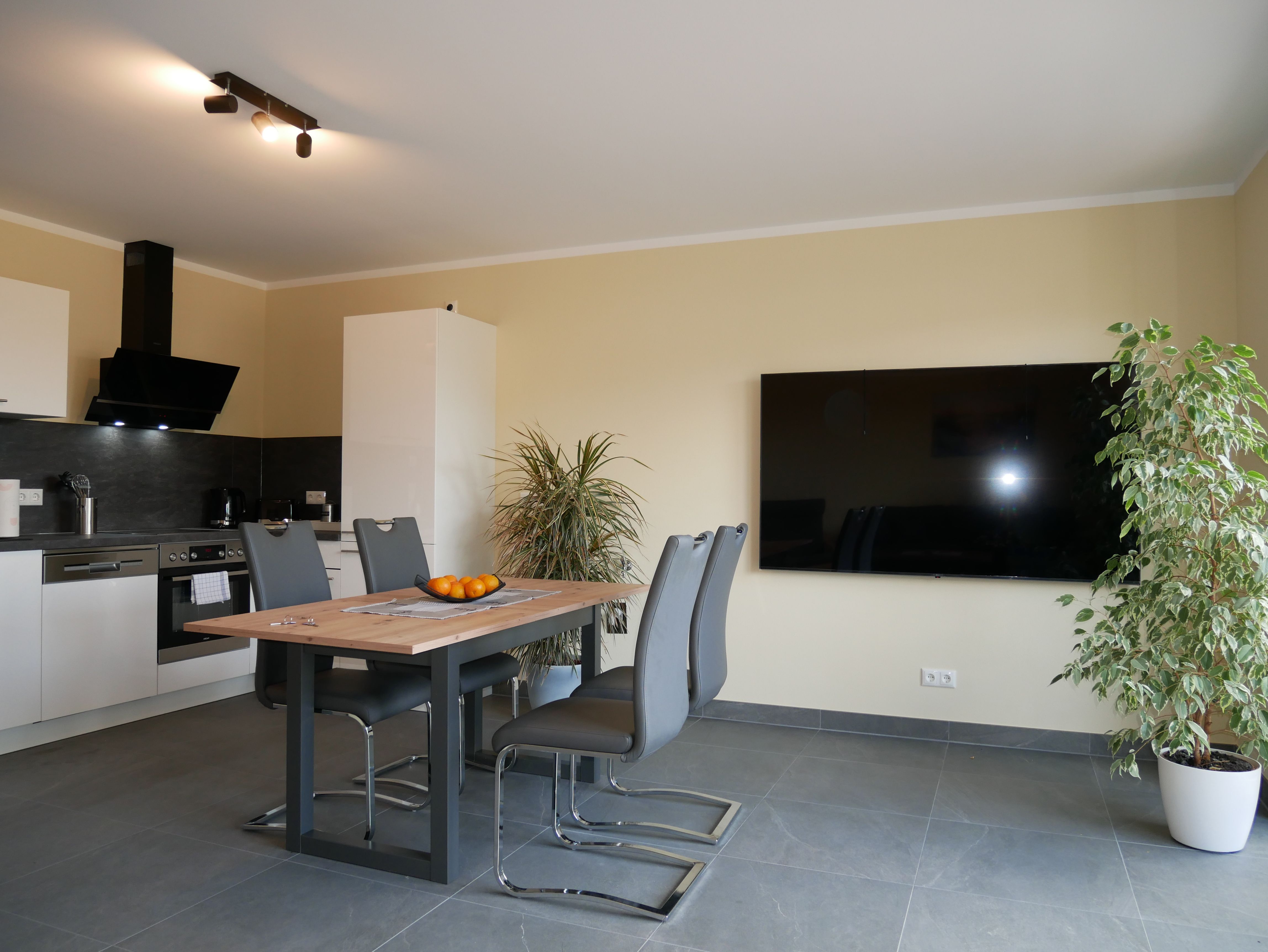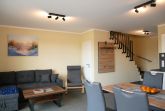 In Ihrer großzügigen, ca. 80m² großen Ferienwohnung im Kelms Küstennest erwartet Sie moderner Komfort auf zwei Etagen ideal für bis zu vier Personen. Im Erdgeschoss befindet sich der offen gestaltete Wohnbereich mit einem gemütlichen Sofa und einem Smart-TV (Flachbildfernseher). Die angrenzende, voll ausgestattete Küche mit Esstisch und Stühlen bietet alles, was Sie für eine entspannte Selbstverpflegung benötigen: Herd, Backofen, Mikrowelle, Kühlschrank mit Tiefkühlfach, Spülmaschine, Toaster, Wasserkocher, Kaffeemaschine und Waschmaschine stehen Ihnen zur Verfügung.