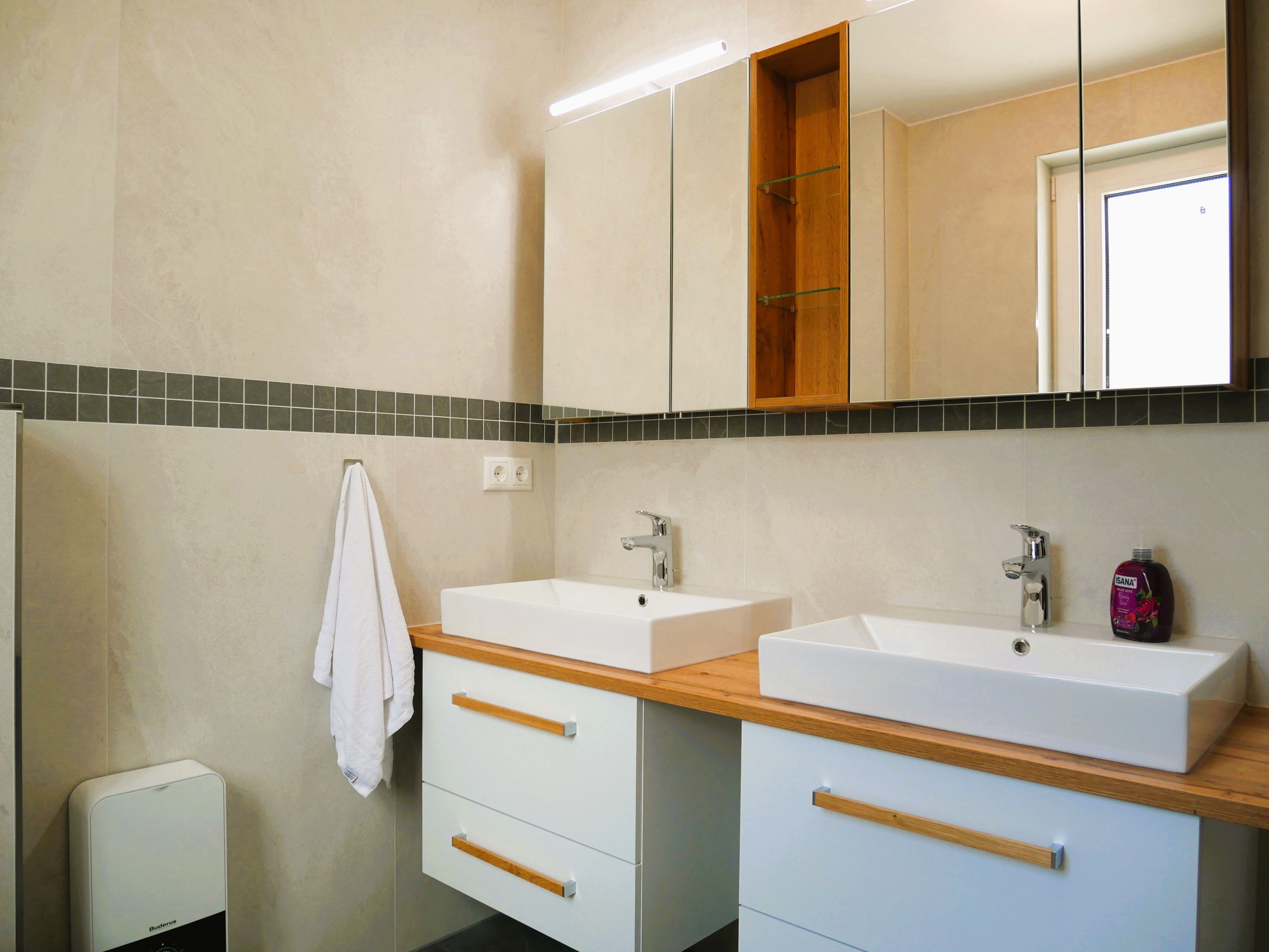 Das helle Tageslichtbad ist mit zwei Waschbecken, einem WC sowie einer ebenerdigen Dusche ausgestattet und verfügt über ein Fenster zur natürlichen Belüftung.
