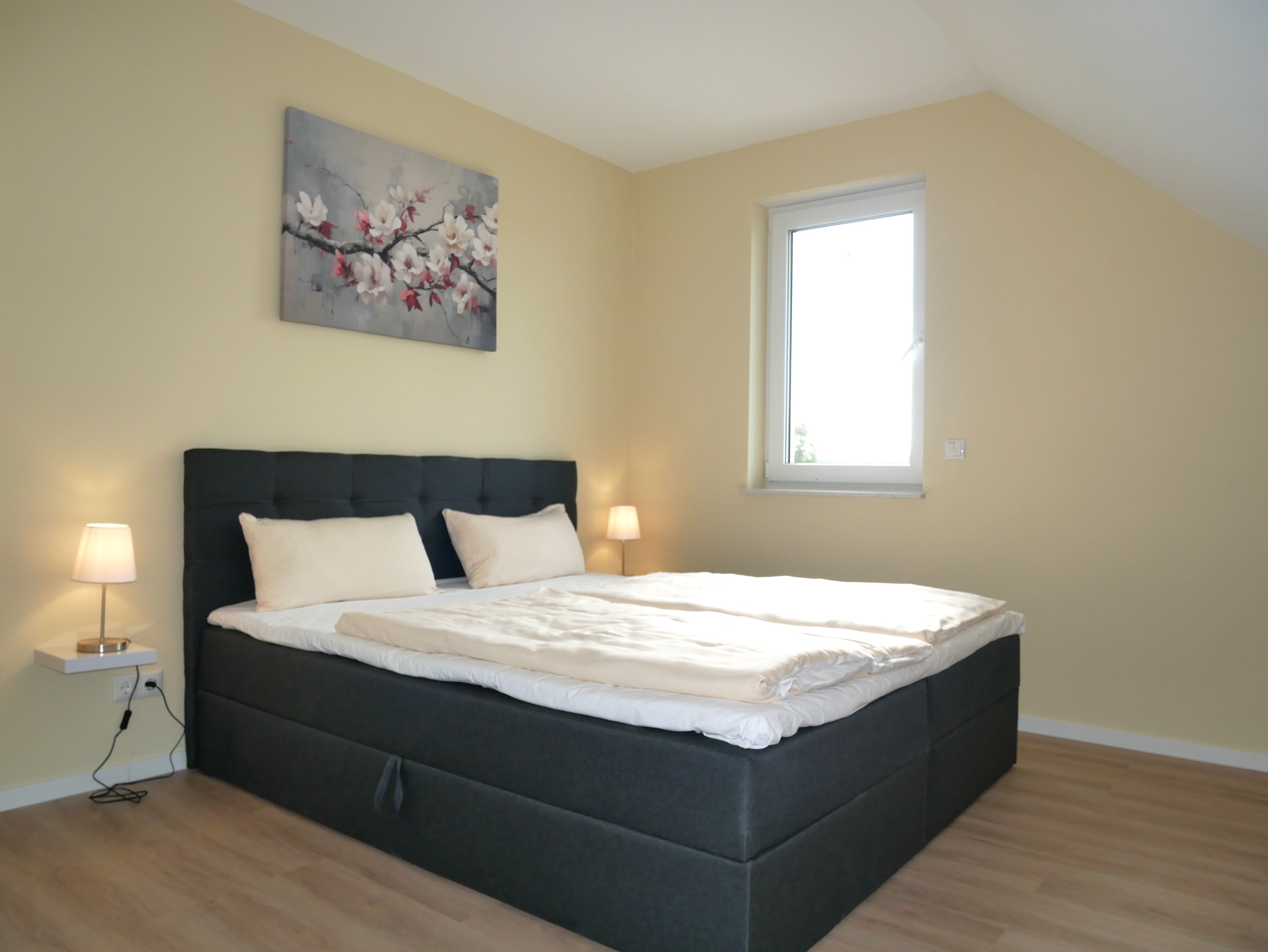Über eine Treppe mit 15 Stufen gelangen Sie in das Obergeschoss, wo zwei separate Schlafzimmer auf Sie warten: Eines ist mit einem gemütlichen Doppelbett und einem geräumigen Kleiderschrank eingerichtet, das zweite verfügt über zwei Einzelbetten und ebenfalls einen Kleiderschrank. In beiden Schlafräumen sorgen Verdunklungsmöglichkeiten und Insektenschutz an den Fenstern für angenehme Ruhe und erholsamen Schlaf.