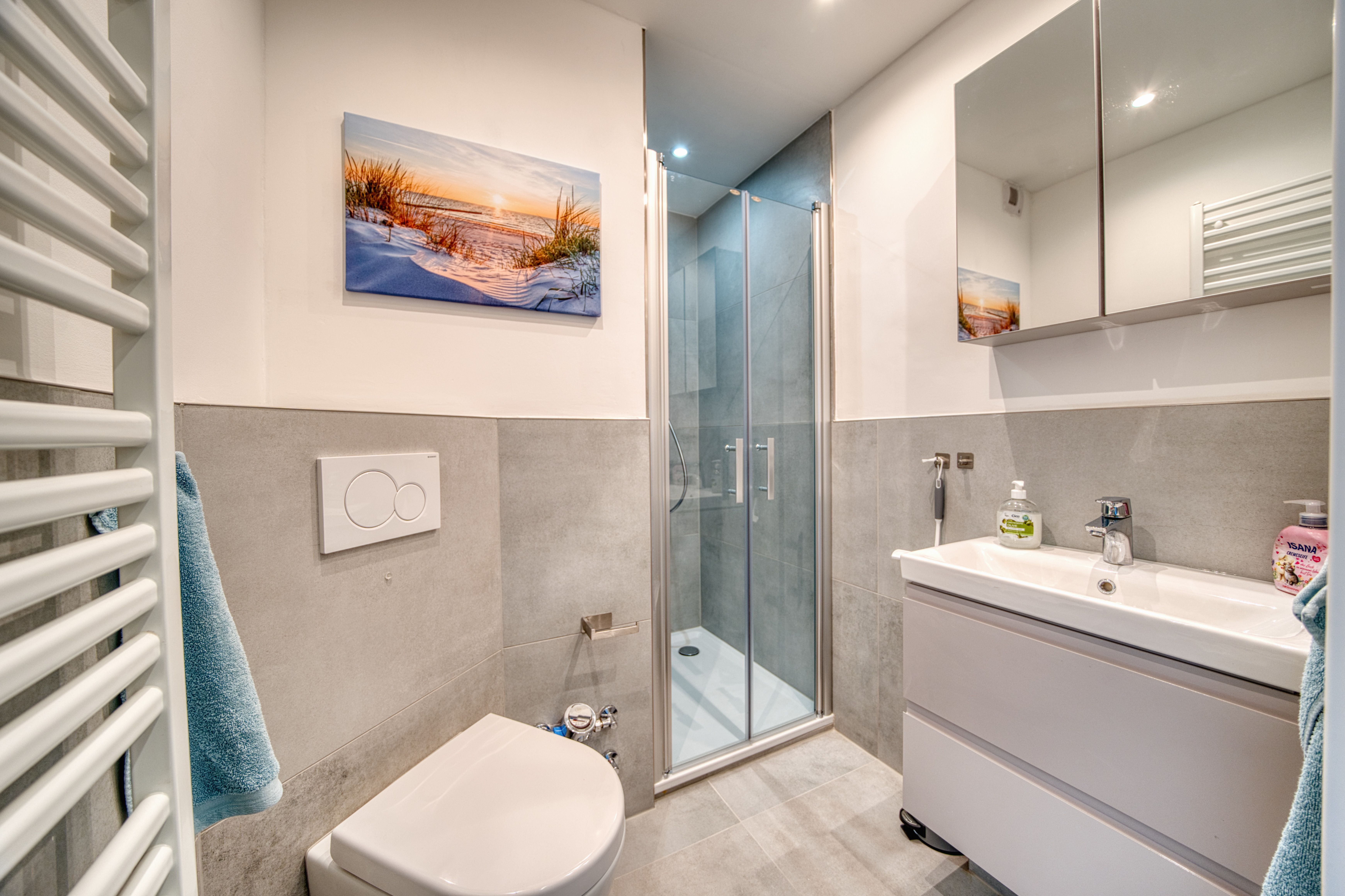 Modernes Badezimmer mit Duschkabine mit niedrigem Einstieg, Handtuchtrockner und WC