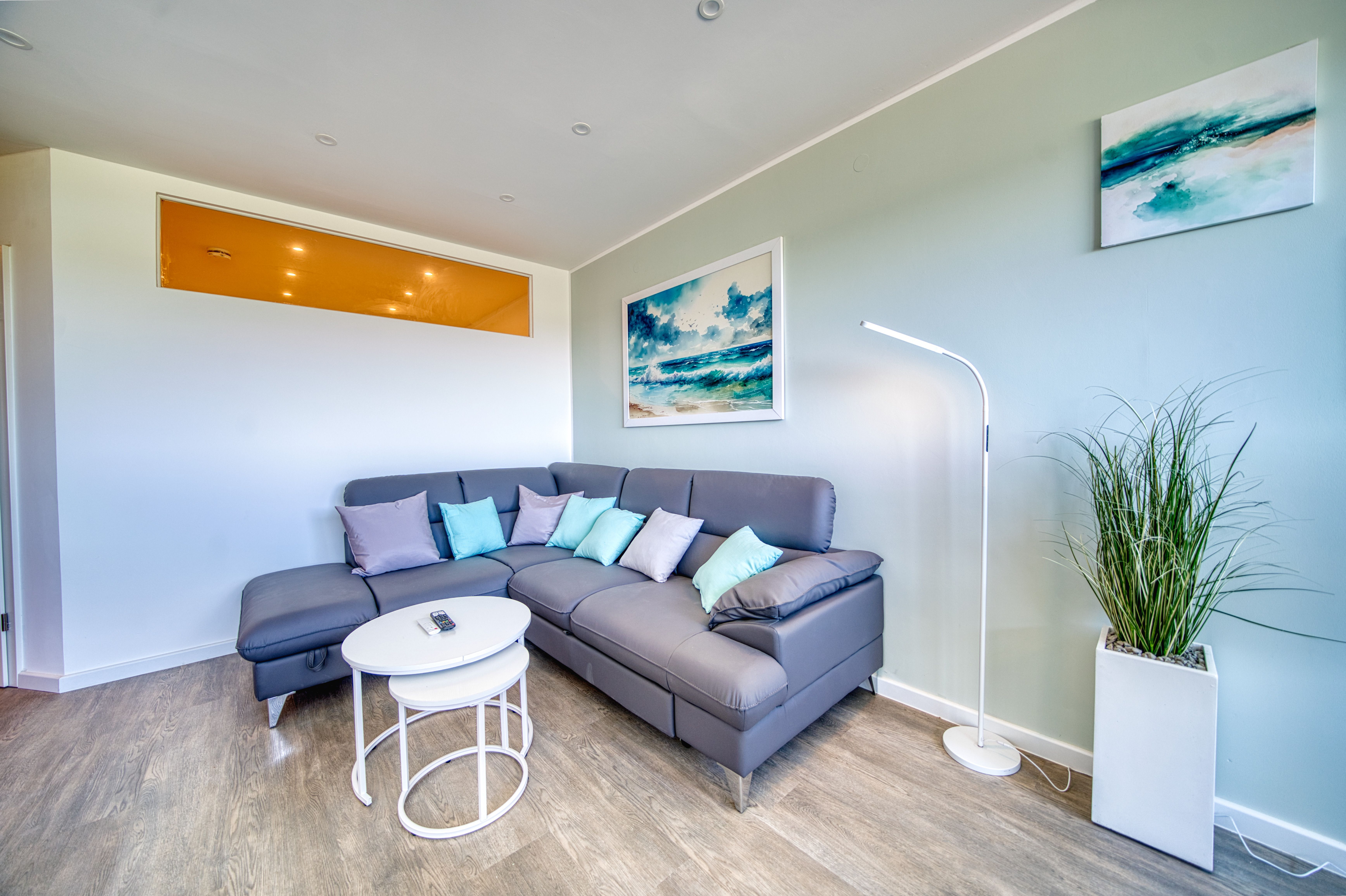Heller Wohnbereich mit großem Ecksofa, Flachbild-TV und Esstisch mit Ostseeblick