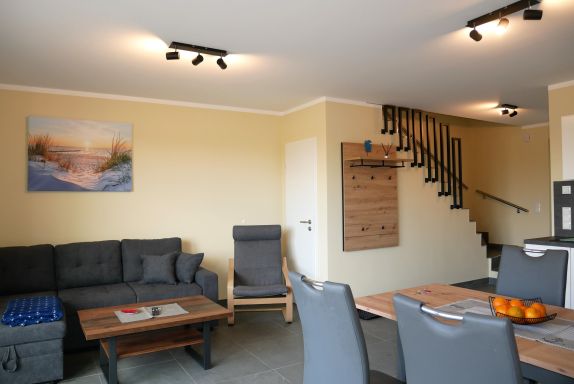In Ihrer großzügigen, ca. 80m² großen Ferienwohnung im Kelms Küstennest erwartet Sie moderner Komfort auf zwei Etagen ideal für bis zu vier Personen. Im Erdgeschoss befindet sich der offen gestaltete Wohnbereich mit einem gemütlichen Sofa und einem Smart-TV (Flachbildfernseher). Die angrenzende, voll ausgestattete Küche mit Esstisch und Stühlen bietet alles, was Sie für eine entspannte Selbstverpflegung benötigen: Herd, Backofen, Mikrowelle, Kühlschrank mit Tiefkühlfach, Spülmaschine, Toaster, Wasserkocher, Kaffeemaschine und Waschmaschine stehen Ihnen zur Verfügung.