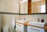Das helle Tageslichtbad ist mit zwei Waschbecken, einem WC sowie einer ebenerdigen Dusche ausgestattet und verfügt über ein Fenster zur natürlichen Belüftung.