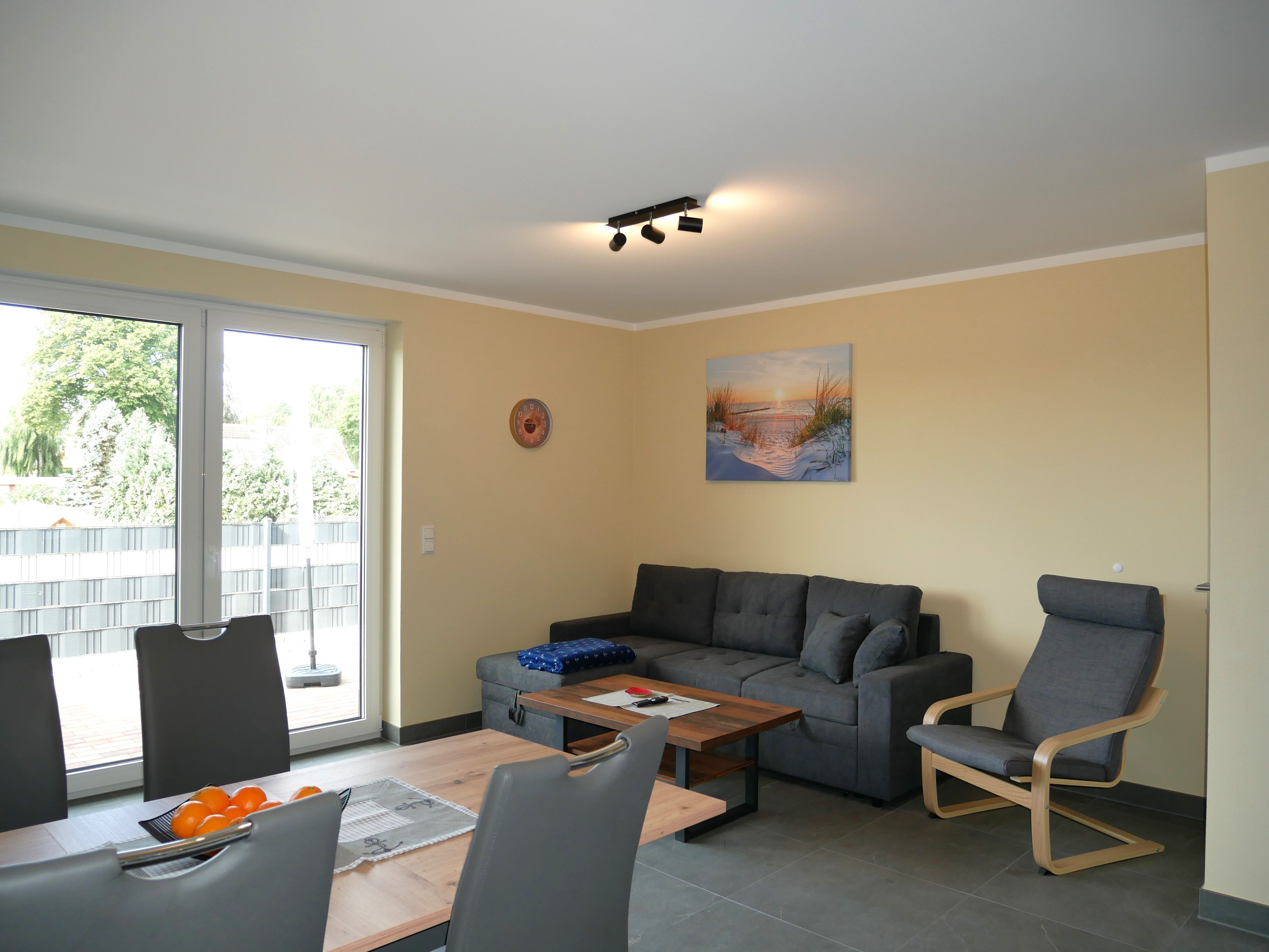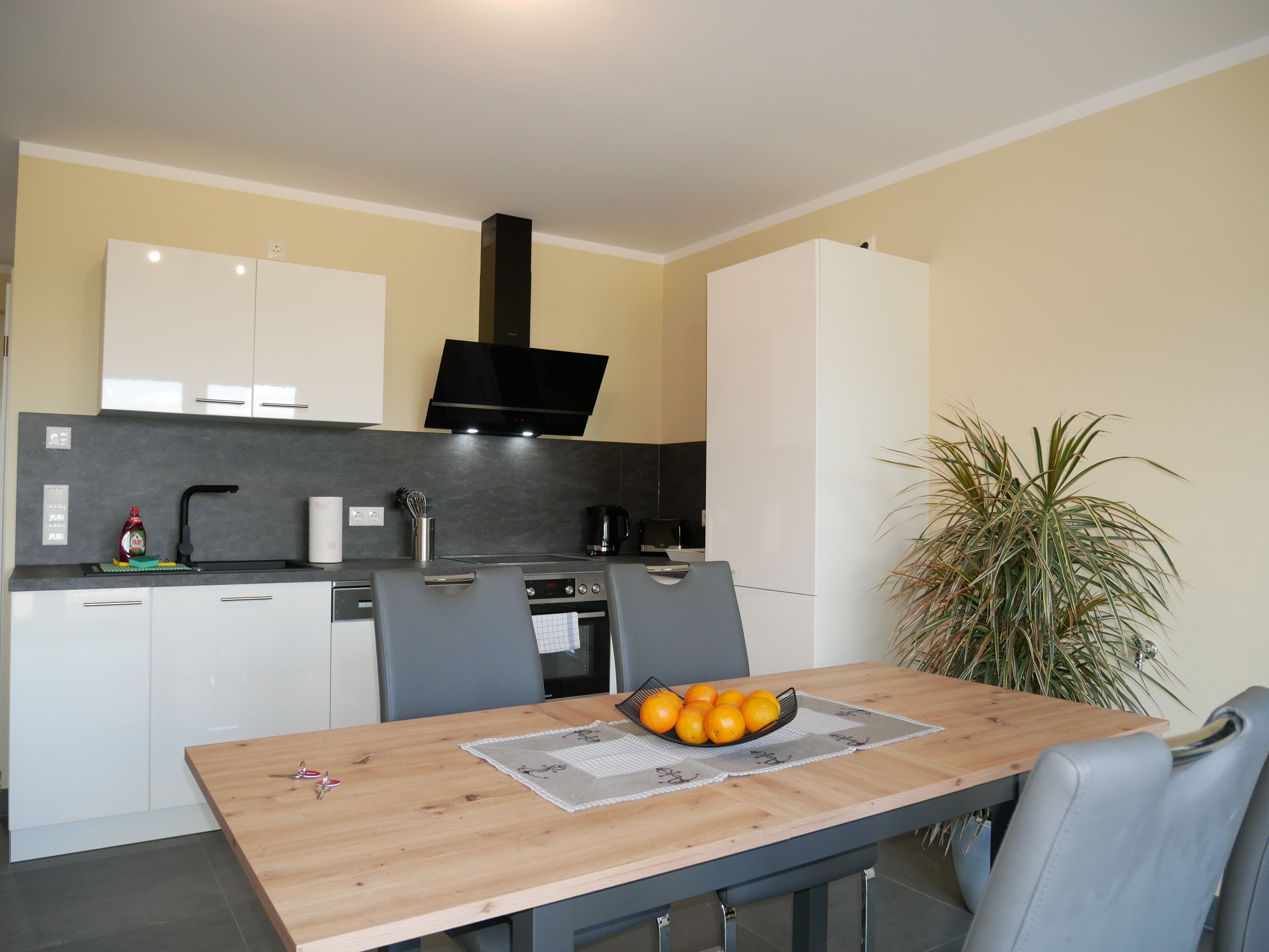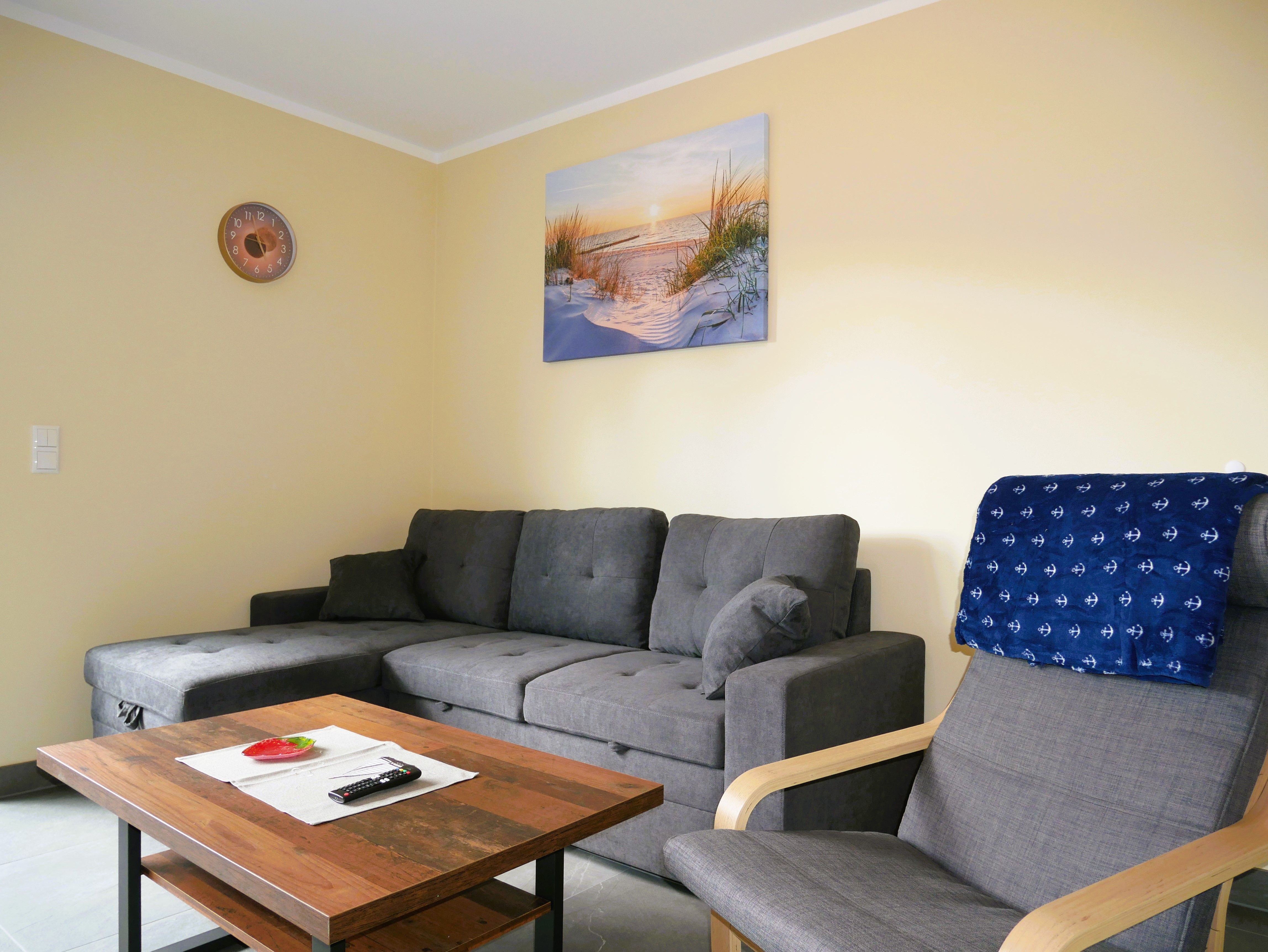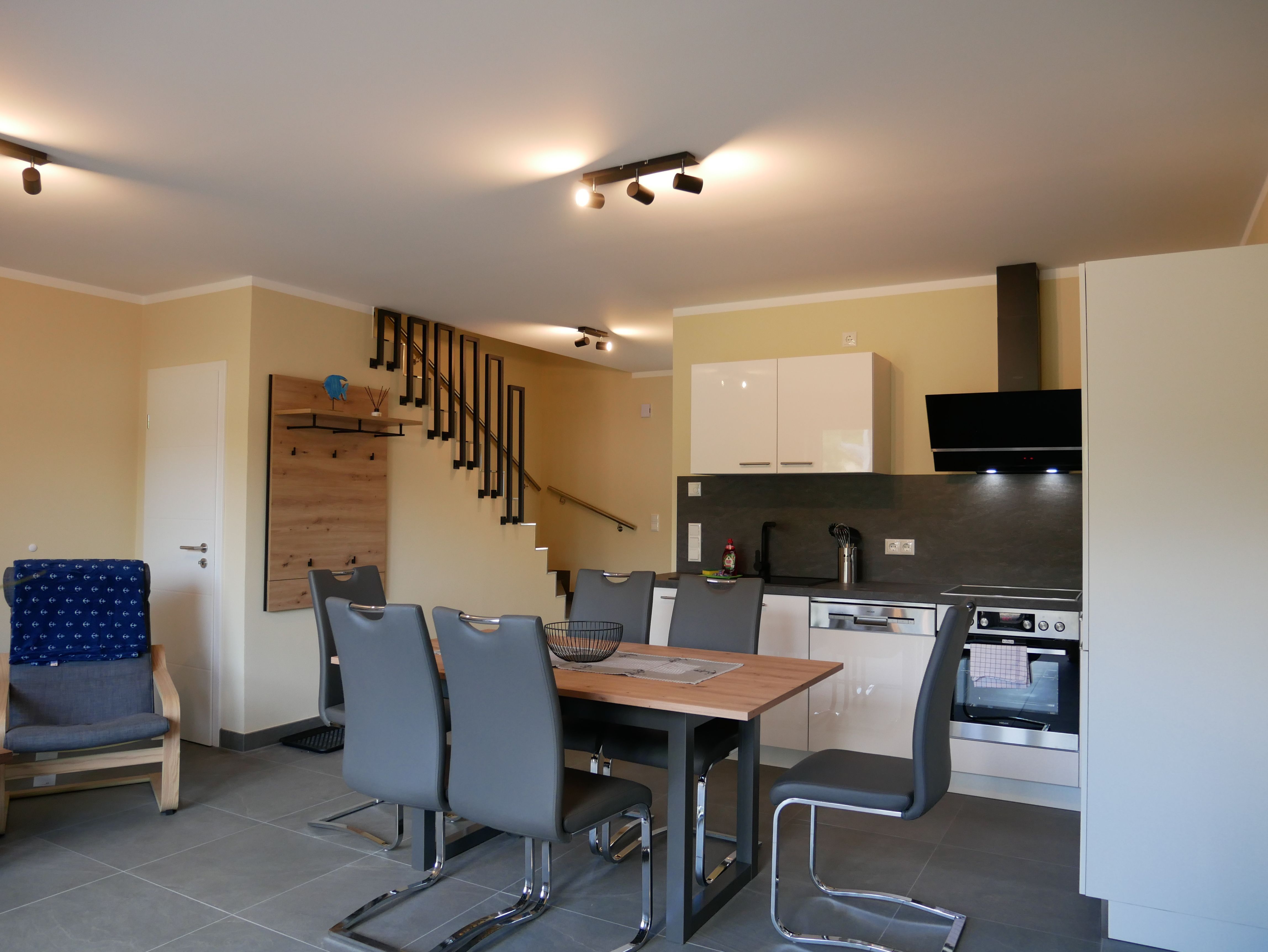 In Ihrer großzügigen, ca. 80m² großen Ferienwohnung im Kelms Küstennest erwartet Sie moderner Komfort auf zwei Etagen ideal für bis zu vier Personen. Im Erdgeschoss befindet sich der offen gestaltete Wohnbereich mit einem gemütlichen Sofa und einem Smart-TV (Flachbildfernseher). Die angrenzende, voll ausgestattete Küche mit Esstisch und Stühlen bietet alles, was Sie für eine entspannte Selbstverpflegung benötigen: Herd, Backofen, Mikrowelle, Kühlschrank mit Tiefkühlfach, Spülmaschine, Toaster, Wasserkocher, Kaffeemaschine und Waschmaschine stehen Ihnen zur Verfügung.