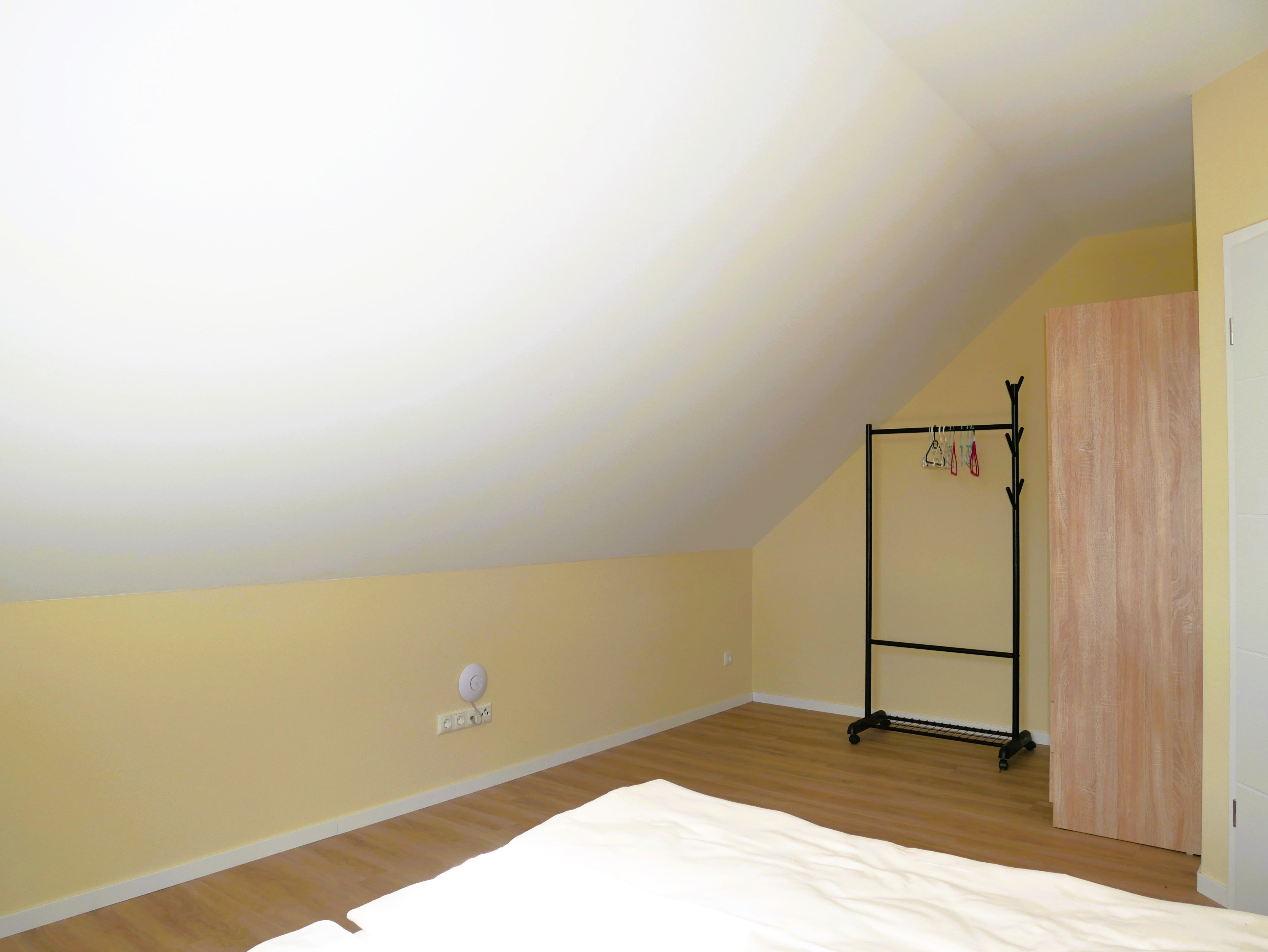 Über eine Treppe mit 15 Stufen gelangen Sie in das Obergeschoss, wo zwei separate Schlafzimmer auf Sie warten: Eines ist mit einem gemütlichen Doppelbett und einem geräumigen Kleiderschrank eingerichtet, das zweite verfügt über zwei Einzelbetten und ebenfalls einen Kleiderschrank. In beiden Schlafräumen sorgen Verdunklungsmöglichkeiten und Insektenschutz an den Fenstern für angenehme Ruhe und erholsamen Schlaf.