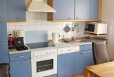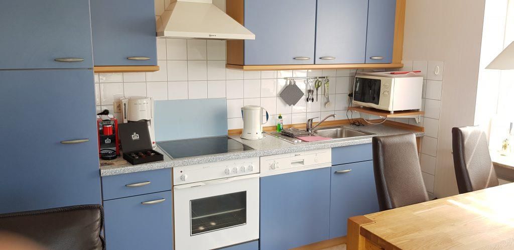 Wohn-Essraum mit zwei Sofas, SAT-TV, offene Küche mit Ceranfeld ,Backofen, Mikrowelle, Kaffeefiltermaschine (Kapselmaschine gehört nicht zur Ausstattung), Kühlschrank mit Gefrierfach, Geschirrspülmaschine, Essbereich.