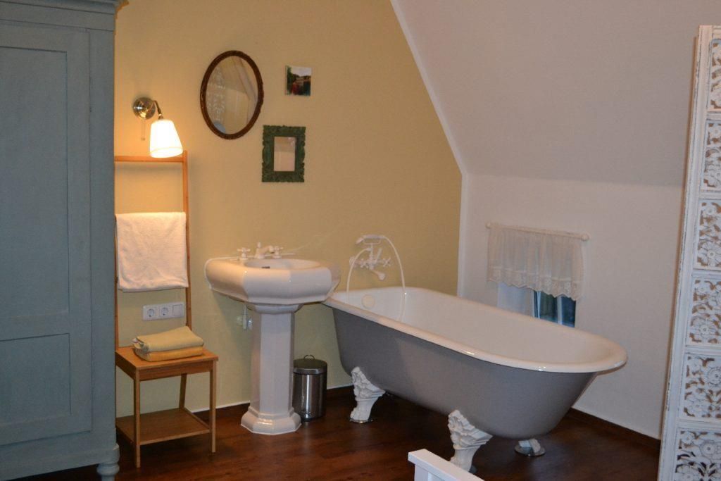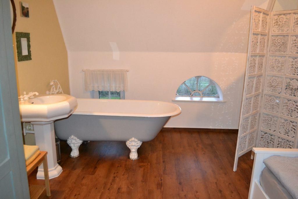 Schlafzimmer mit Doppelbett, freistehende romantische Badewanne