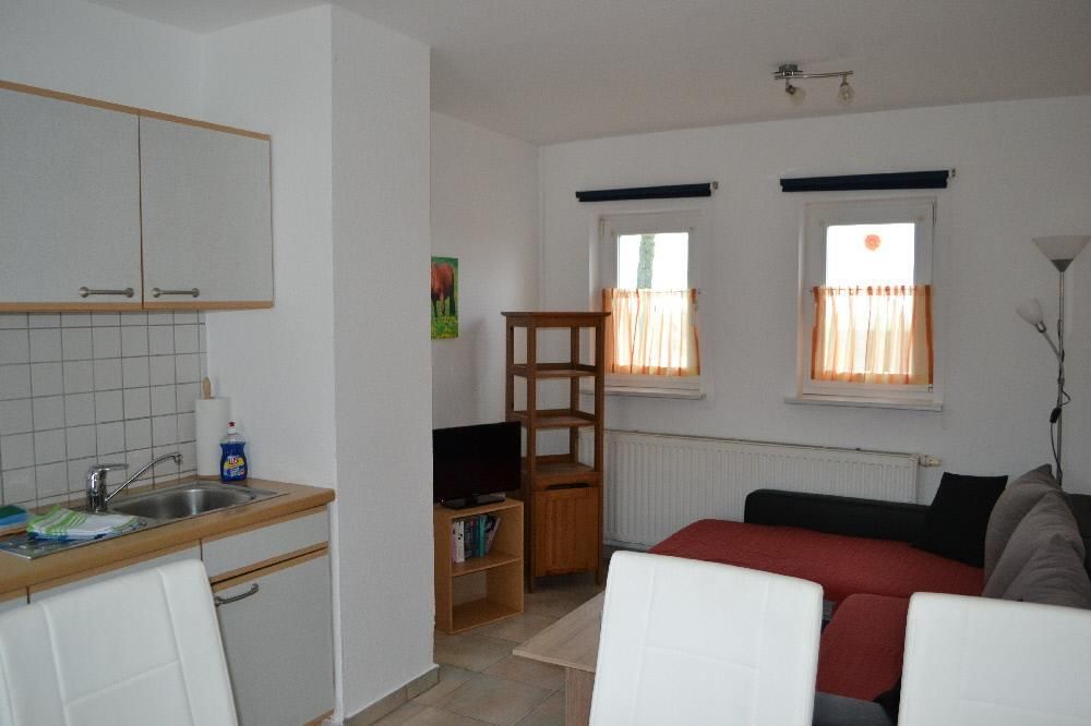 Wohnraum mit Sofa, SAT-TV, Essbereich, Küchenzeile